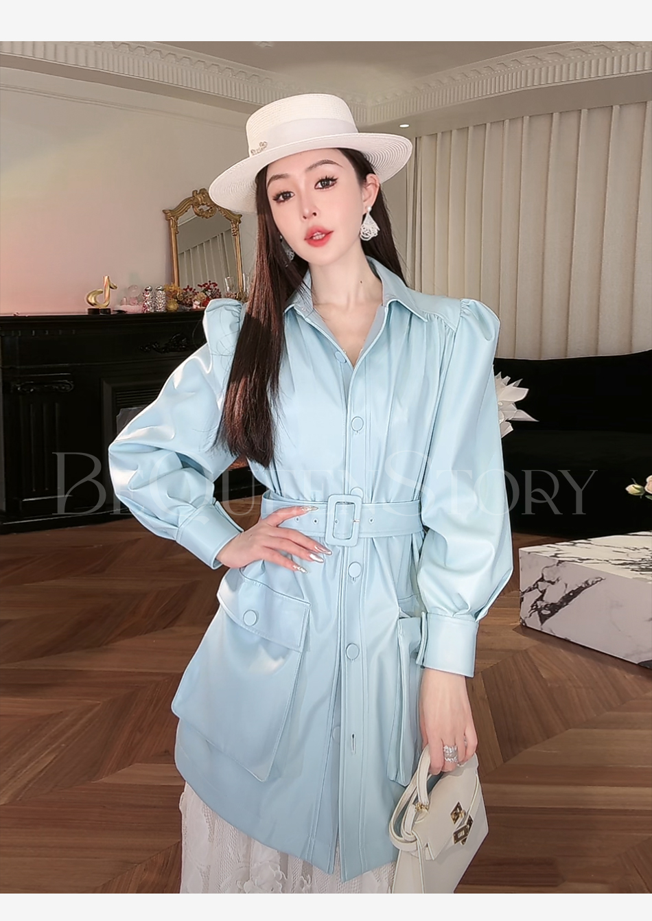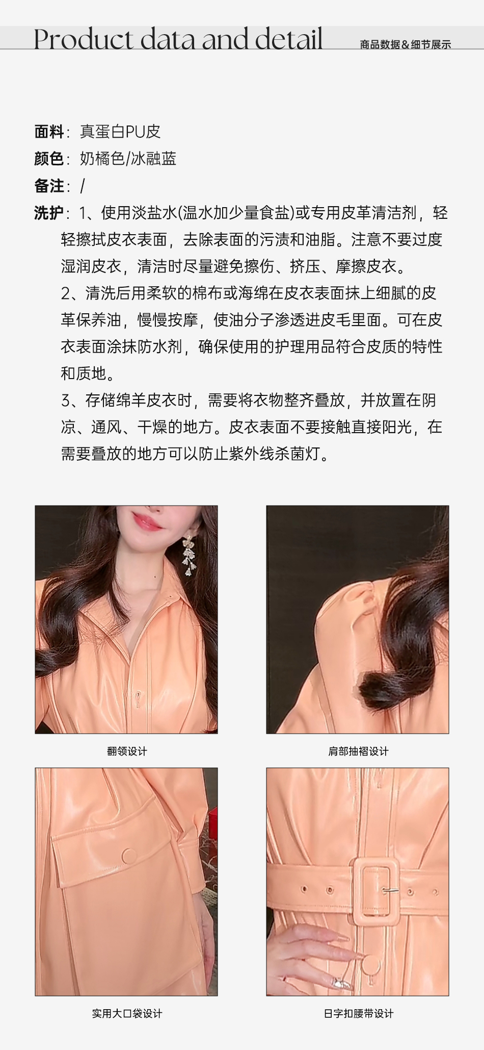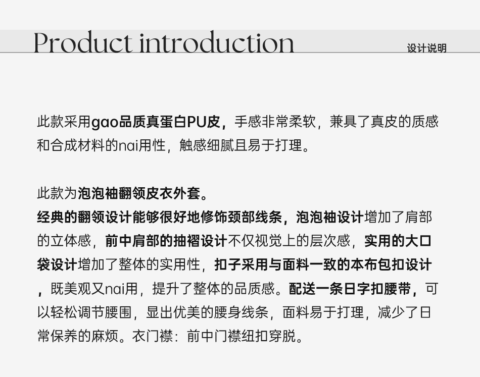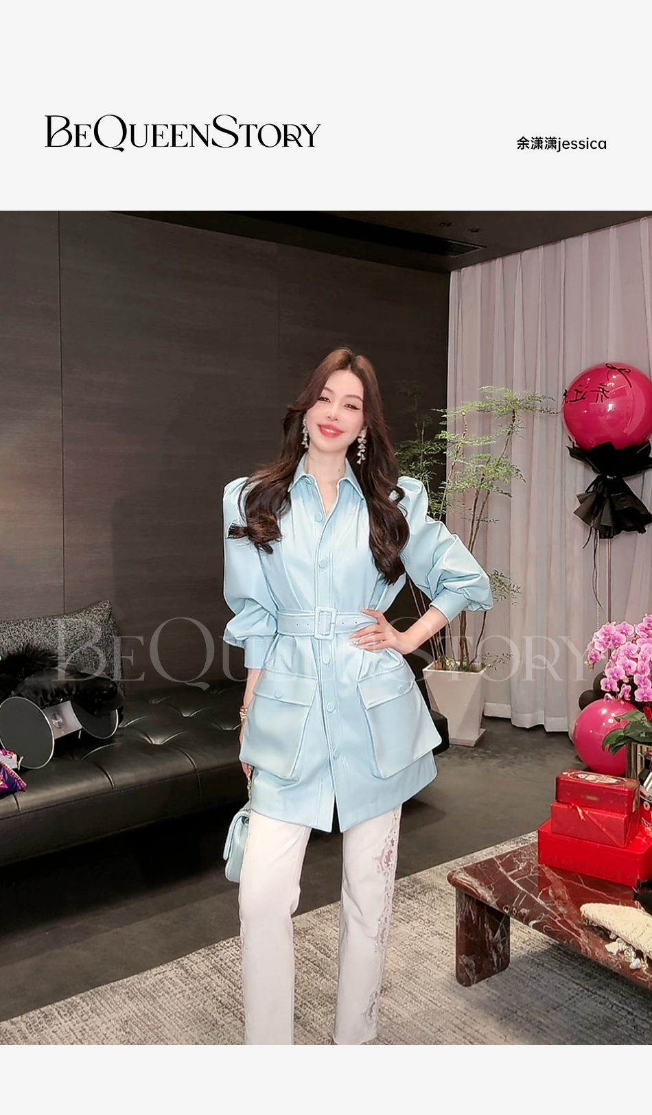 余潇潇【机车玫瑰】2025春装新款时尚PU蛋白皮中长泡泡袖皮衣外套