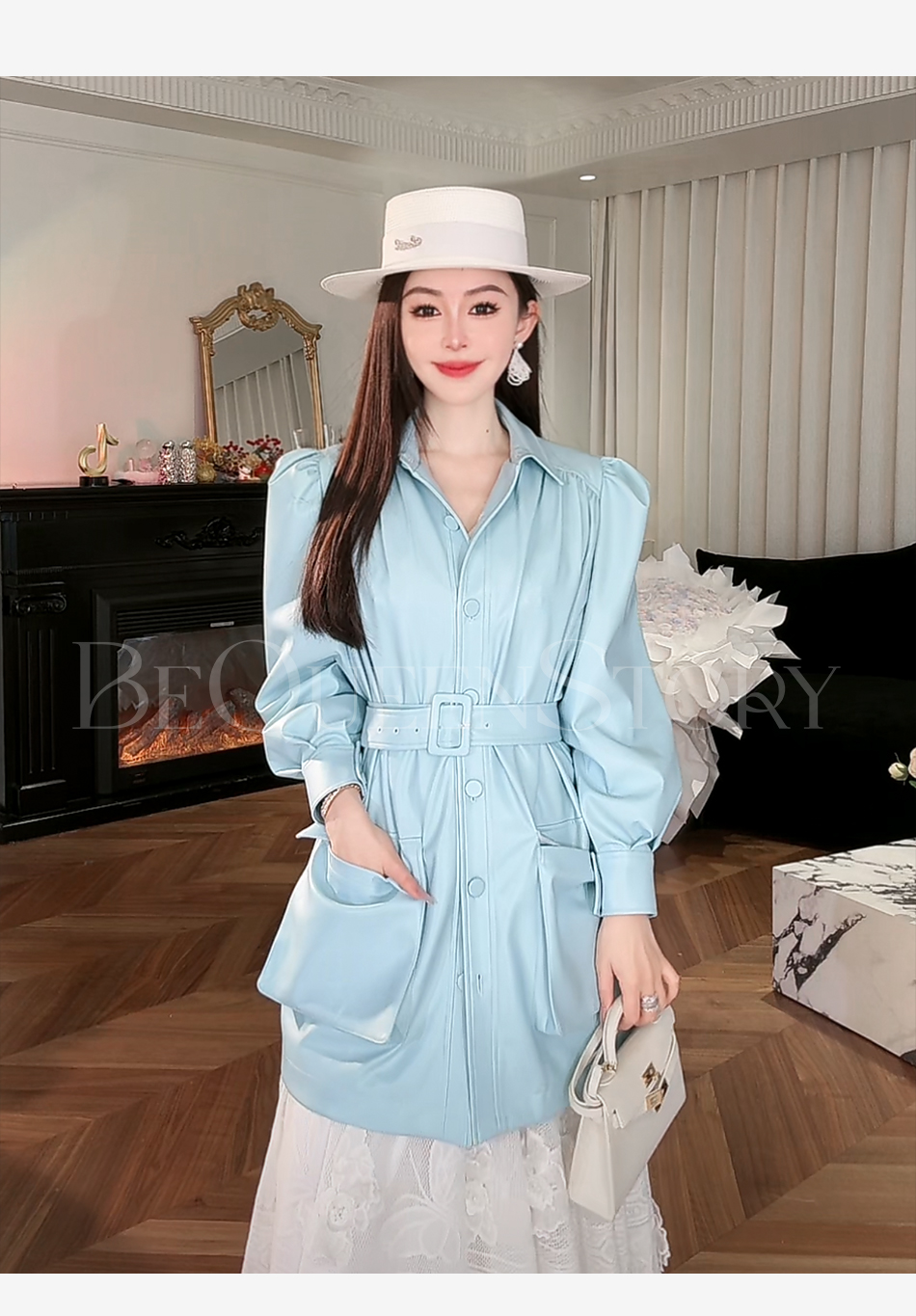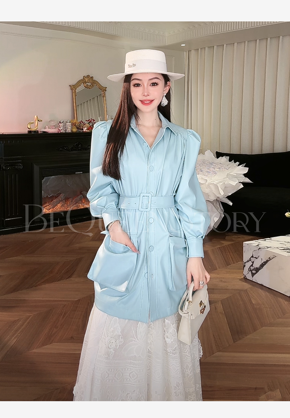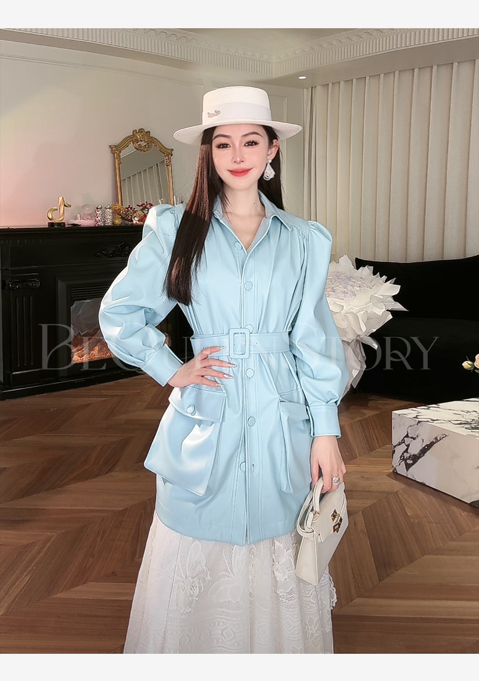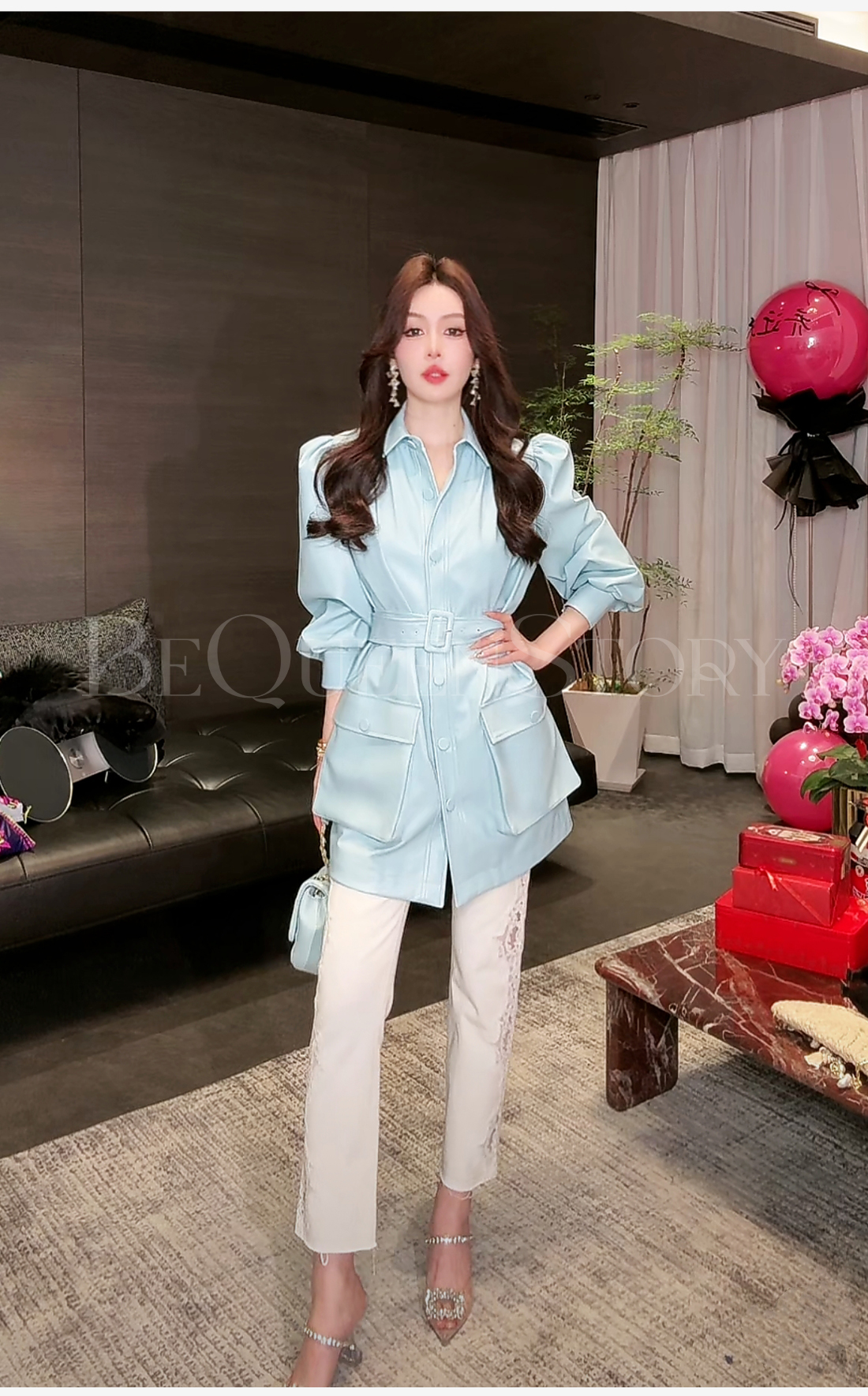 余潇潇【机车玫瑰】2025春装新款时尚PU蛋白皮中长泡泡袖皮衣外套