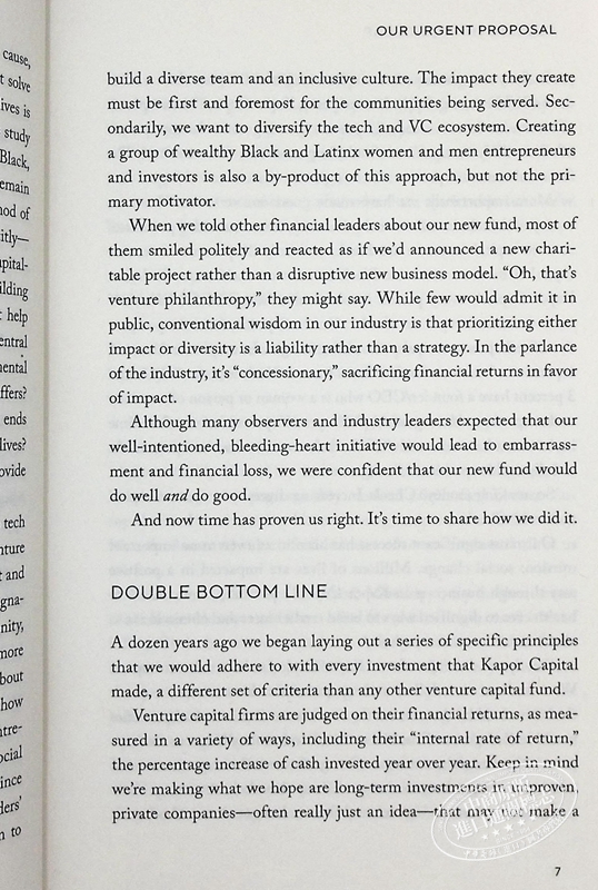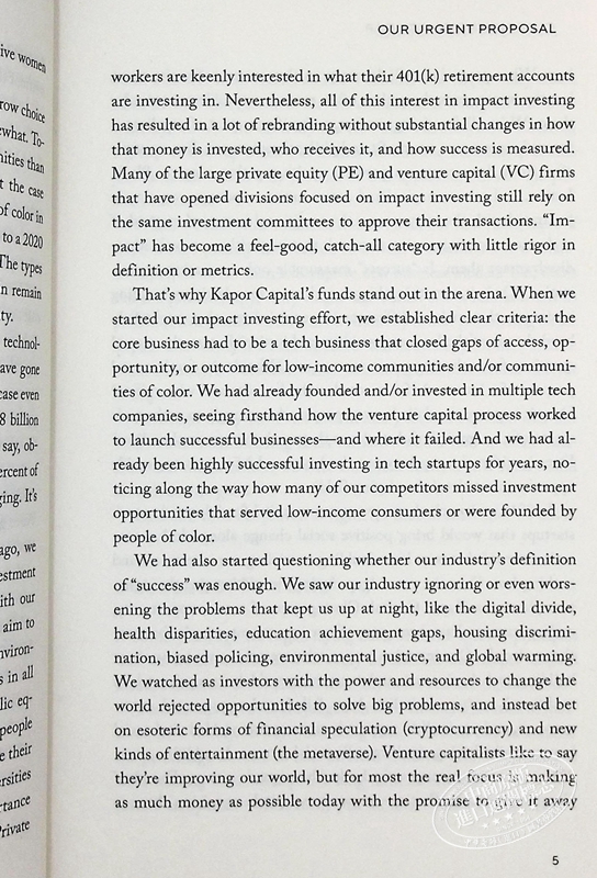 像每个风险投资公司一样,他们也经历过高调的失败和完全的损失。但卡波尔资本的投资原则创造了一个由黑人和拉丁裔企业家、首席执行官和投资者组成的惊人的新生态系统,他们都在设计创新、有效的解决方案,以解决困扰美国许多贫穷社区的有害问题。在《缩小公平差距》中,弗莱达和米奇分享了他们的核心信念,即所有公司都须产生积极的影响,企业家在生活中克服的障碍比他们就读的学校或从朋友和家人那里筹集的投资金额更能预测长期成功。