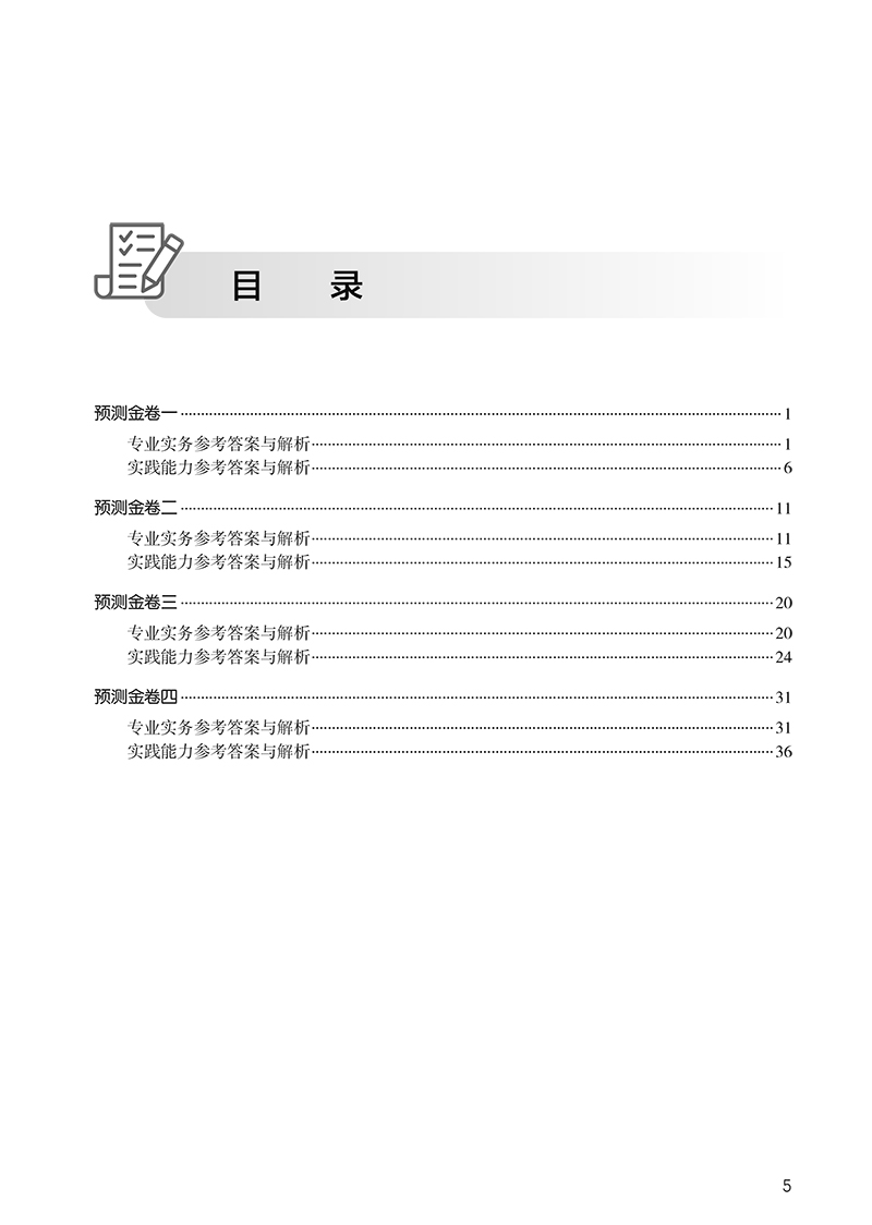 预测金卷一 / 1 专业实务参考答案与解析 / 1 实践能力参考答案与解析 / 6 预测金卷二 / 11 专业实务参考答案与解析 / 11 实践能力参考答案与解析 / 15 预测金卷三 / 20 专业实务参考答案与解析 / 20 实践能力参考答案与解析 / 24 预测金卷四 / 31 专业实务参考答案与解析 / 31 实践能力参考答案与解析 / 36