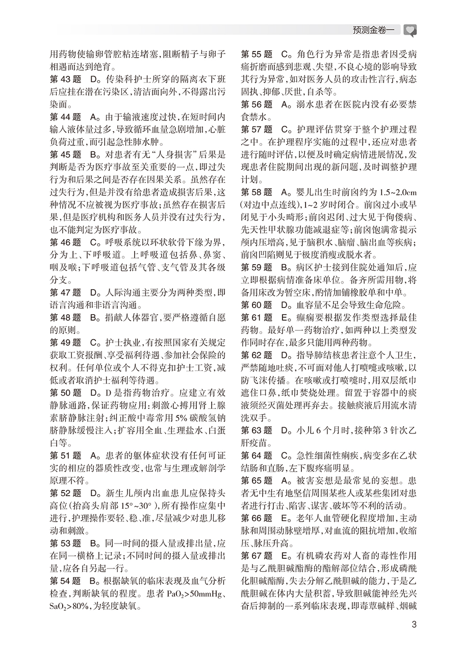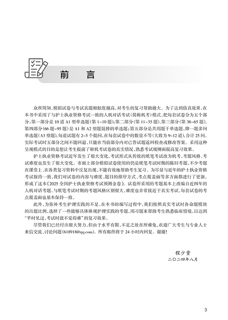 本书由人卫社护理学专业讲师团金牌讲师程少贵教授主编,本书共6卷本,每本2套习题,共12套试题(含试题解析),供考生临床前模考使用。同时主编还在多年真题研究的基础上,对护考试题进行了预测。主编在对多年护考真题进行分析研究的基础上,对护考试题进行精准预测。通过对每年的医护考题进行分析,把握医护考命题方向和规律。能够对医护考各科目所有内容进行精讲,便于学生理解记忆。对每年的医护考考题命题趋势预测精准,帮助无数医护考考生顺利通过考试难关。