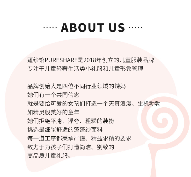 PureShare蓬纱馆,2018年创立的儿童服装品牌,专注于儿童轻奢生活类小礼服,主张“让孩子做最独特的自己”的品牌理念,为孩子们提供时尚简洁、优雅而又不失童真的生活类礼服。