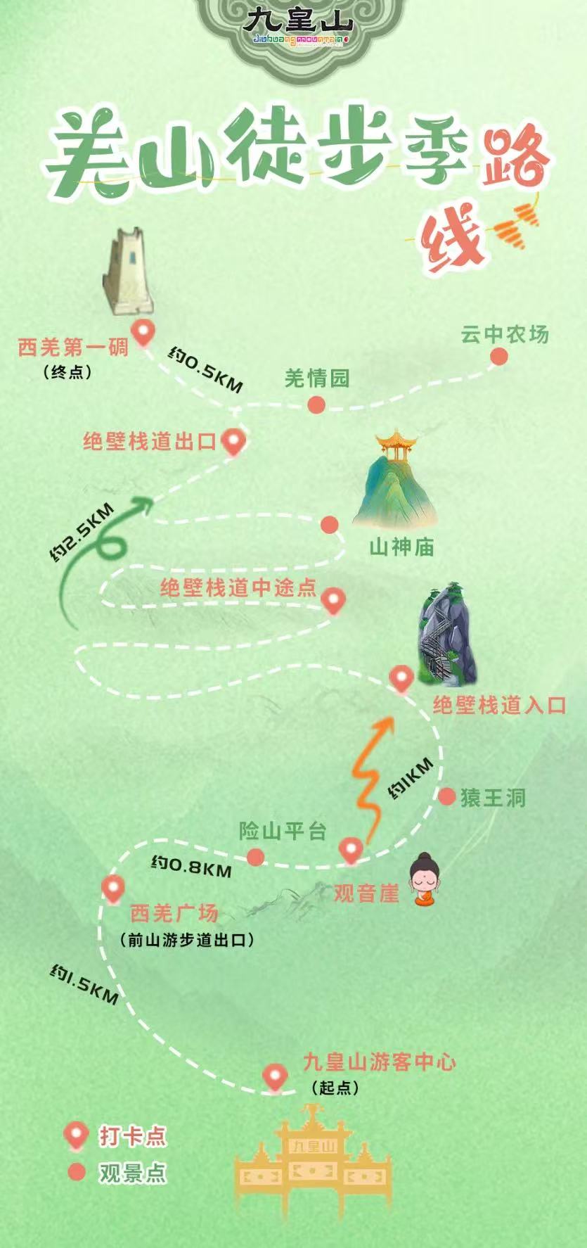 到达九皇山,下车准备开始徒步;起点景区游客中心—西羌广场—观音崖—情人桥—猿王洞—西羌情缘—西羌第一碉(终点),缆车下山!全程需要6个小时边走边玩。