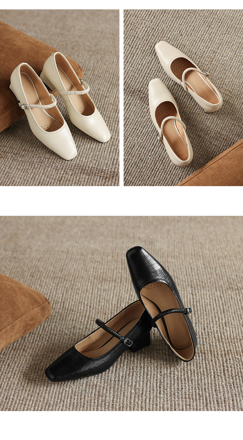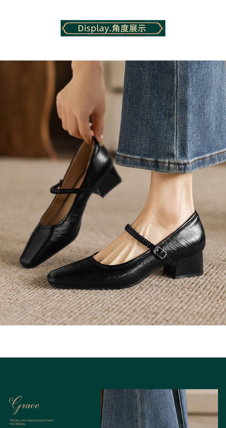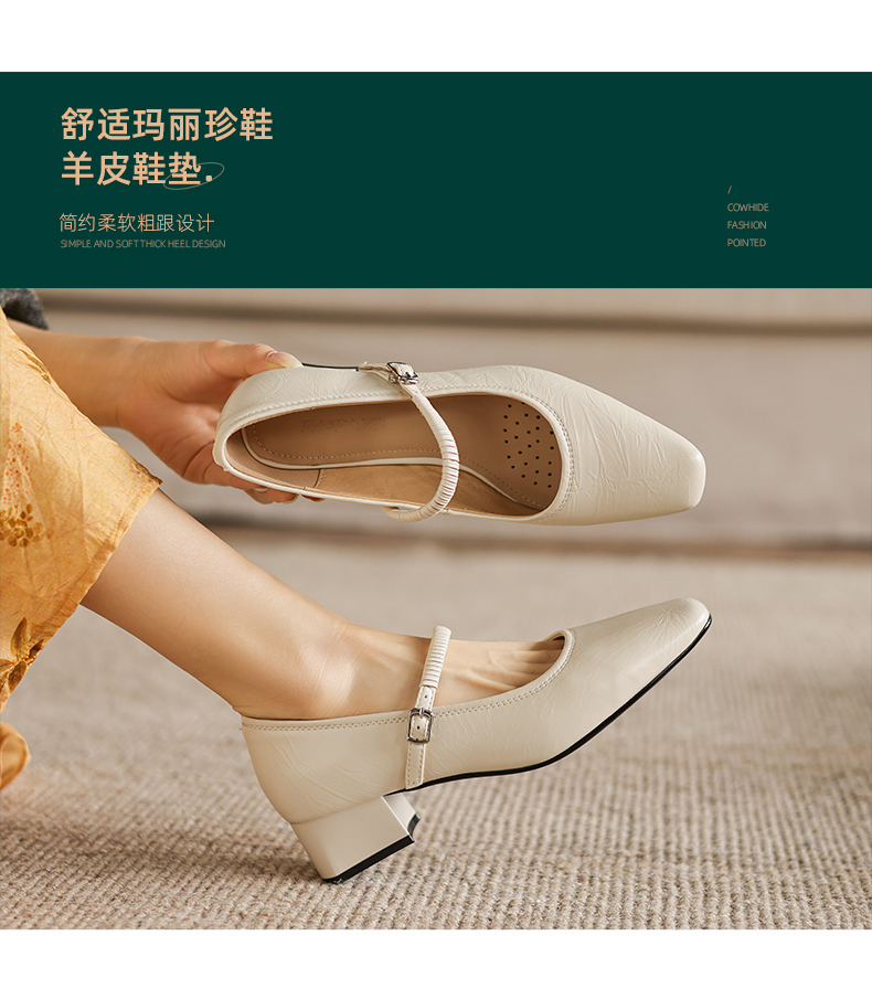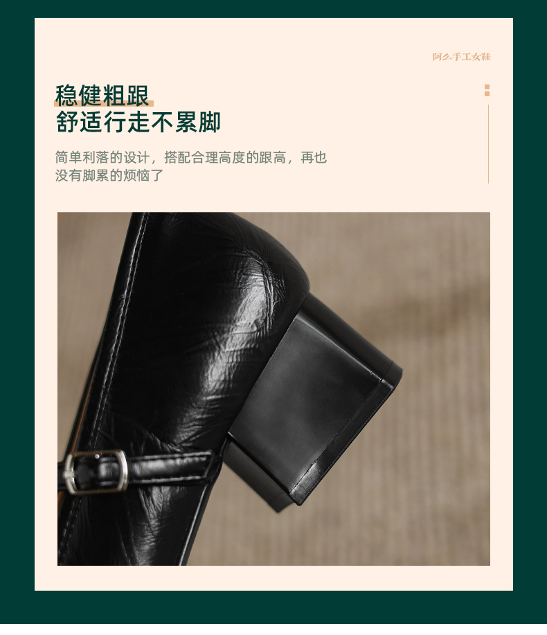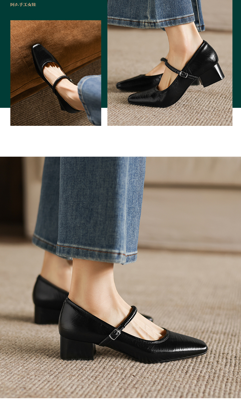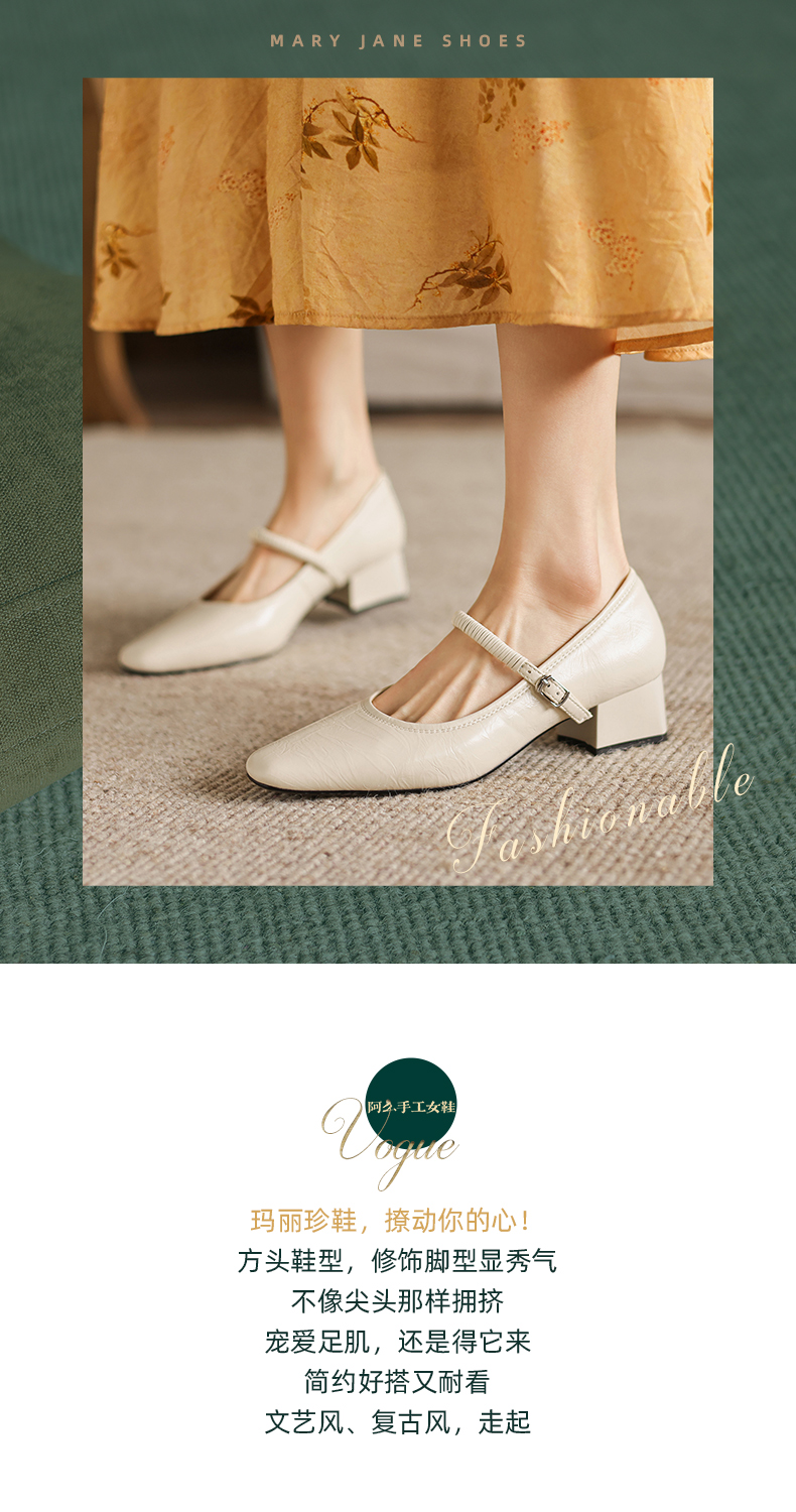 阿么手工女鞋法式简约真皮一字带玛丽珍鞋4CM粗跟超软小方头单鞋