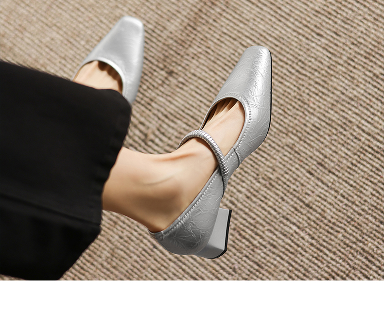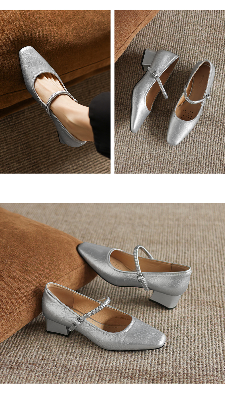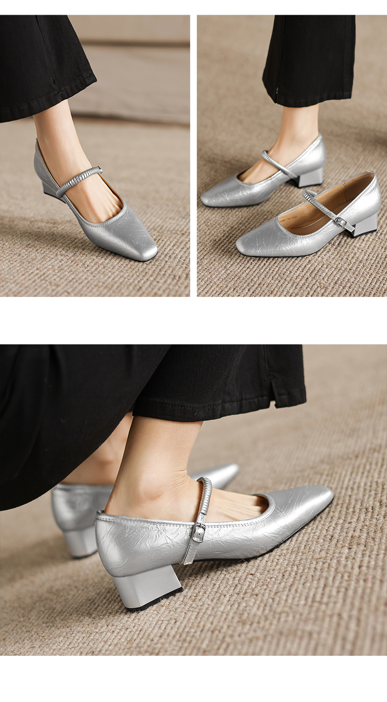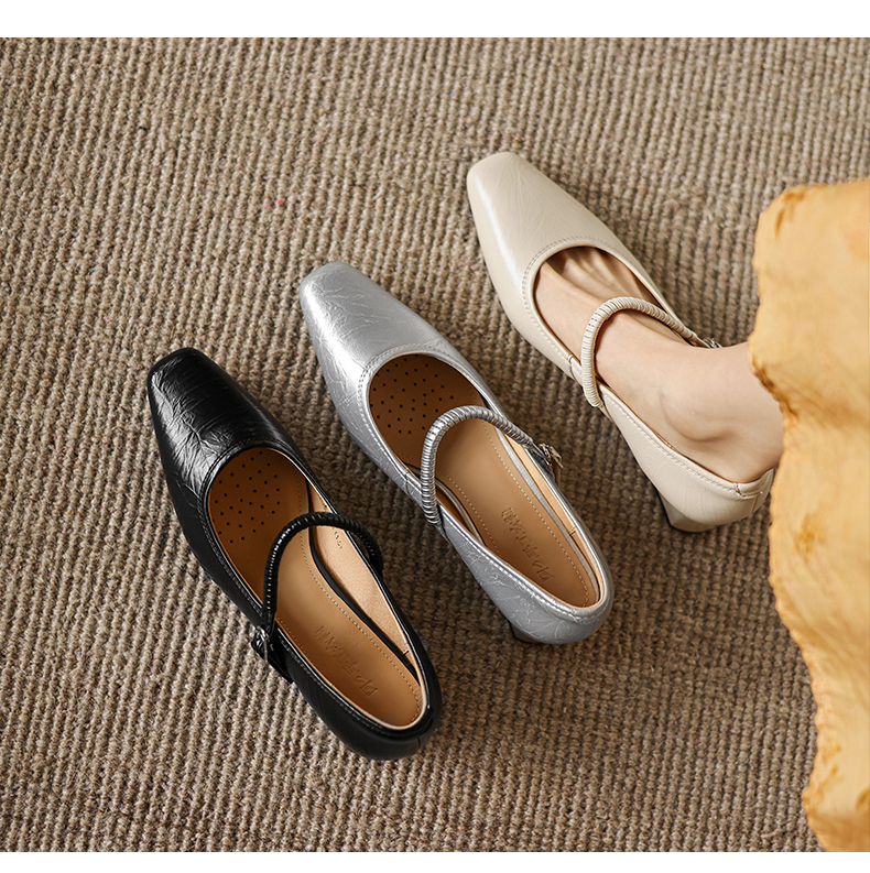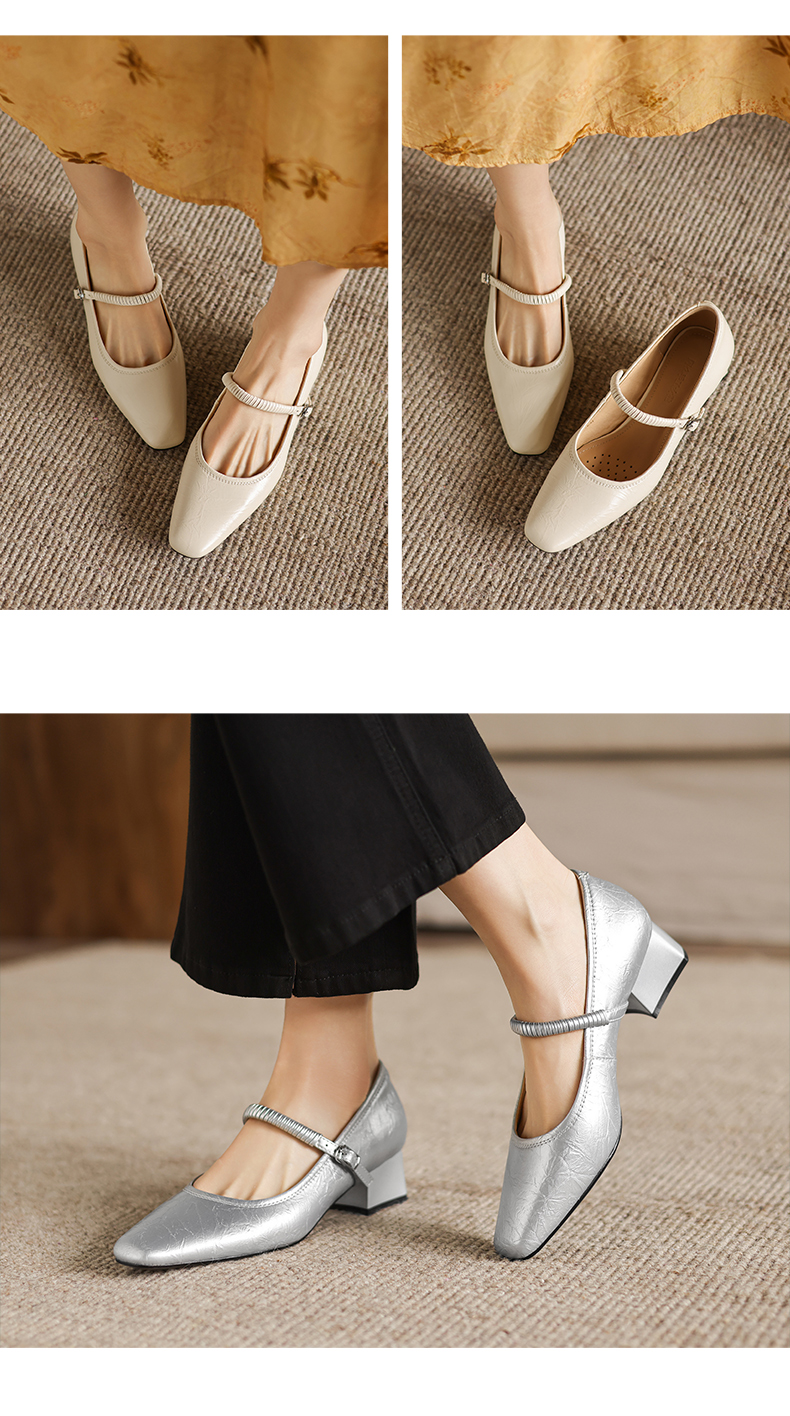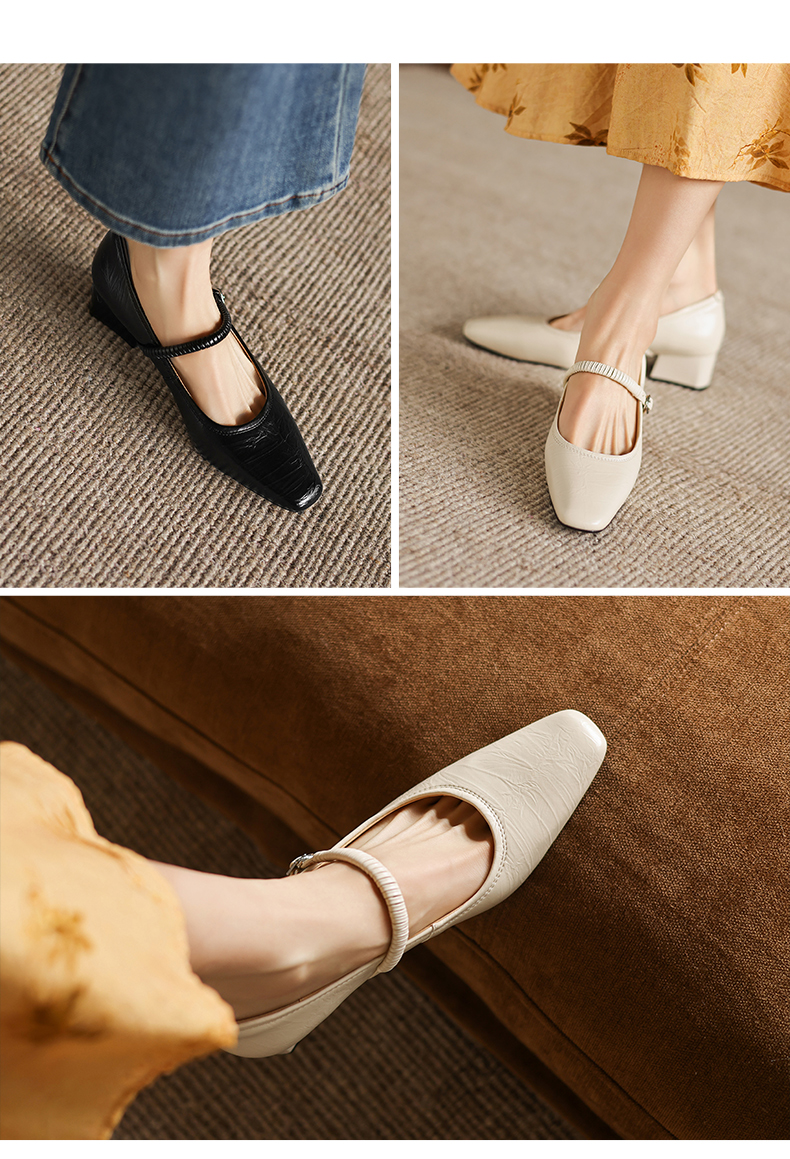 阿么手工女鞋法式简约真皮一字带玛丽珍鞋4CM粗跟超软小方头单鞋