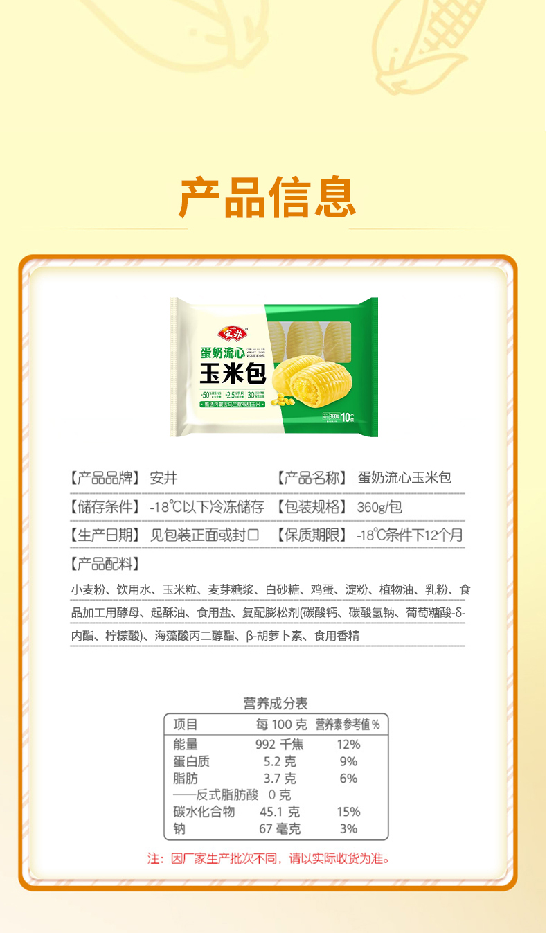 360g(10个装) 安井 蛋奶流心玉米包 早餐速冻面点半成品 玉米馒头奶香玉米包