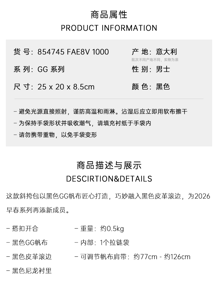 GUCCI 古驰 男士GG帆布小号斜挎单肩包 黑色 854745 FAE8V 1000