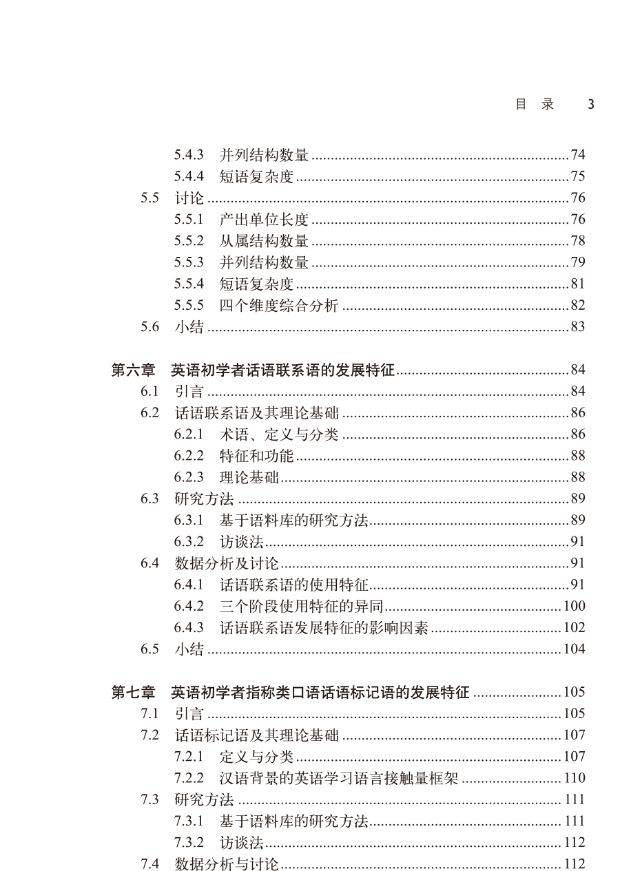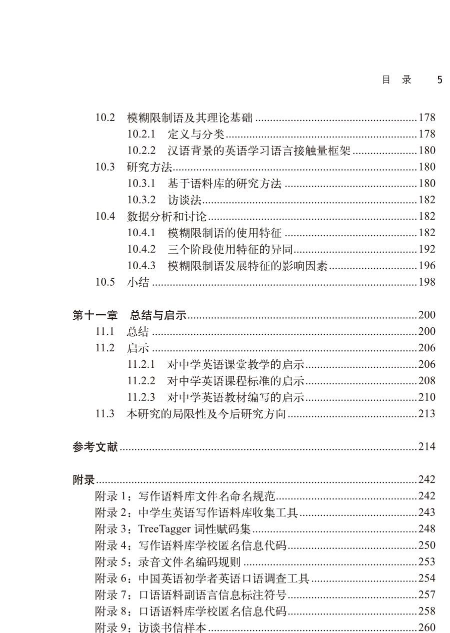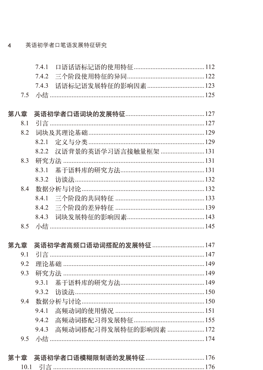 全书共包含十一章。章对基于使用的二语习得研究进行文献梳理,为本书的实证研究提供理论视角。第二章阐述语言接触量假说的内涵与外延,同时建构汉语背景的英语学习语言接触量框架,为实证研究提供理论根据。第三章对作者自建的两个初学者语料库进行描述。第四至十章以英语学习的七个方面(词汇丰富性、句法复杂度、话语联系语、话语标记语、词块、动词搭配、模糊限制语)为切入点,研究英语初学者四个层面(词汇层、句法层、语篇层、语用层)的口笔语发展规律性特征。第十一章是本书的总结与启示。