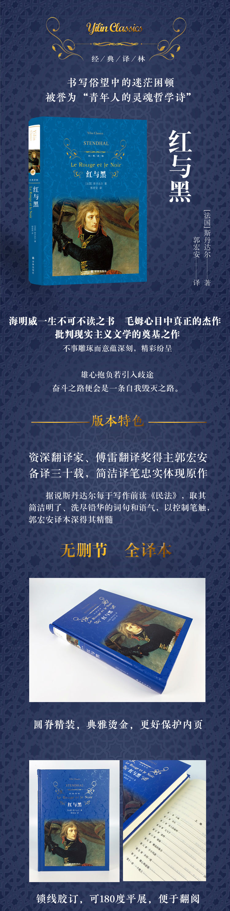 《红与黑》是批判现实主义文学的奠基之作,不事雕琢而意蕴深刻,精彩纷呈,它书写俗望中的迷茫困顿,被誉为“青年人的灵魂哲学诗”,是海明威一生不可不读之书,毛姆心目中真正的杰作。本译本为资深翻译家、傅雷翻译奖得主郭宏安译本。郭宏安先生为此备译三十载,简洁译笔忠实体现原作:据说斯丹达尔每于写作前读《民法》,取其简洁明了、洗尽铅华的词句和语气,以控制笔触,郭宏安译本深得其精髓。