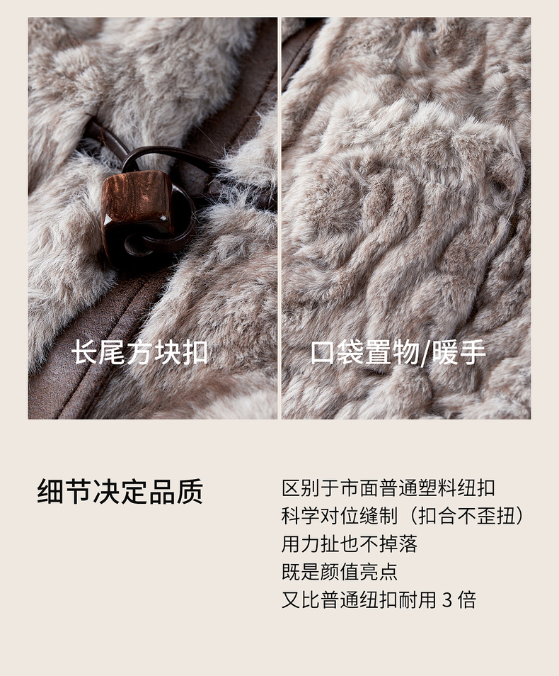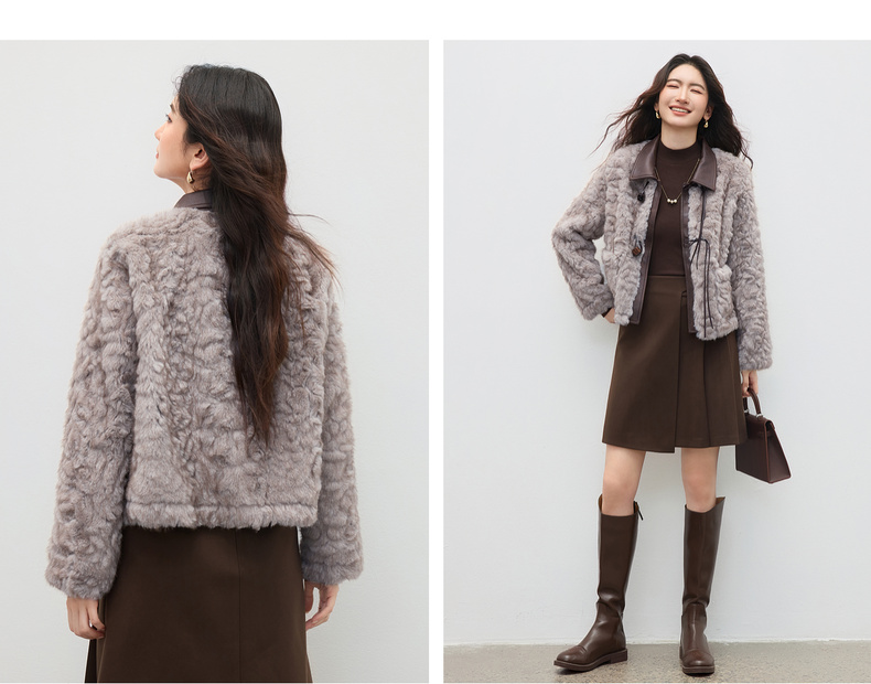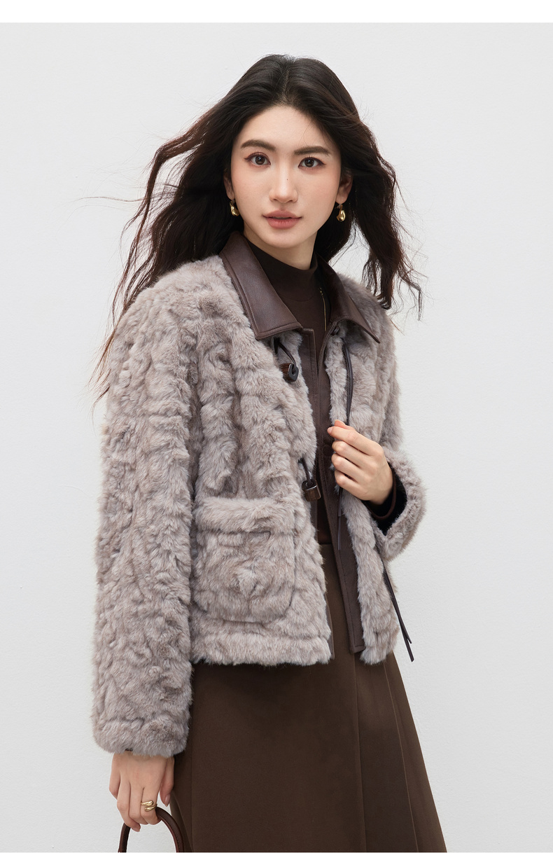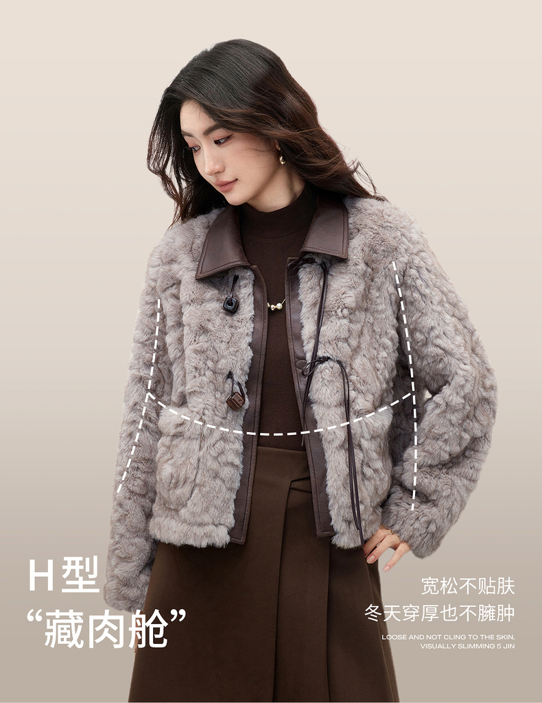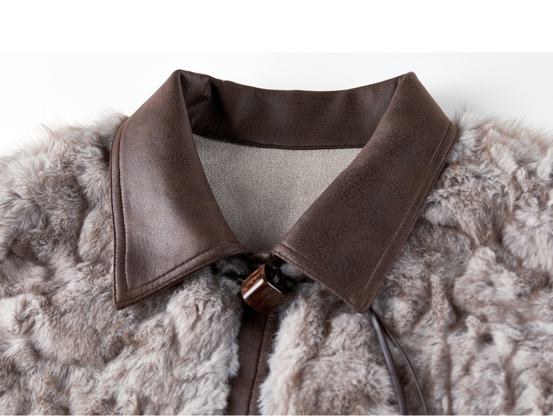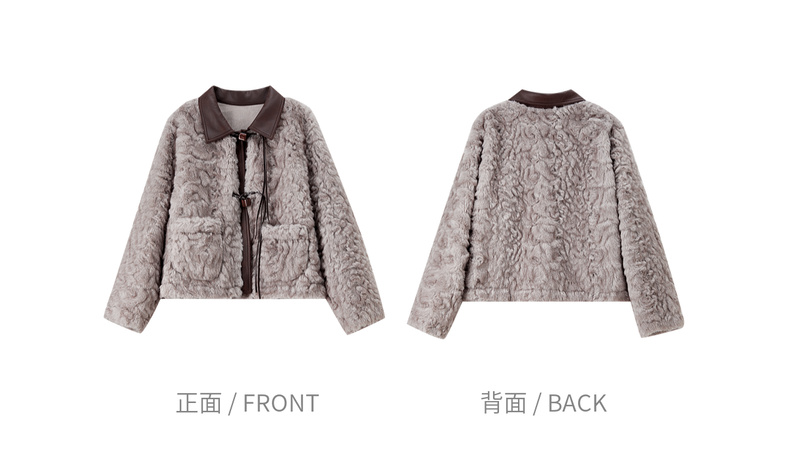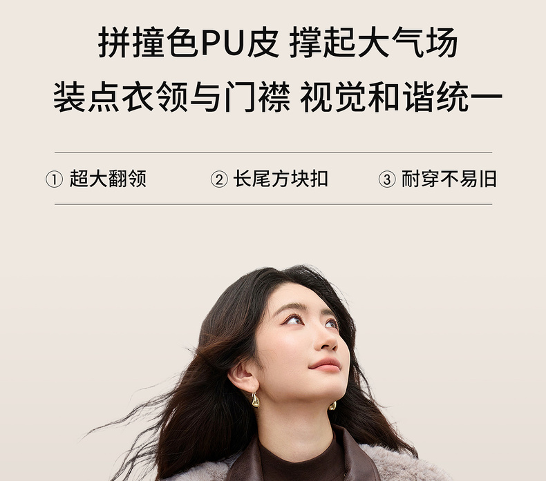 【内购】【天生蓄暖】时尚洋气复古拼接撞色PU皮翻领长尾方块扣厚保暖不臃肿皮毛绒外套-W54PD4680