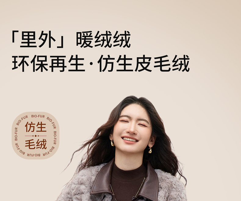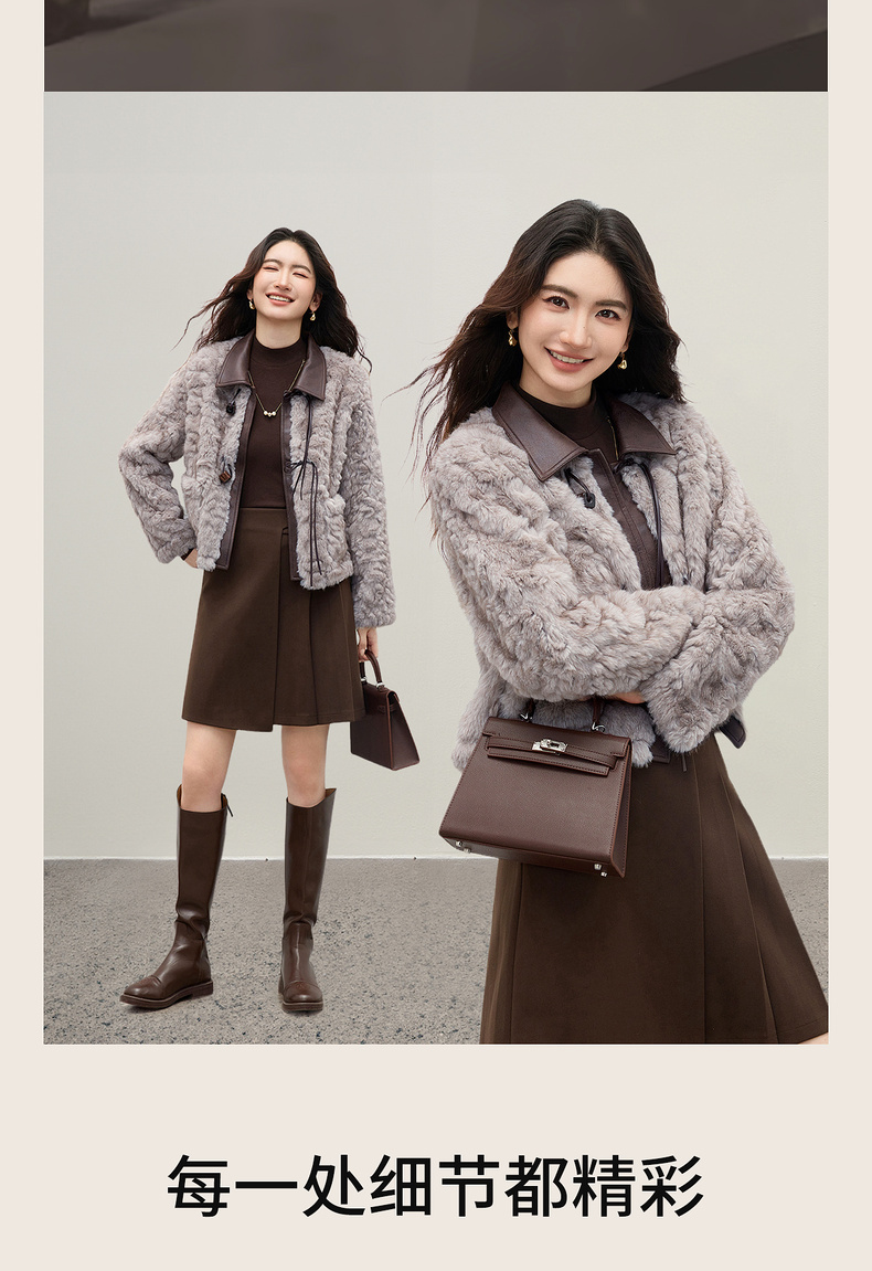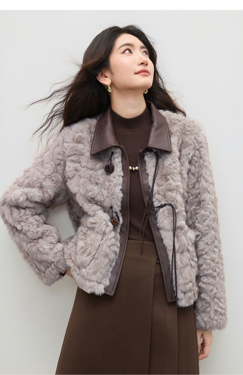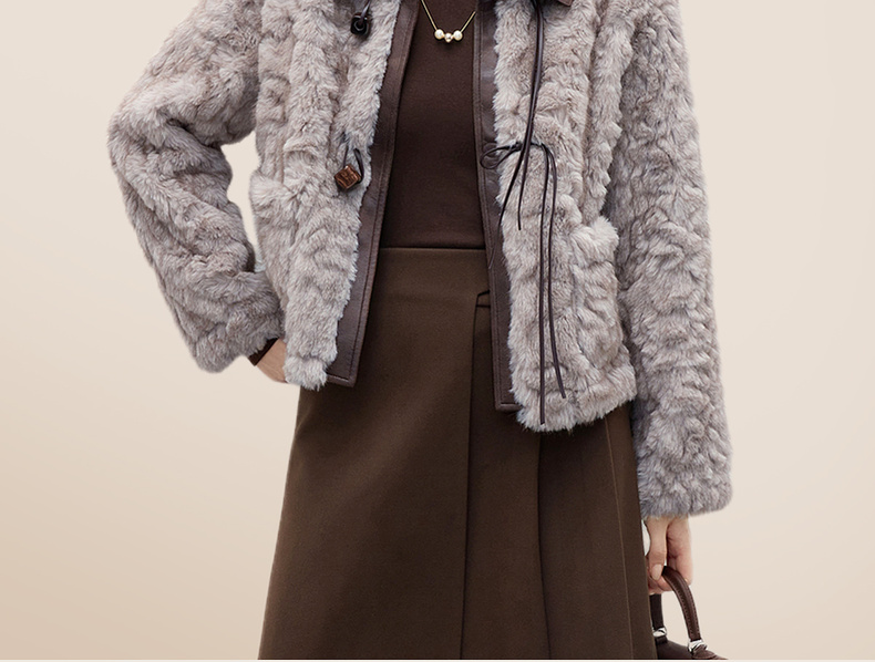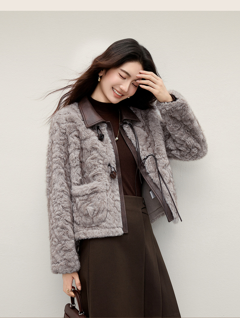 【内购】【天生蓄暖】时尚洋气复古拼接撞色PU皮翻领长尾方块扣厚保暖不臃肿皮毛绒外套-W54PD4680