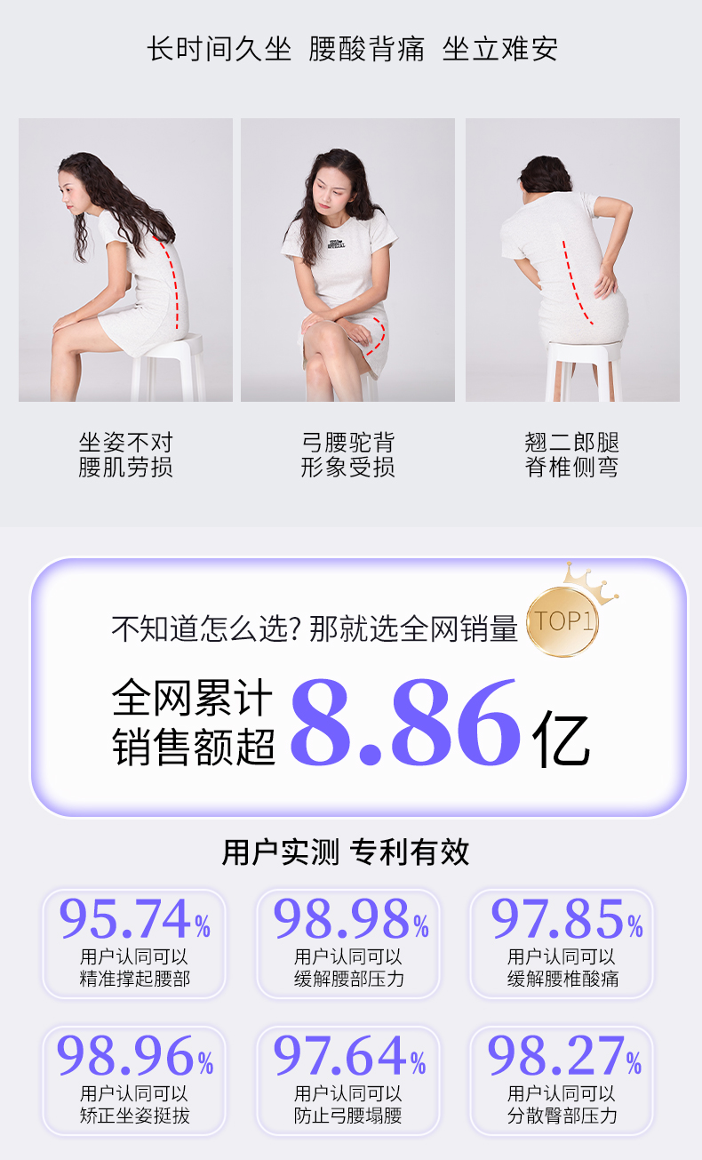 使用方法:将身体挺直,尽量把臀部向后坐,贴合坐垫曲线