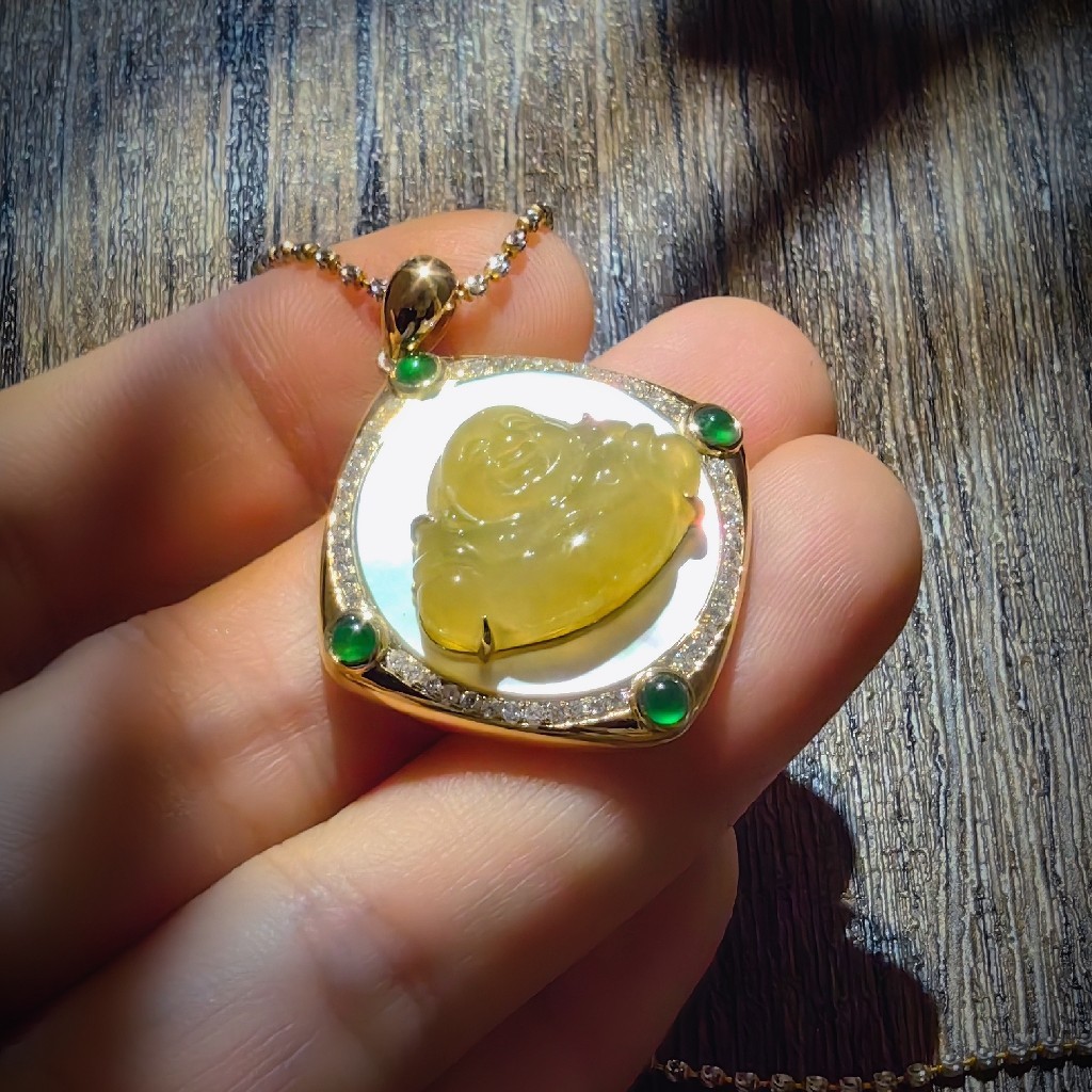 这件鸡油黄的翡翠小弥勒,有着水润细腻的结构,和饱满俏丽的颜色,眉弯嘴翘,憨厚富态。在设计时我们一直在探讨,怎么设计这件小巧精致的鸡油黄弥勒,使其突出跳跃艳丽的颜色还能人人百搭,不再挑剔肤色。并且使小弥勒呈现简单大方的风格。反复推敲后,定出了用使用白贝母做底,鸡油黄弥勒镶嵌在晕彩丰富的贝母上,项坠整体呈现七彩佛光的视觉效果。就为了这个想法,我们前后调整贝母的形状付出了3、4片贝母的代价。也是因为这个想法才使得这件小弥勒以一种崭新的效果呈现在大家眼前。