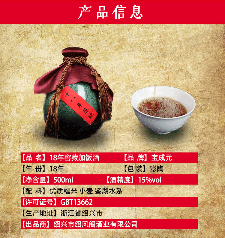 宝成元绍兴黄酒 十八年15度糯米酒 东酿老酒
