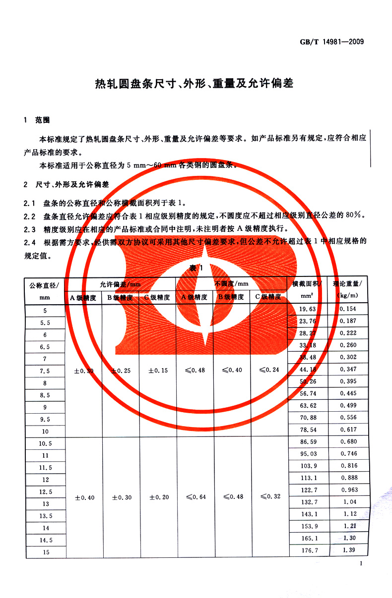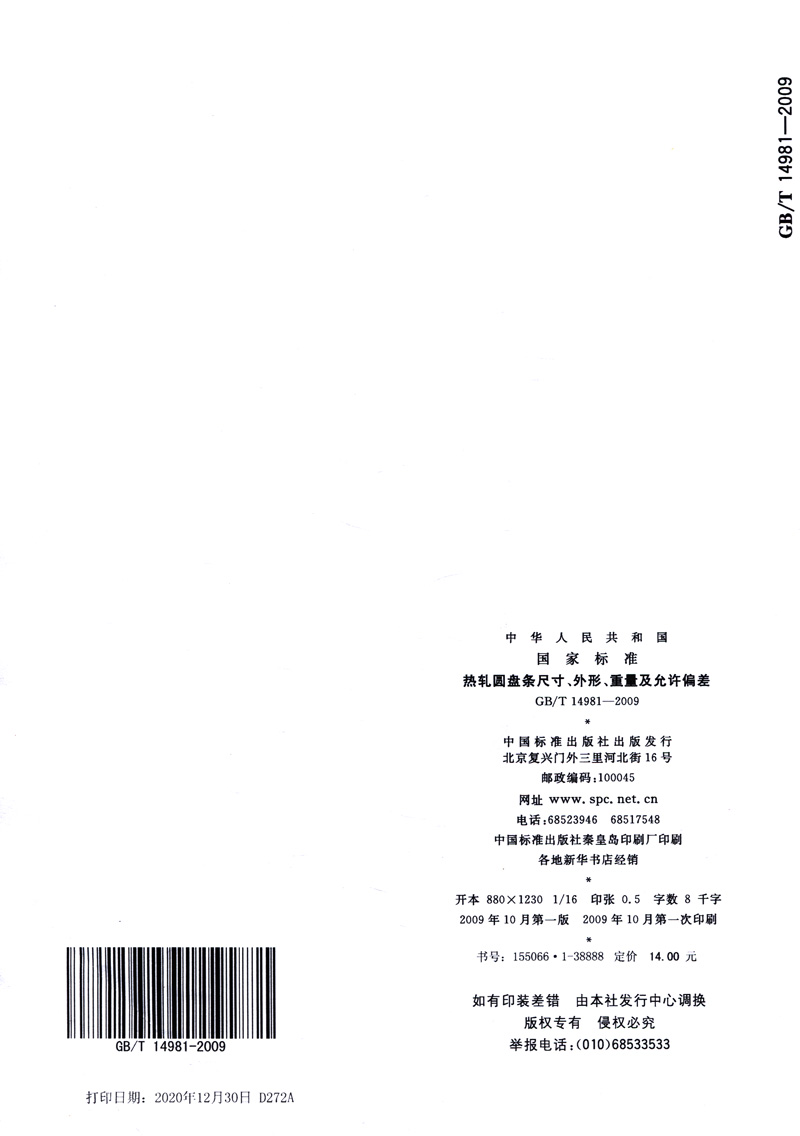 书名:速印不退 GB/T 14981-2009 热轧圆盘条尺寸、外形、重量及允许偏差