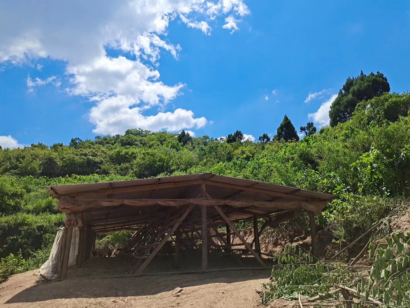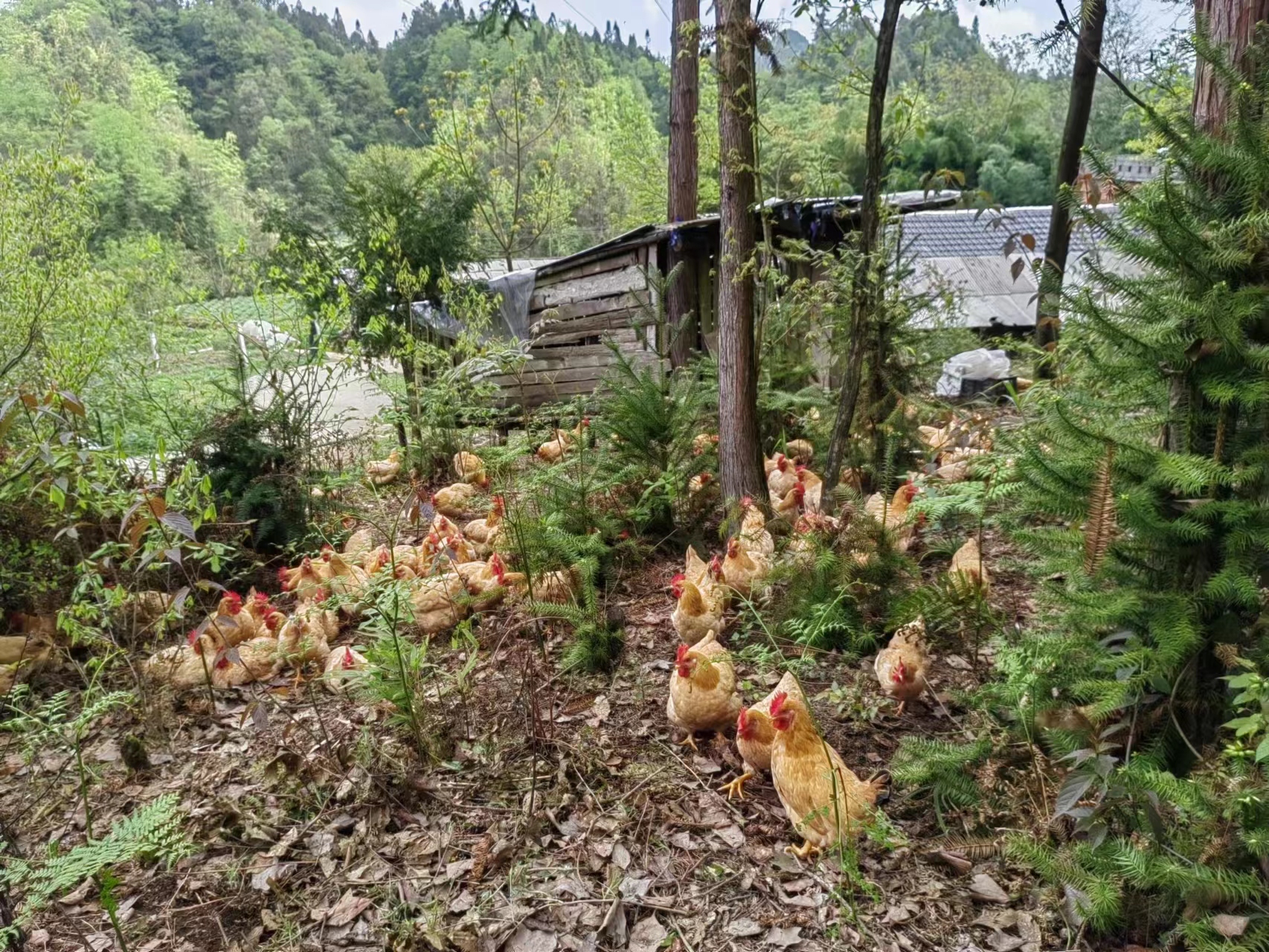 细骨原种小母鸡的生活环境:贵州原始的山间树林或者灌木丛散养
