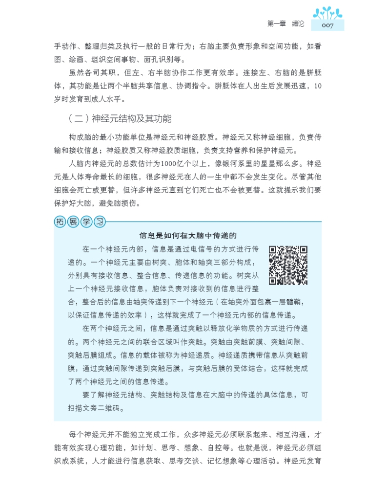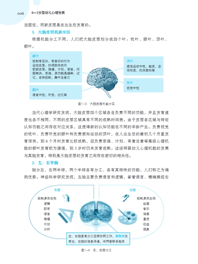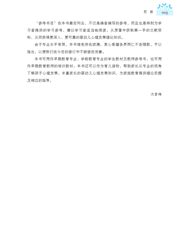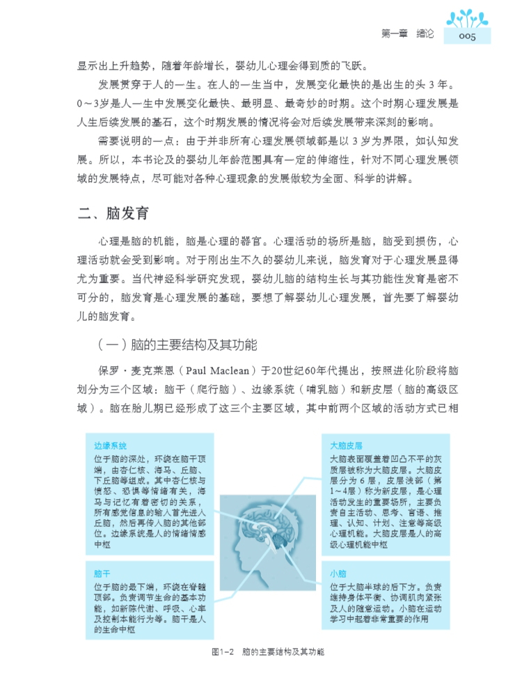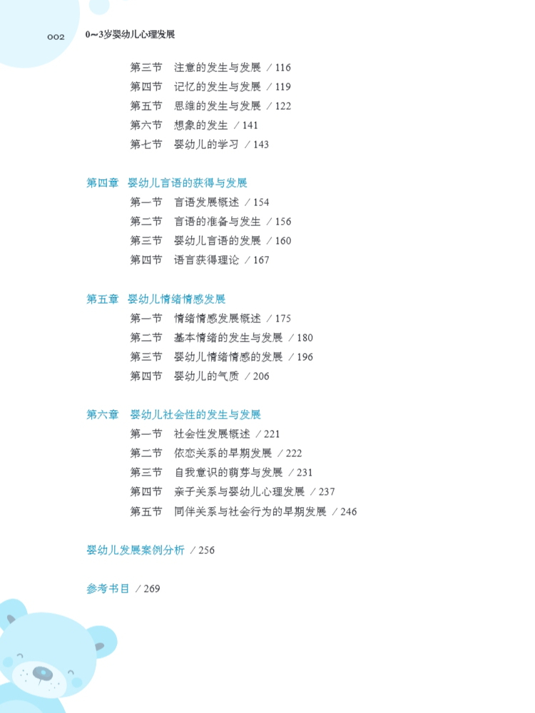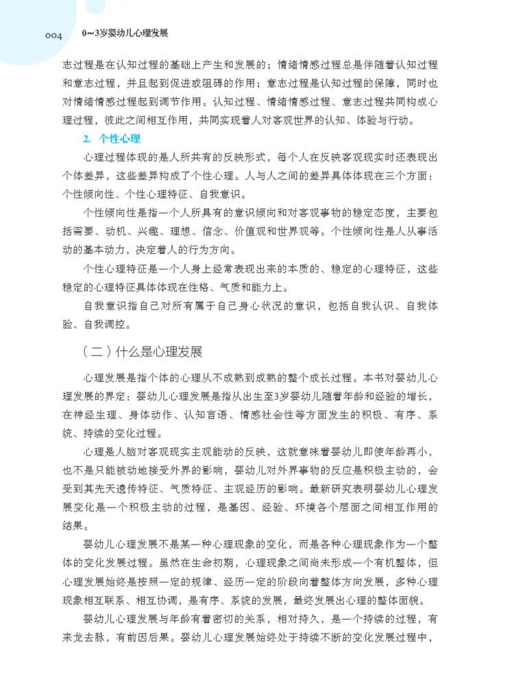 本教材立足于心理学经典理论和新近研究成果,以婴幼儿主要的心理发展领域为主线,较为全面地介绍了0~3岁婴幼儿心理发展的基本问题,科学系统地呈现了从出生到3岁婴幼儿心理发展的过程,阐述了认知、言语、情绪情感、社会性等方面的发展特点和发展规律,并结合跨学科领域的研究成果以新的视角探讨了0~3岁婴幼儿心理发展的内在机制及影响因素,为早期教育指导提供了适宜的对策与建议。本书注重理论与实践的结合,基于各章知识点设计了拓展学习、实践体验、分享讨论等栏目,融知识学习与应用于一体,帮助学习者巩固知识、加深理解、拓展专业视野。