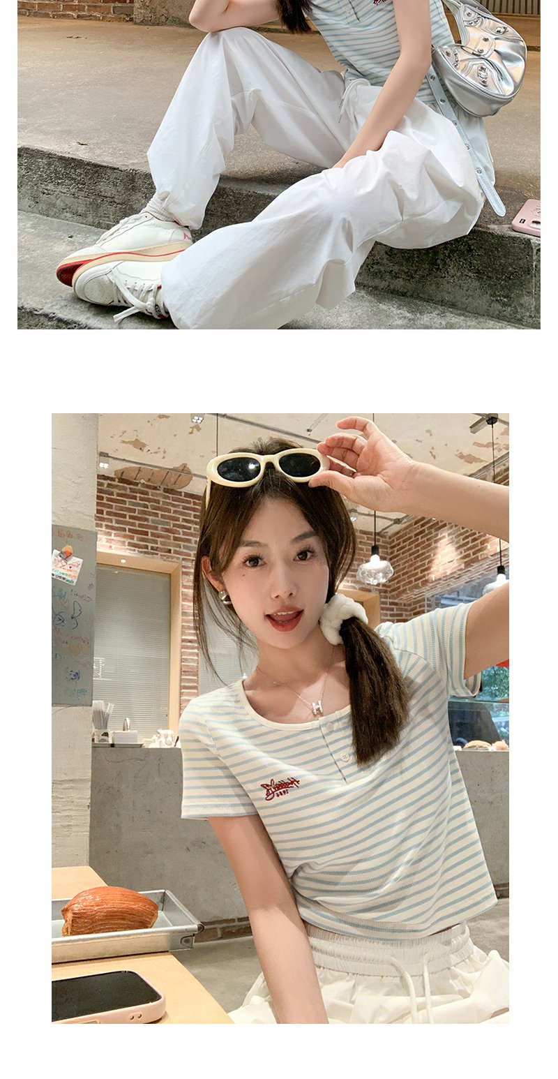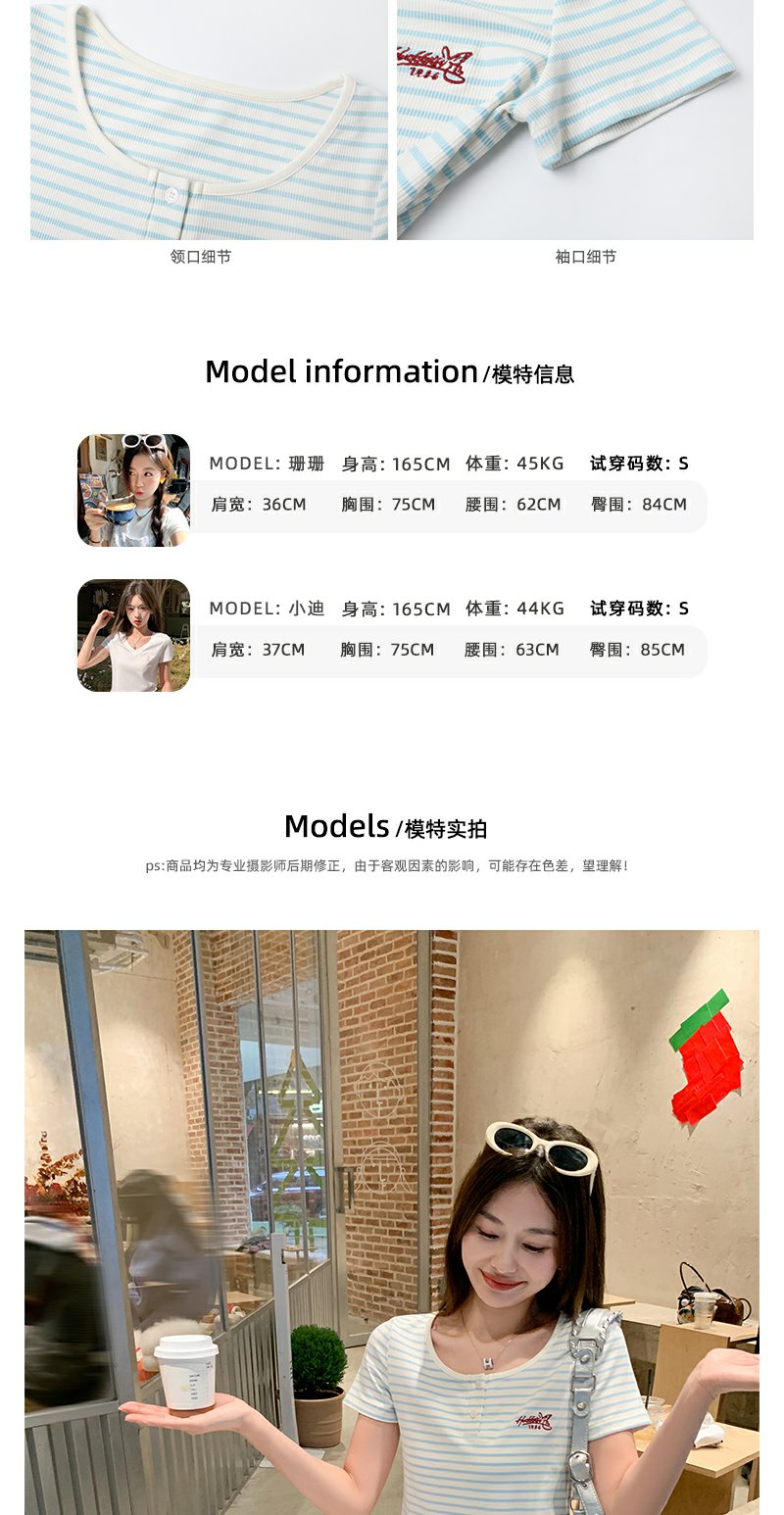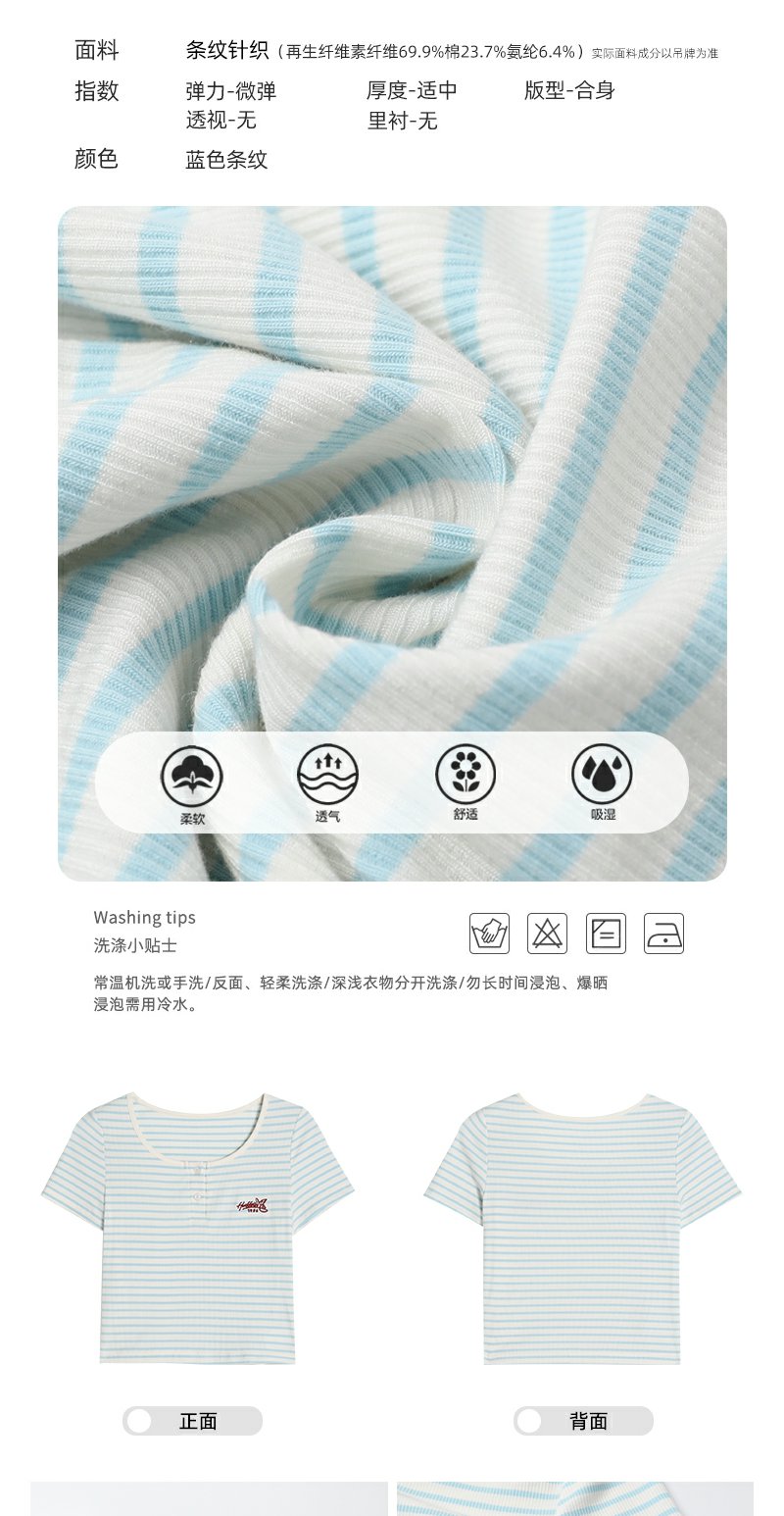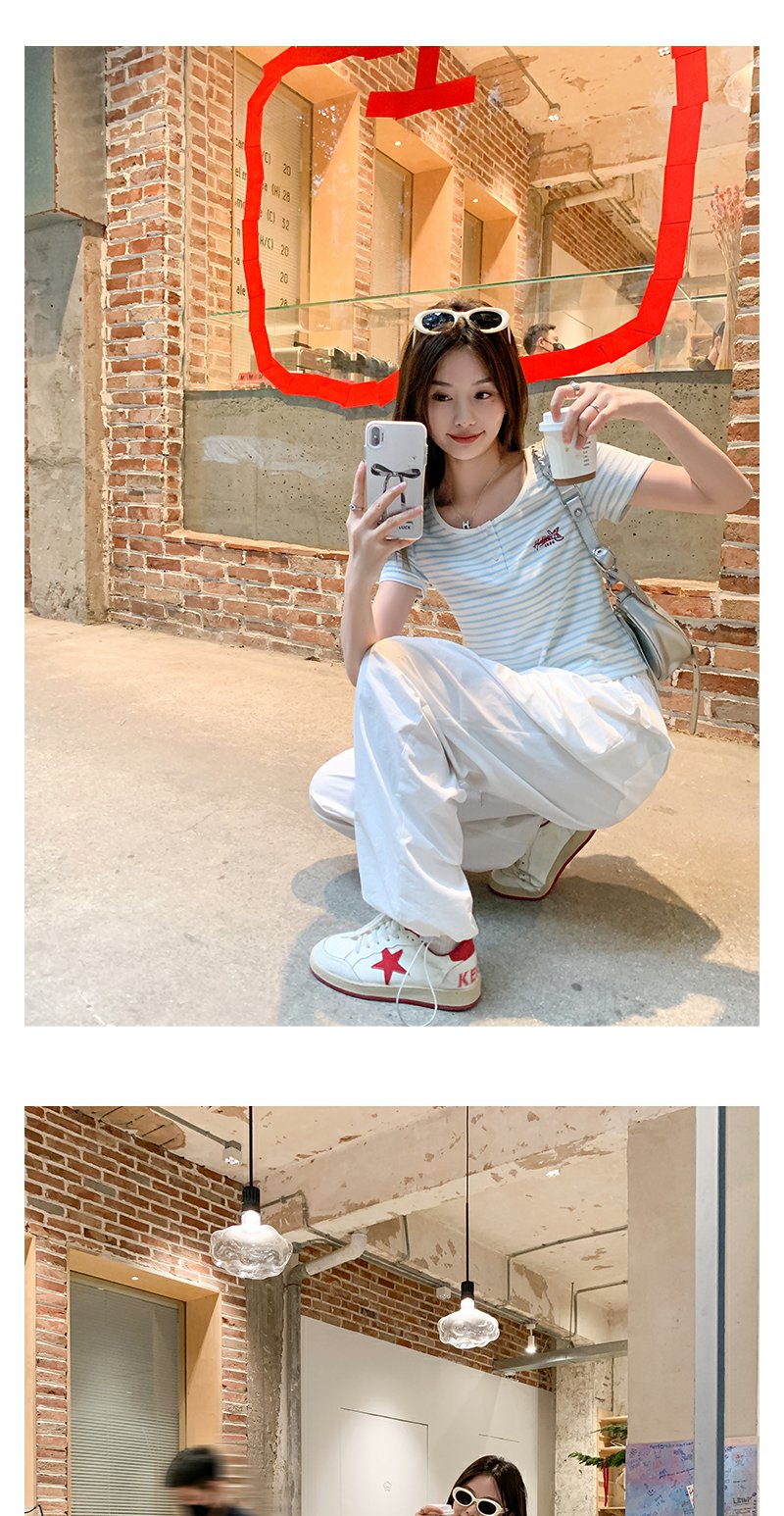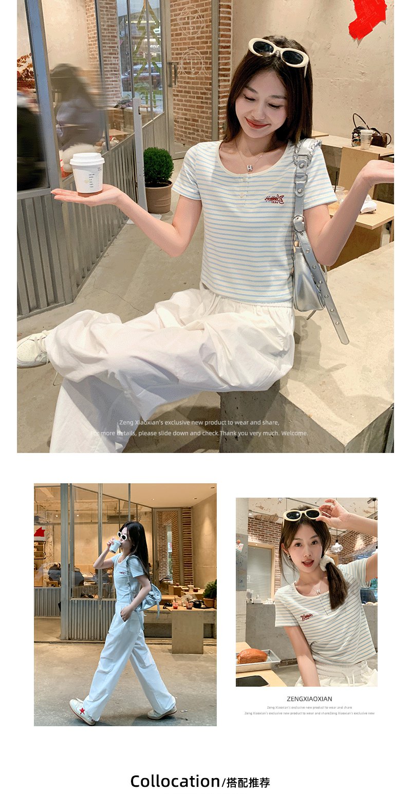 <曾小咸推荐>小清新蓝色条纹红色绣花短袖T恤