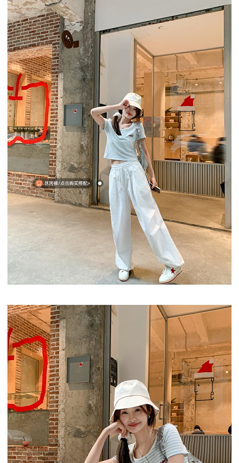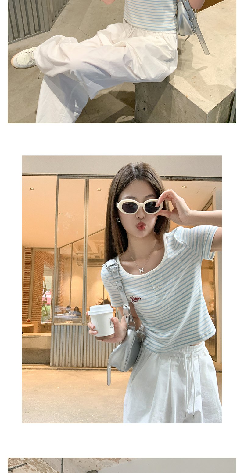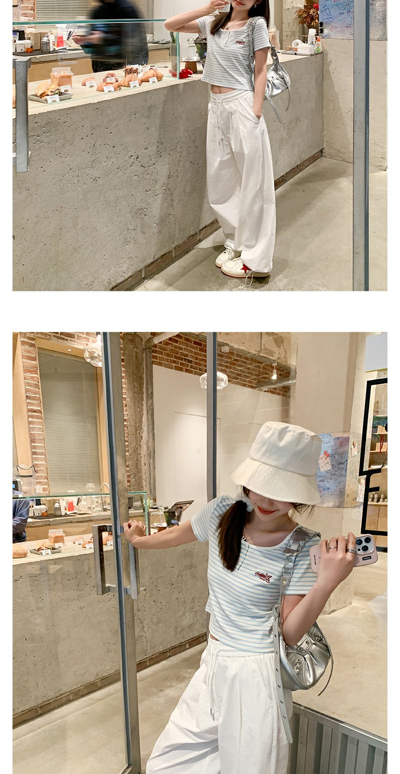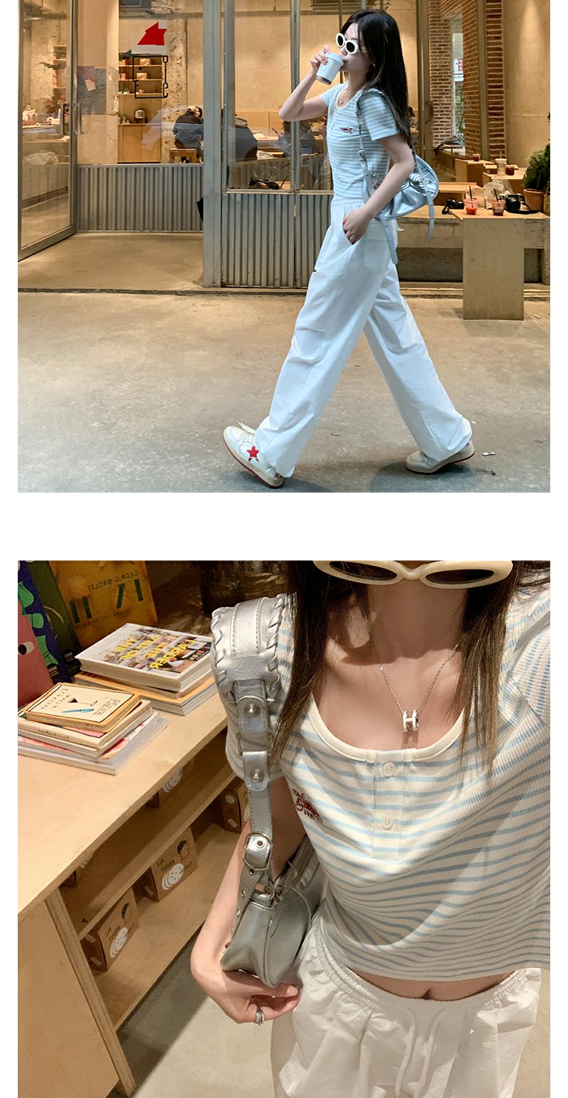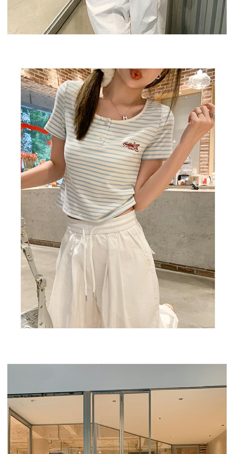 <曾小咸推荐>小清新蓝色条纹红色绣花短袖T恤