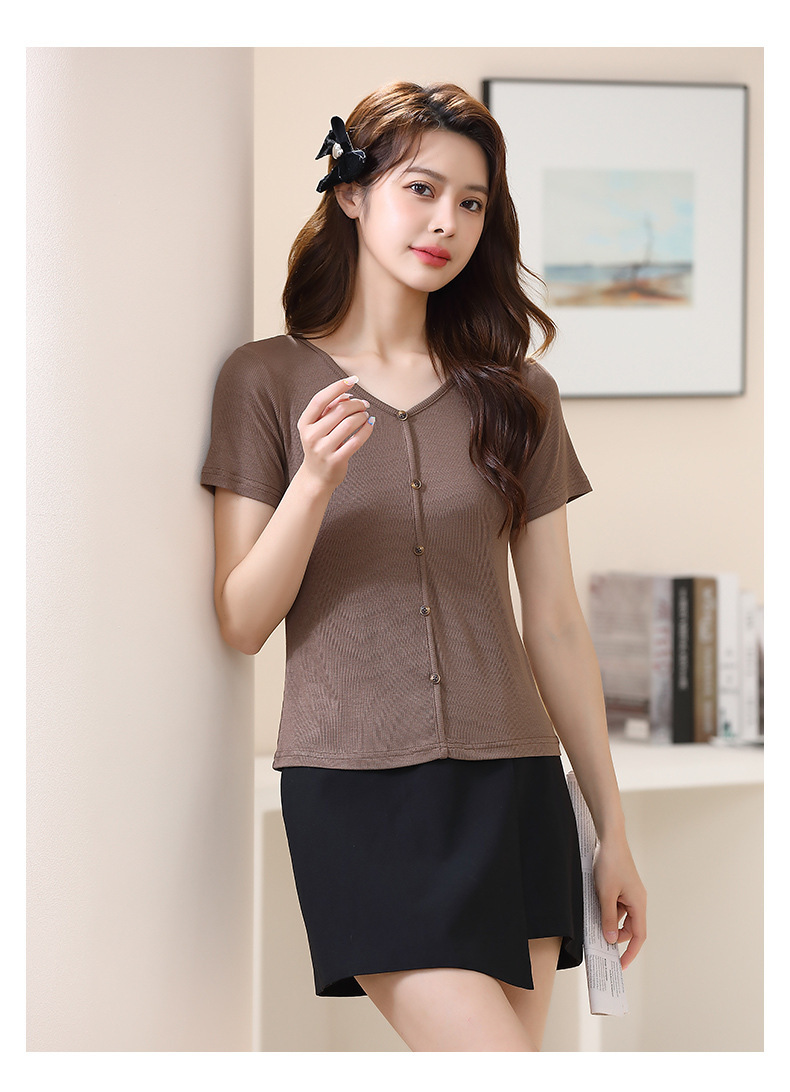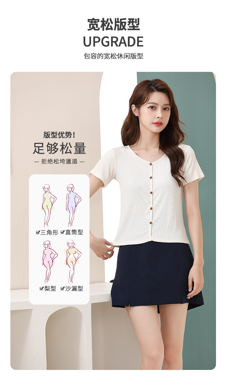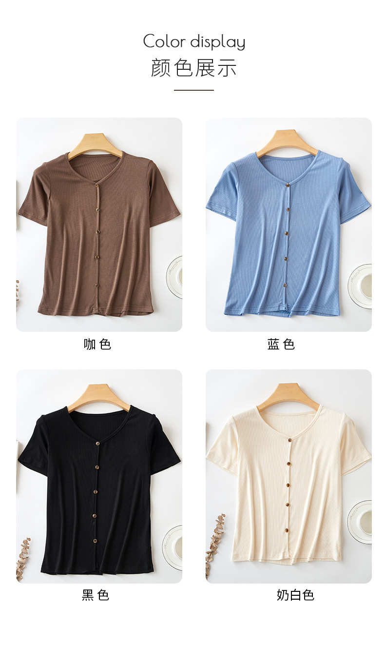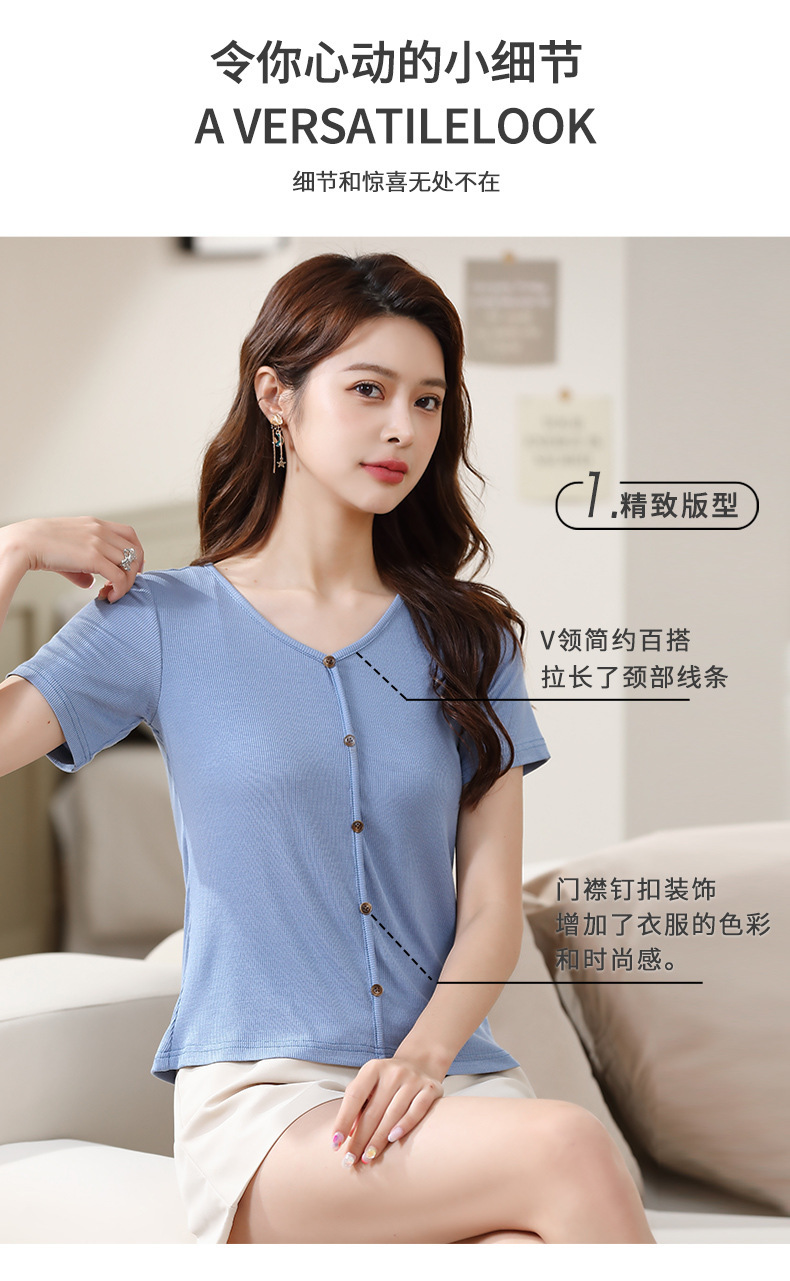 【4色可选,第二件免单!】夏日清新,简约不失精致,钉扣V字领设计别具匠心,让你更加迷人动人。棉月2023夏季新款短袖T恤女,轻松穿出独特的魅力。