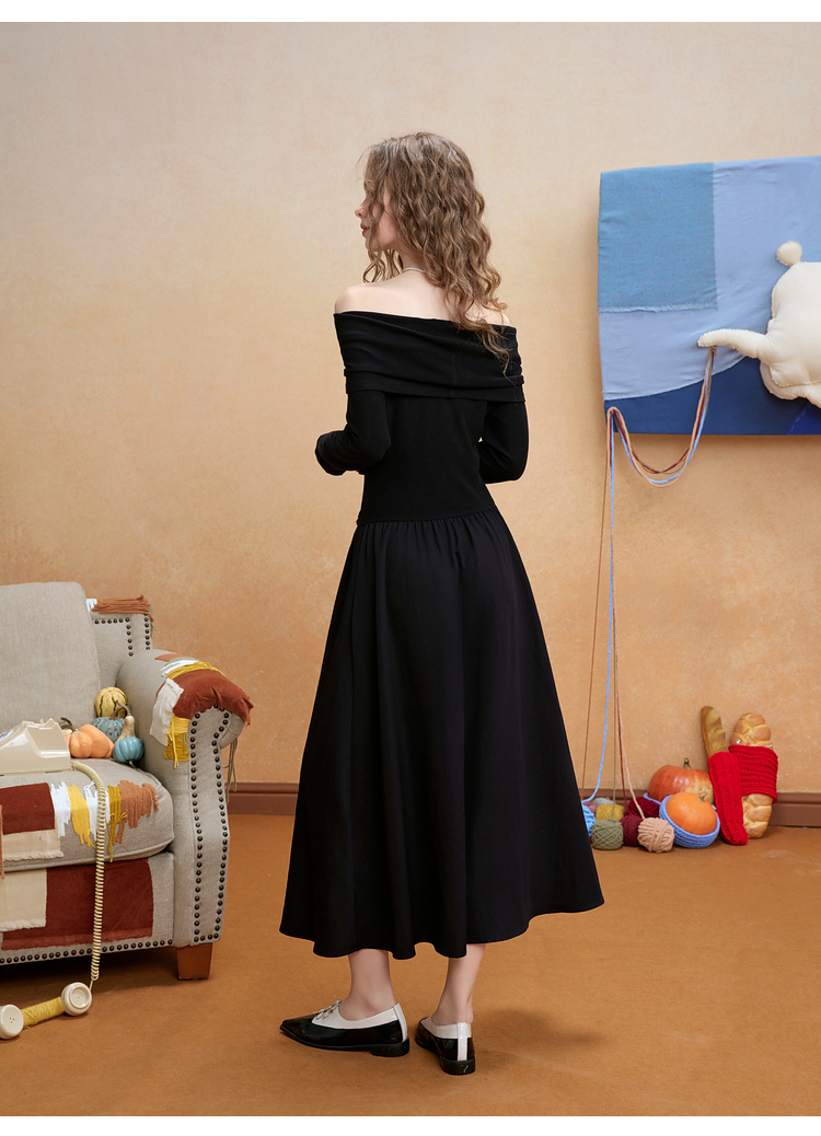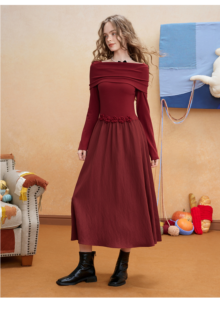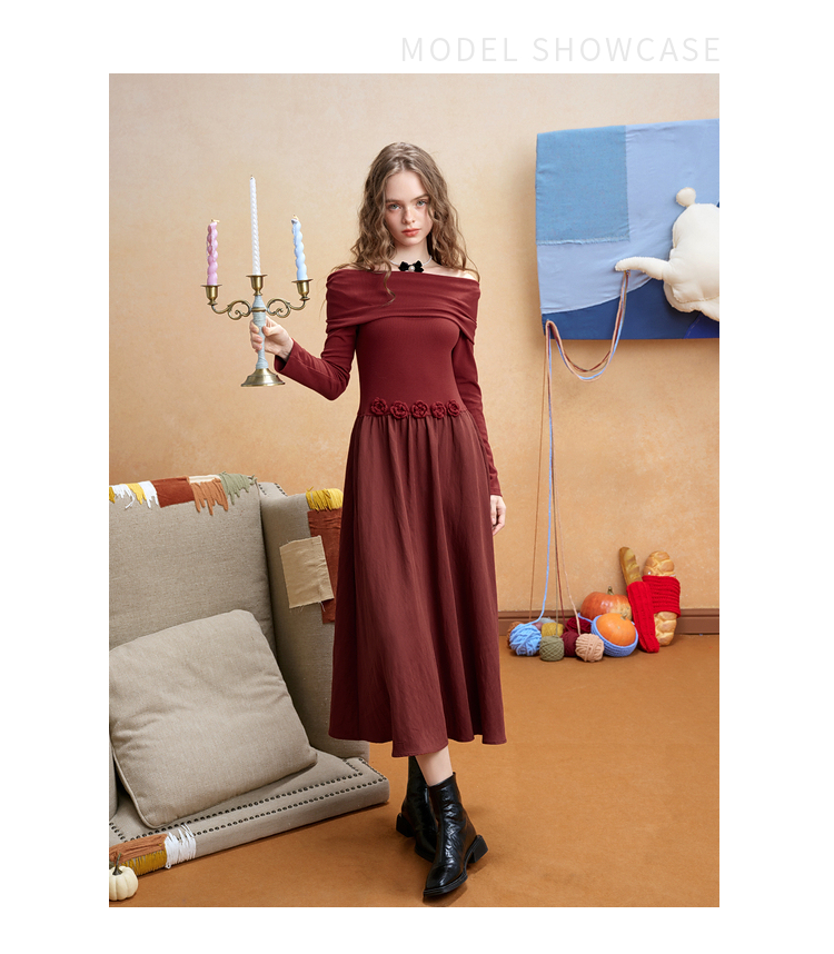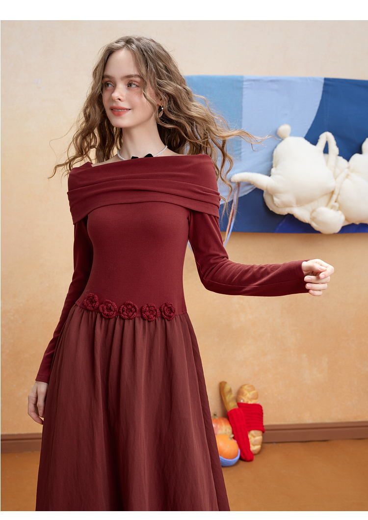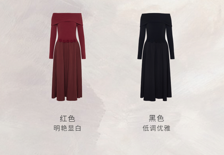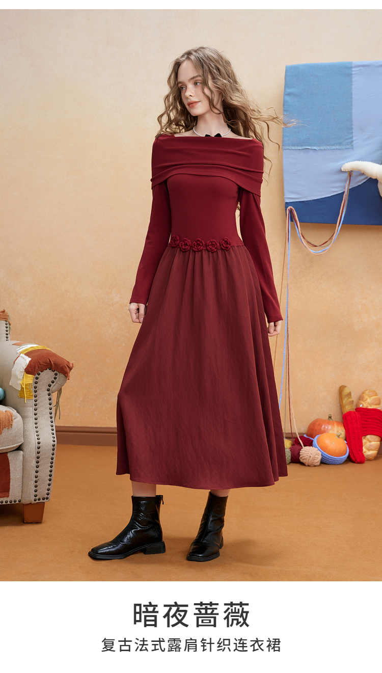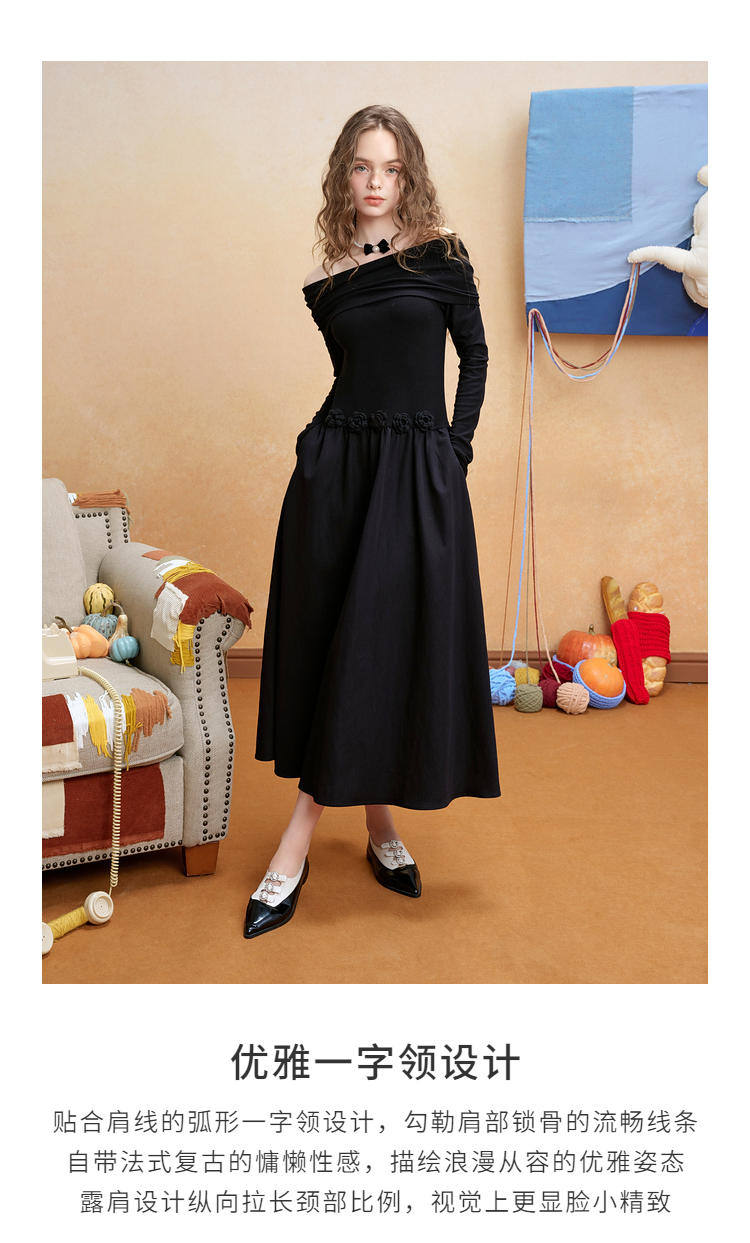 两三事暗夜蔷薇2025冬新款优雅立体手钩花一字肩露肩晚礼服连衣裙