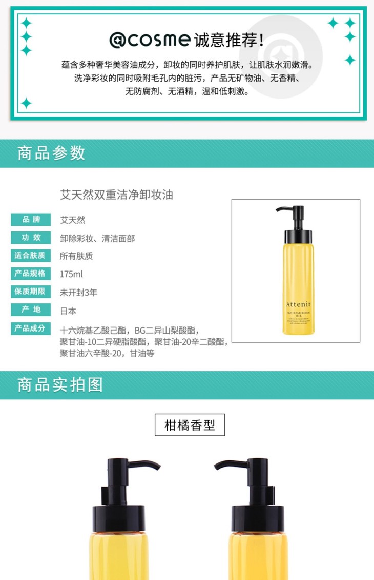 日本艾天然Attenir卸妆油双重洁净植物精油油cosme175ml