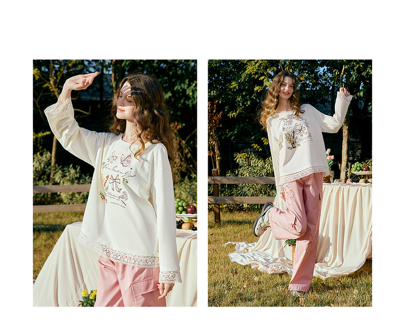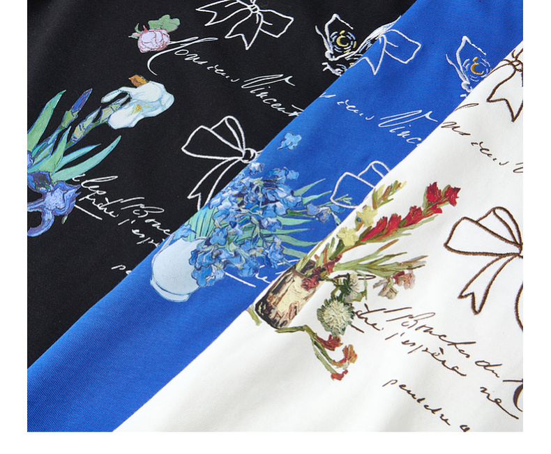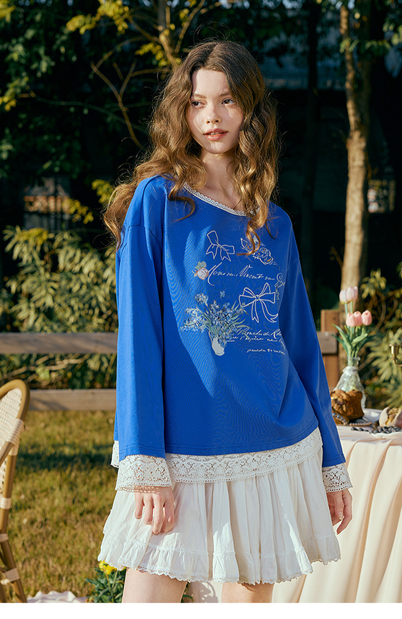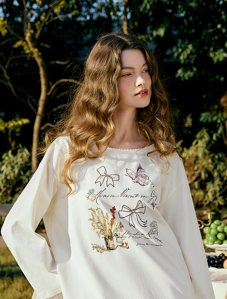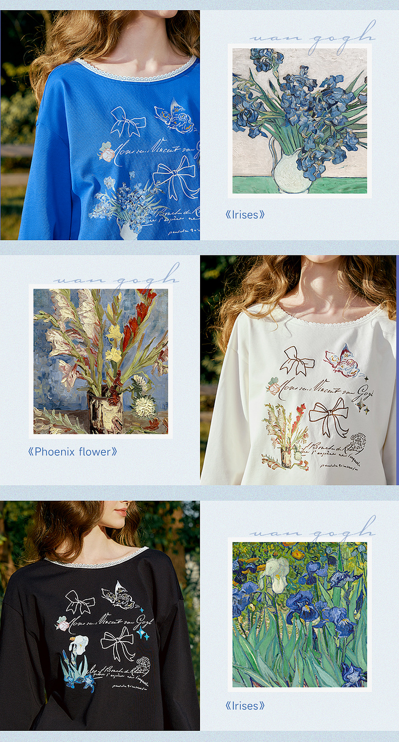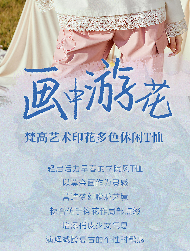 两三事梵高文艺画中游花2025春新款小清新蕾丝拼接印花刺绣t恤女