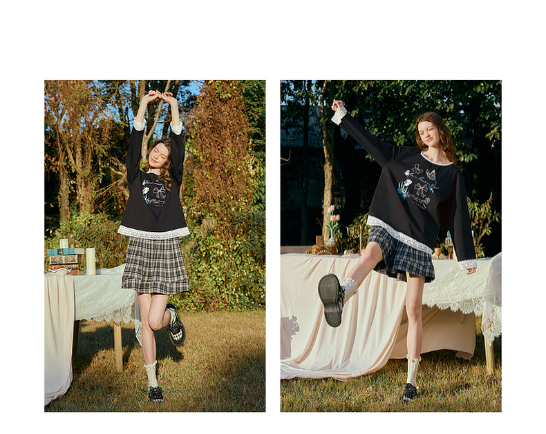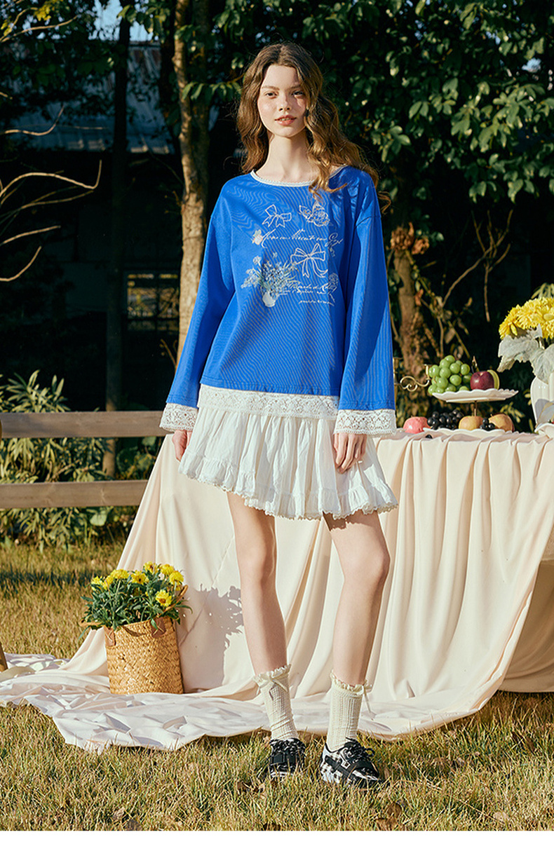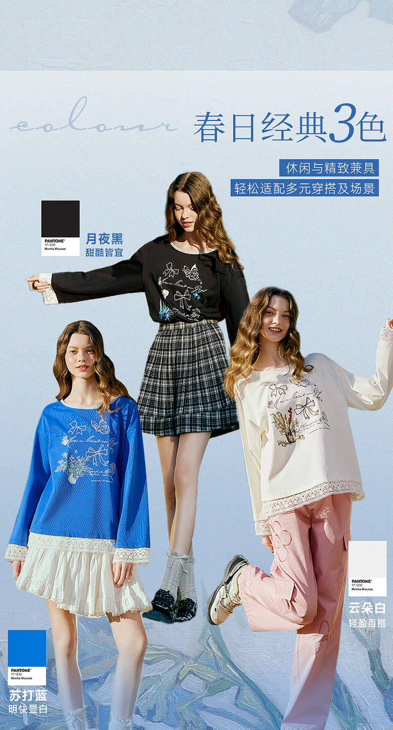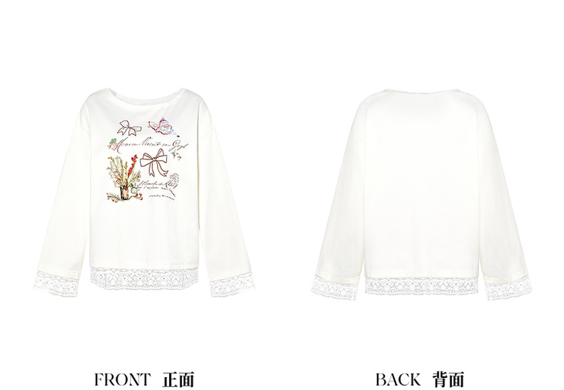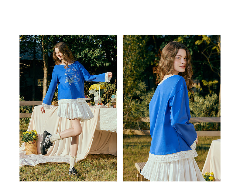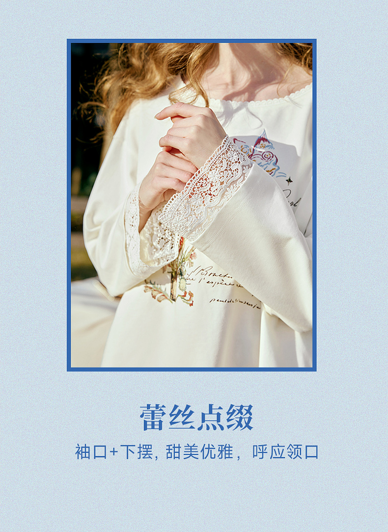 两三事梵高文艺画中游花2025春新款小清新蕾丝拼接印花刺绣t恤女
