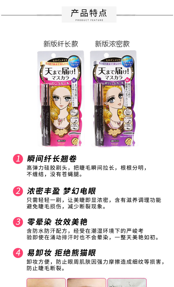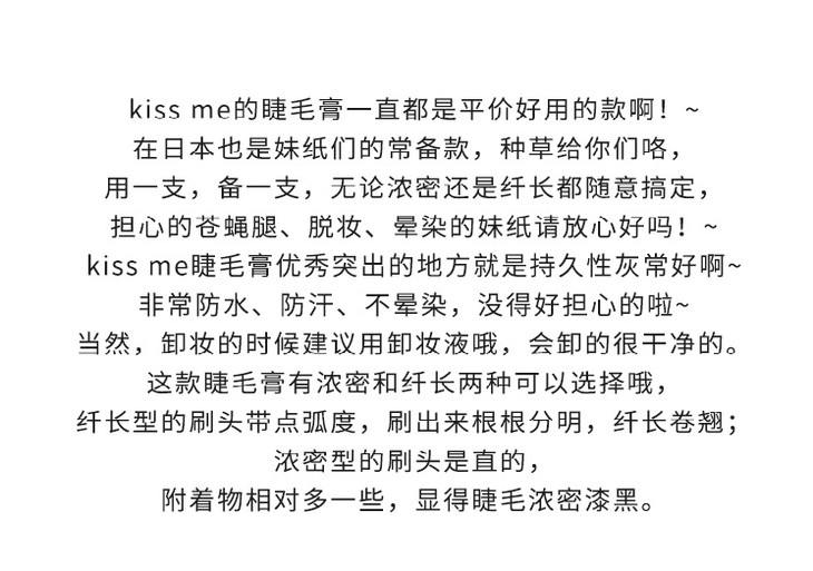 【纤长卷翘·疯狂种草】日本Kiss me奇士美睫毛膏6g 防水不晕染纤长卷翘浓密持久防汗 纤长/浓密6g