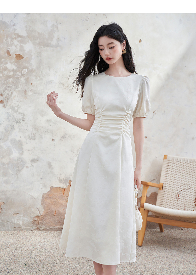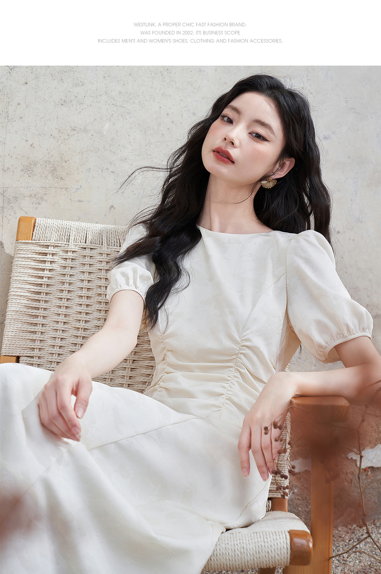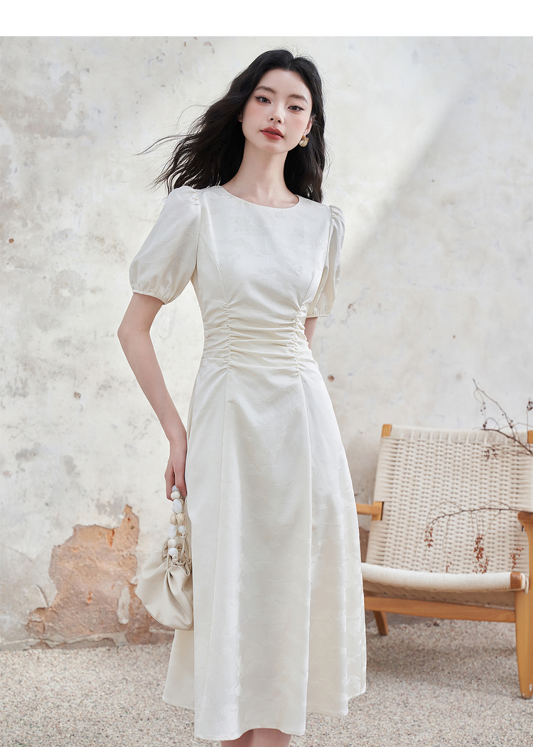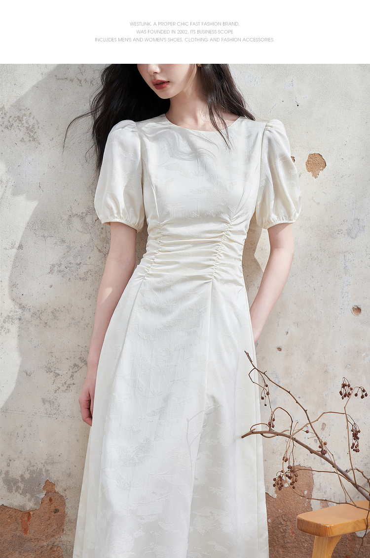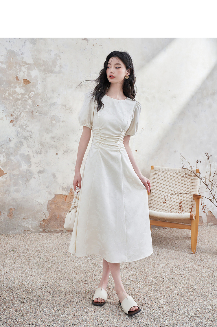 轻奢高级感气质优雅泡泡袖连衣裙女新款圆领收腰长裙V1040877