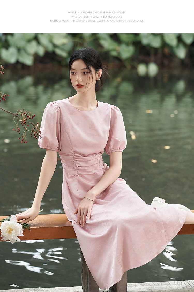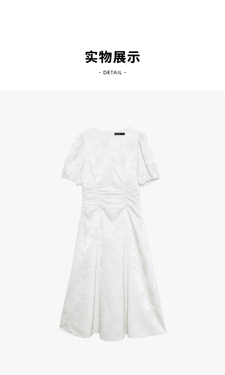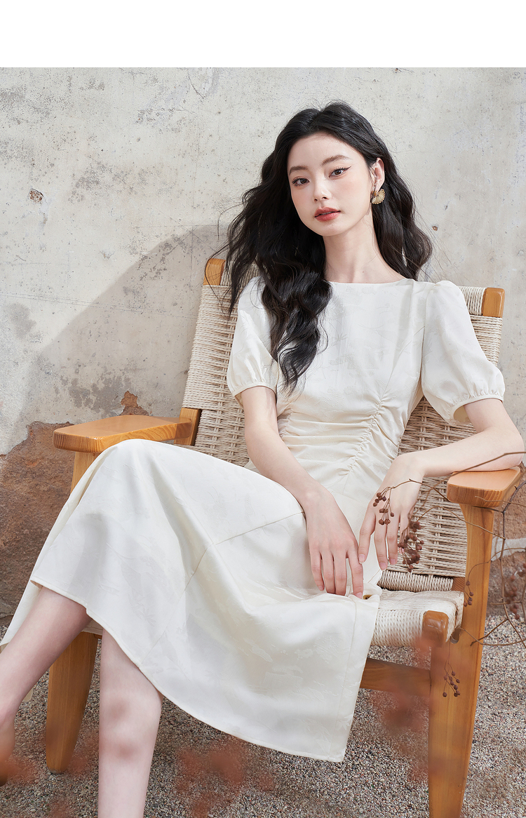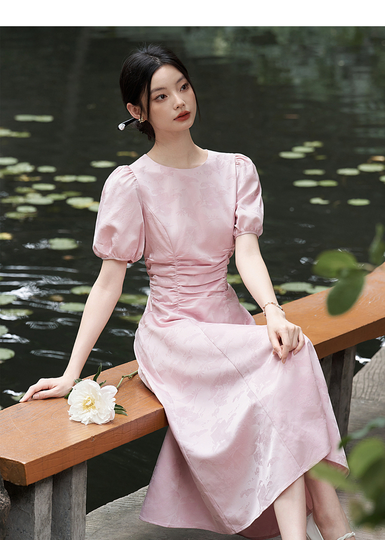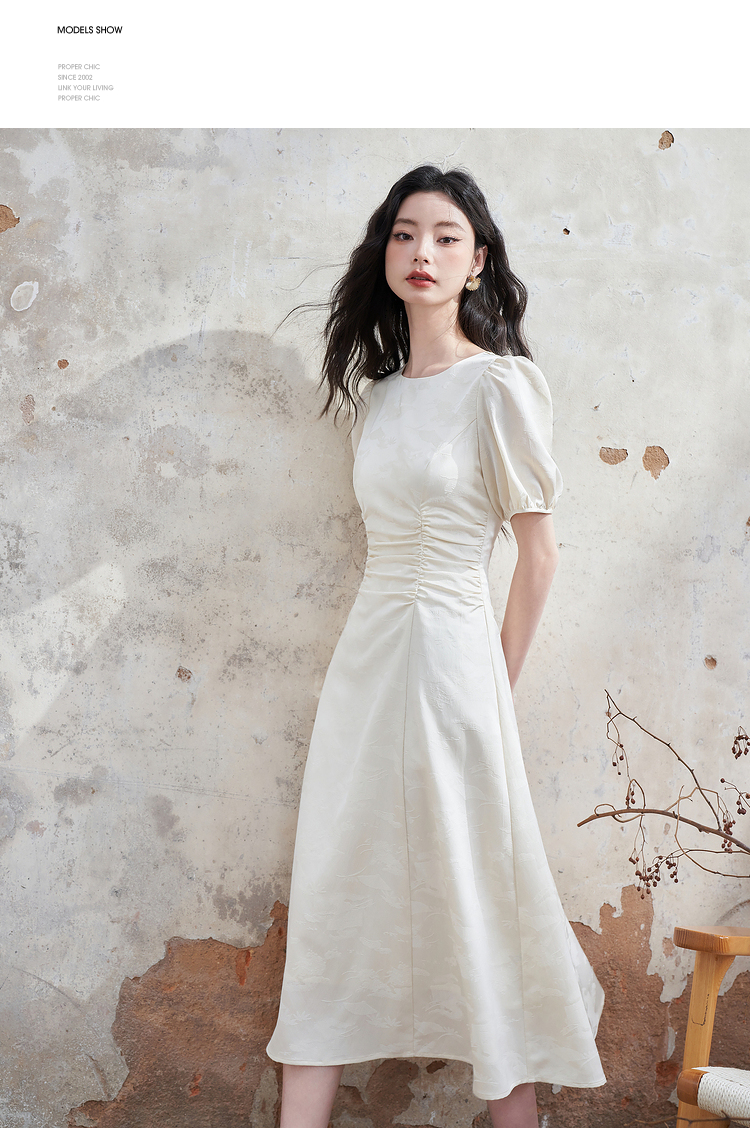 轻奢高级感气质优雅泡泡袖连衣裙女新款圆领收腰长裙V1040877