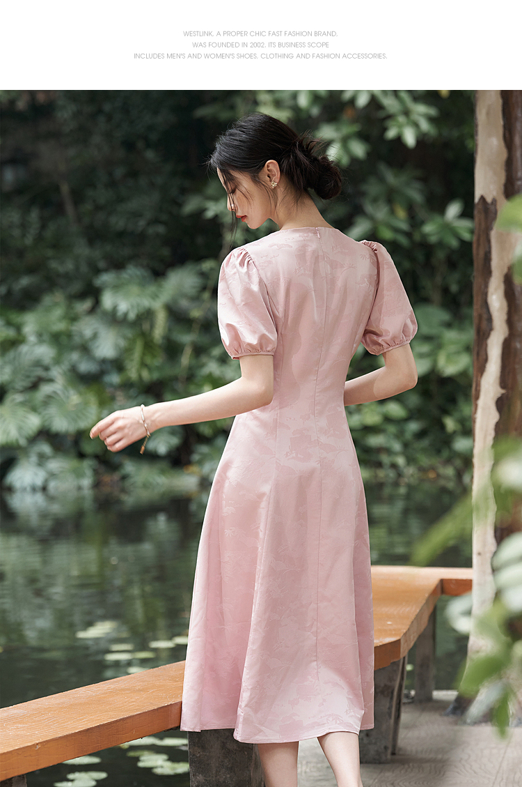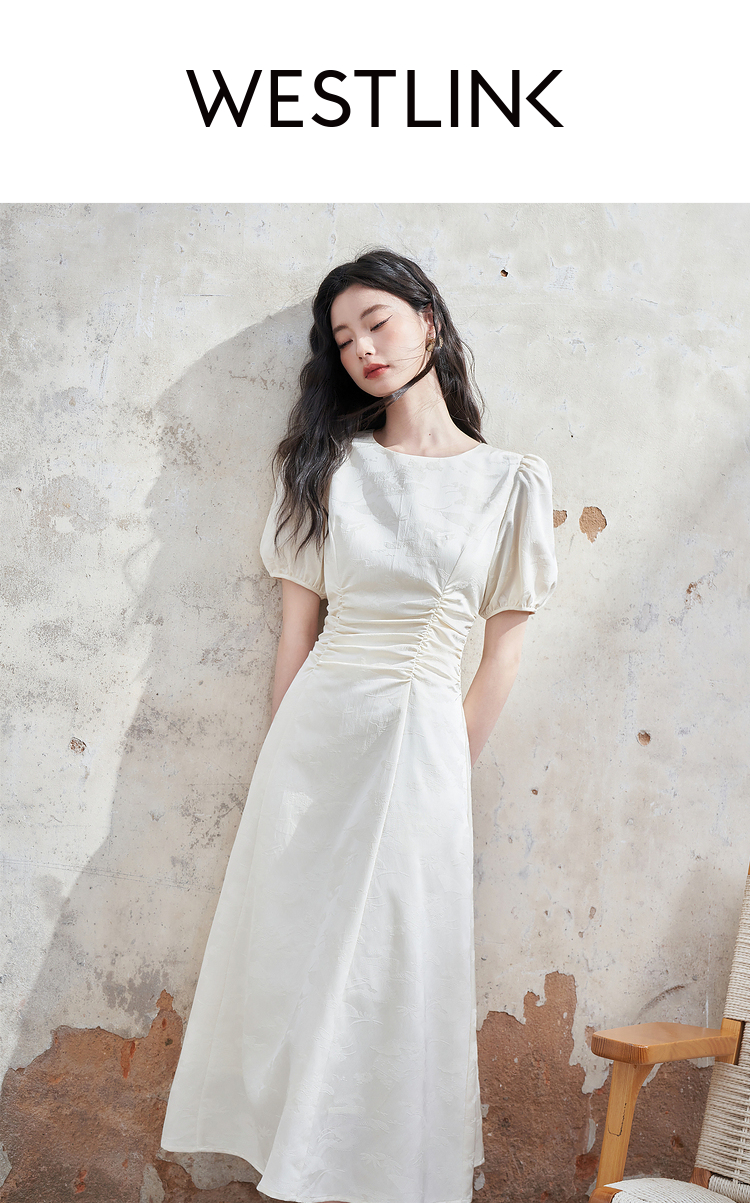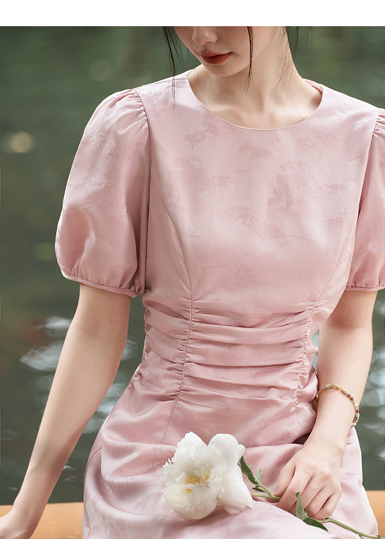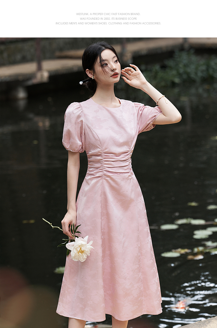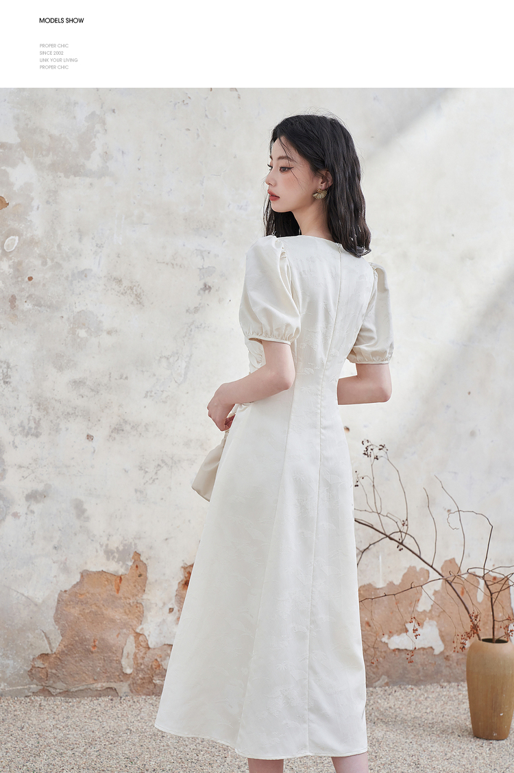 轻奢高级感气质优雅泡泡袖连衣裙女新款圆领收腰长裙V1040877