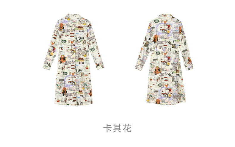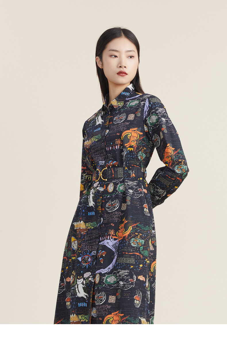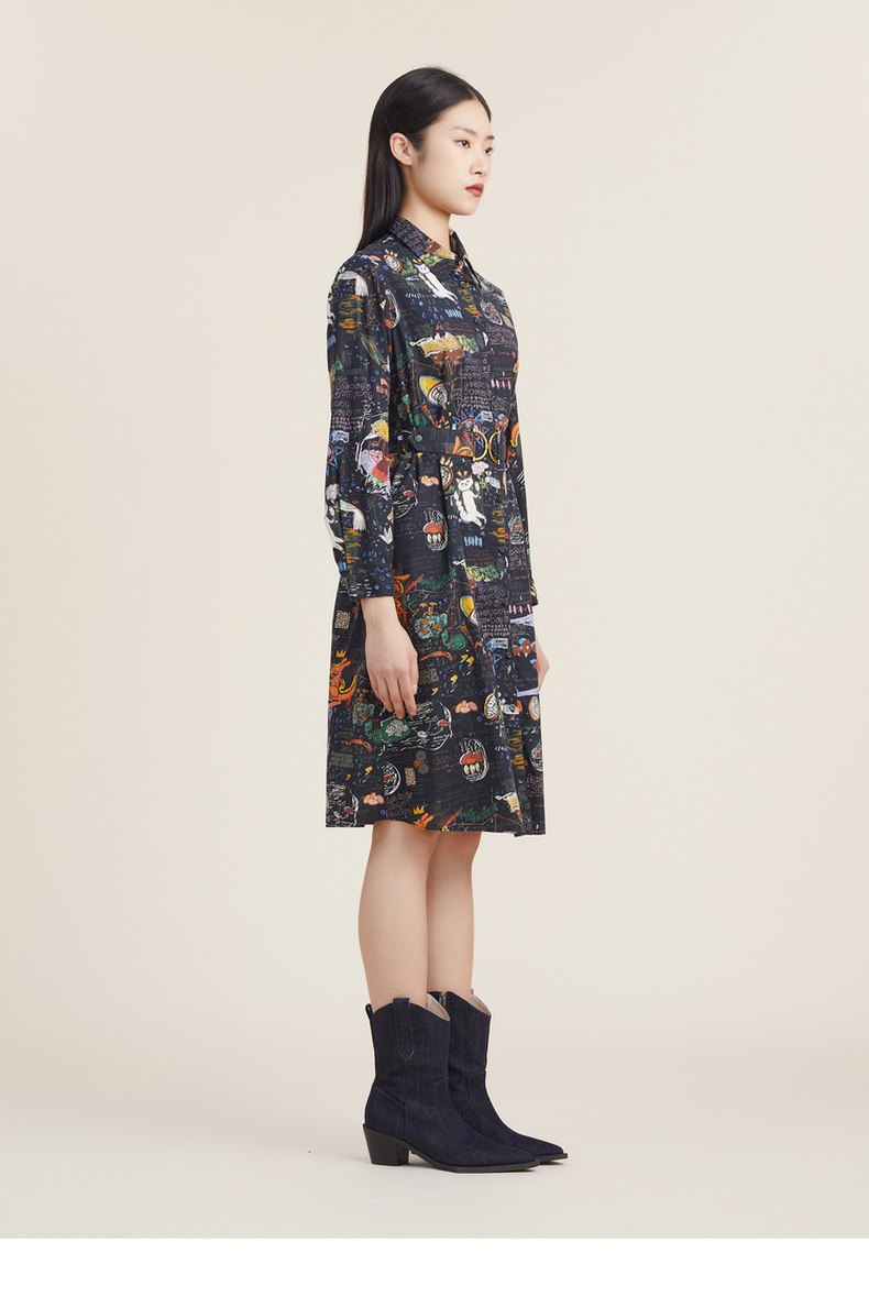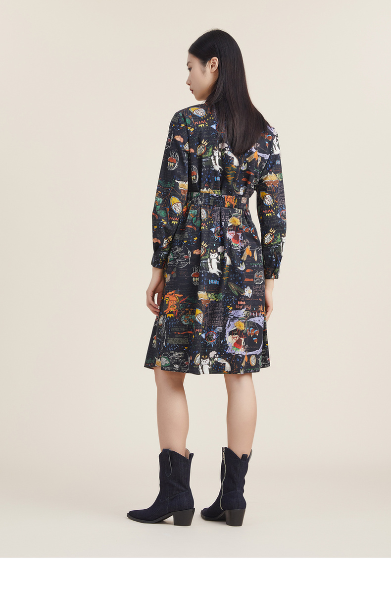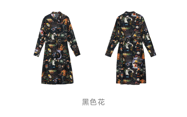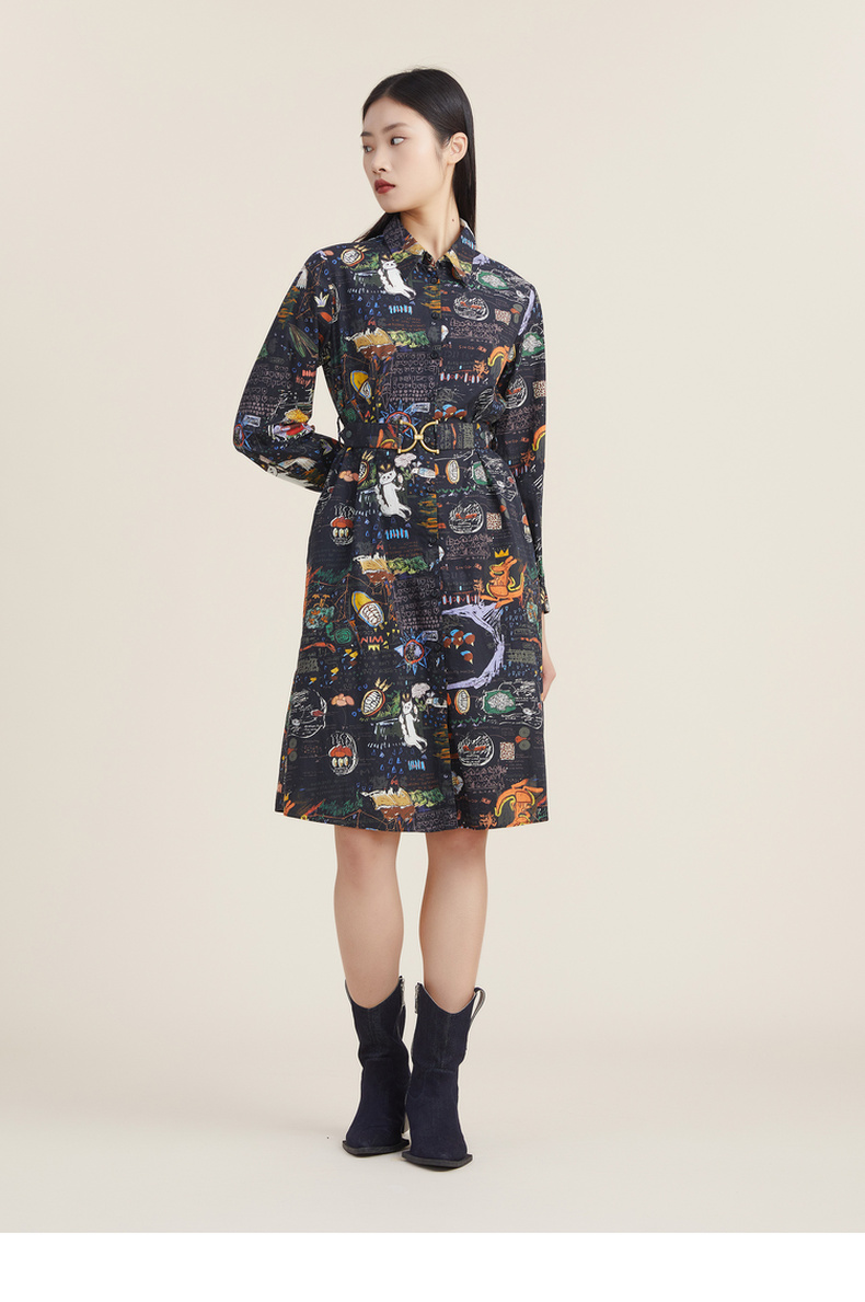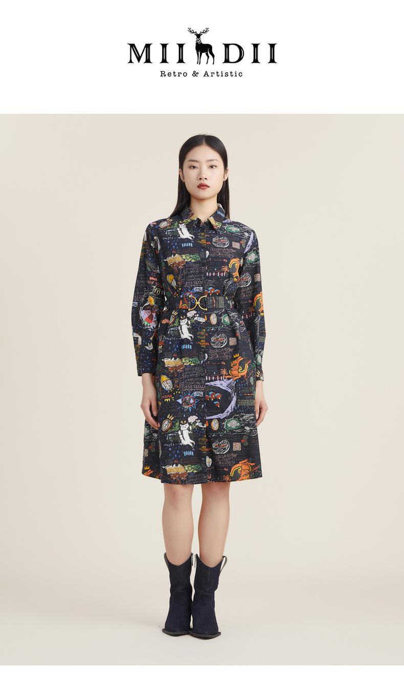 谜底2022秋新款复古趣味印花A型宽松中长款连衣裙长袖女223ML1124