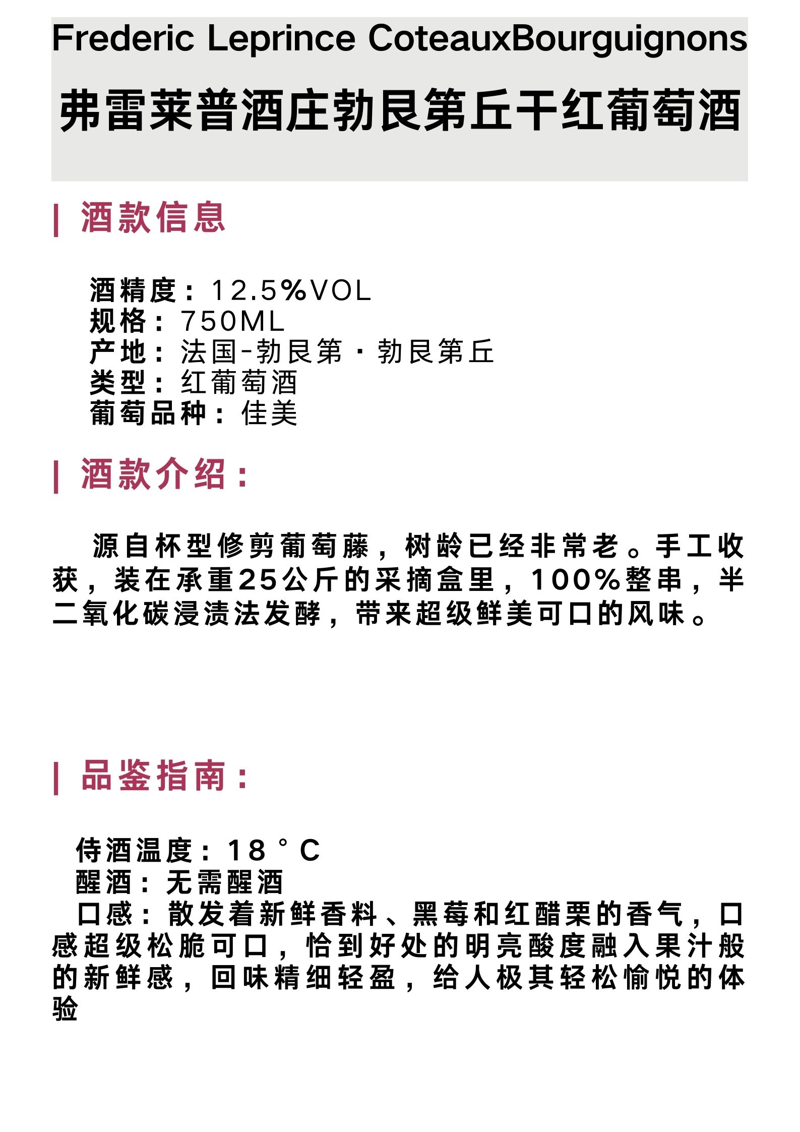 弗雷莱普酒庄勃艮第丘干红葡萄酒 Frederic Leprince Coteaux Bourguignons Rouge - 2021