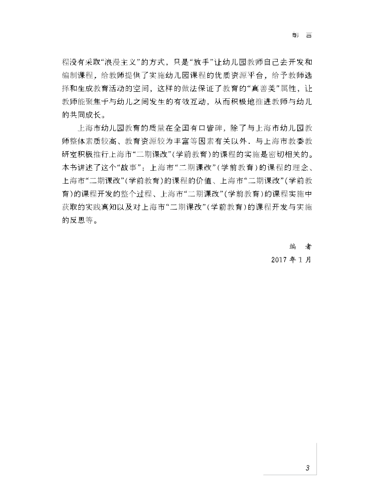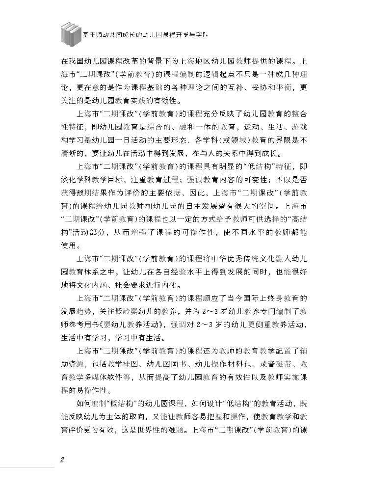 上海市“二期课程改革”(学前教育)的课程(简称《课程》)将《上海市学前教育纲要》中所强调的共同生活、探索世界和表现与表达作为主要的课程内容与要求,将注重幼儿活动的过程、注重幼儿已有的经验、注重幼儿在原有水平上的发展、注重幼儿在集体中的共同建构、注重幼儿园课程的园本化等作为《课程》开发、编制的要点。本书讲述了《课程》的理念、价值、开发的整个过程、实施中获取的实践真知以及对《课程》开发与实施的反思等方面的内容。