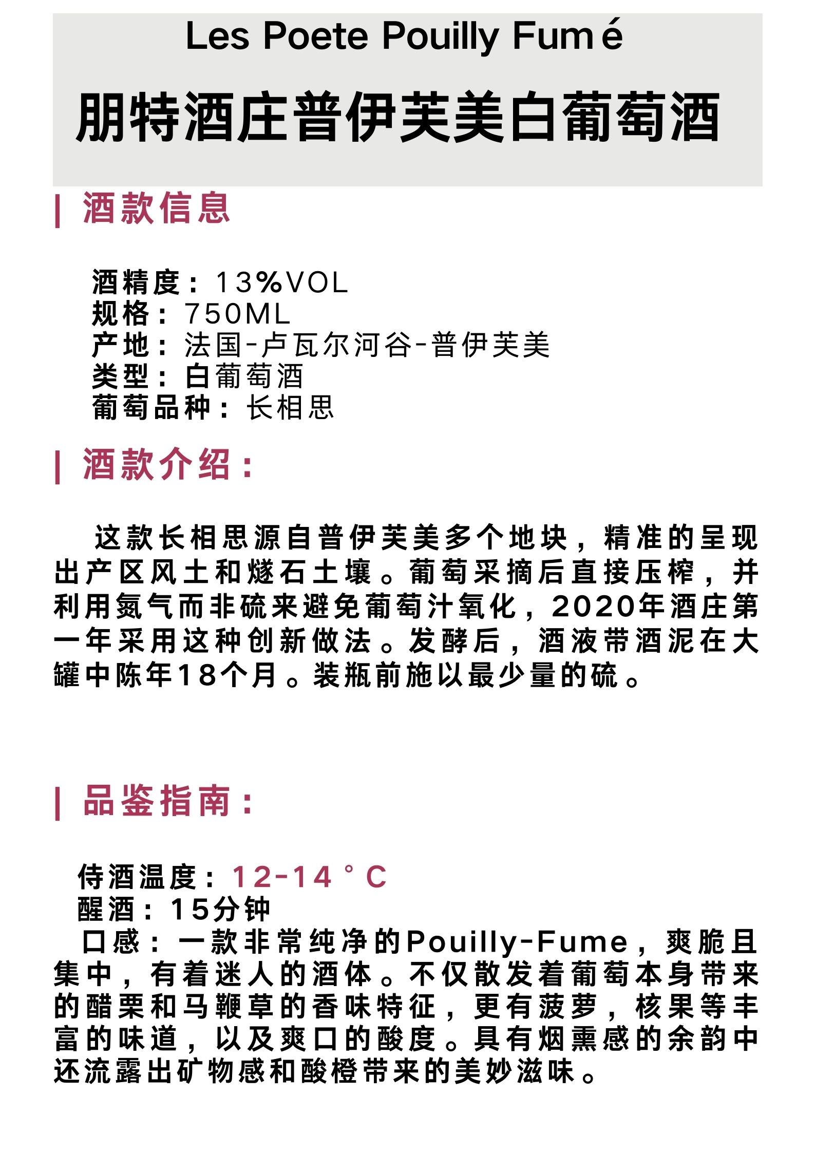 朋特酒庄普伊芙美白葡萄酒 Les Poete Pouilly Fumé