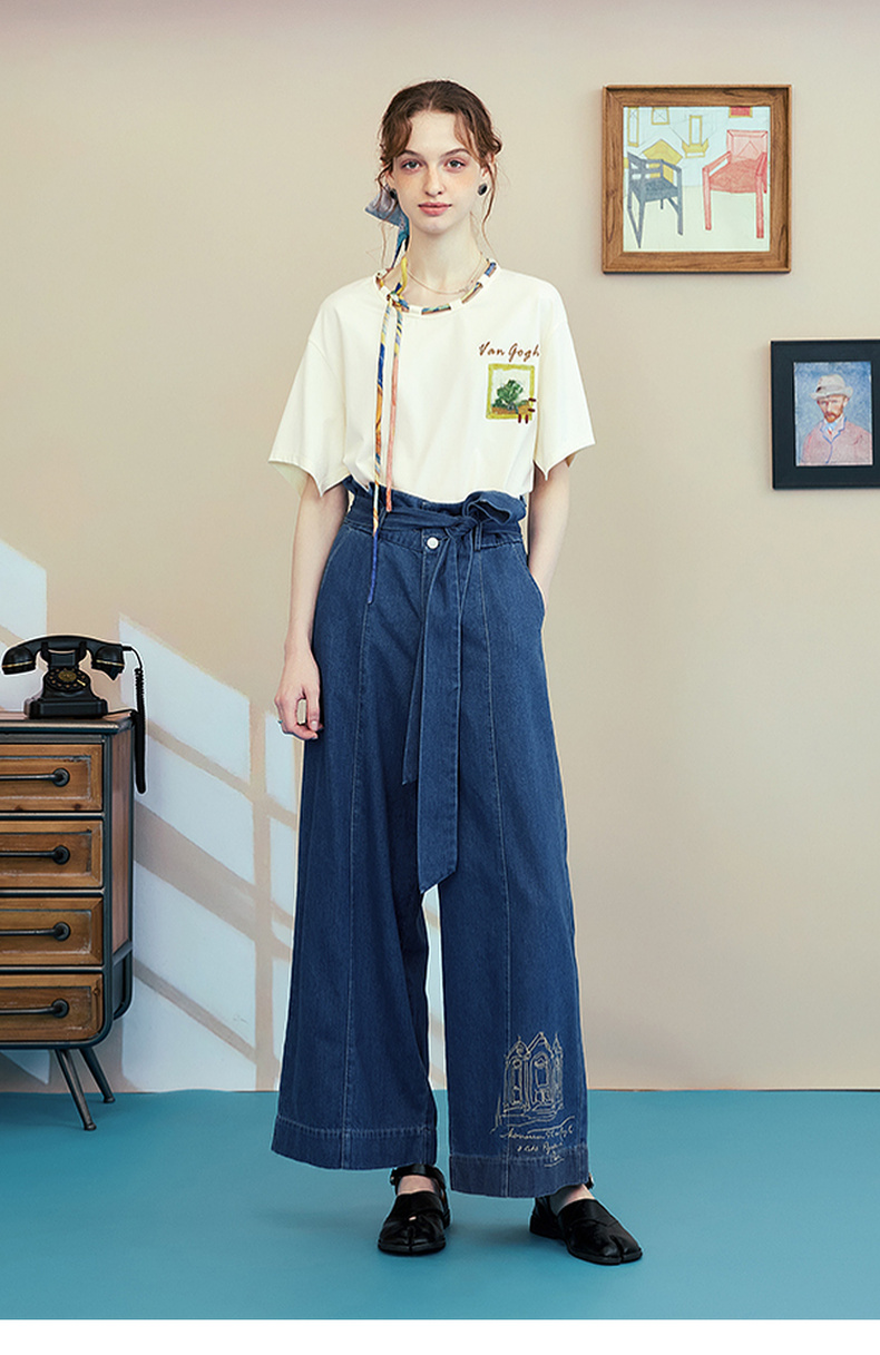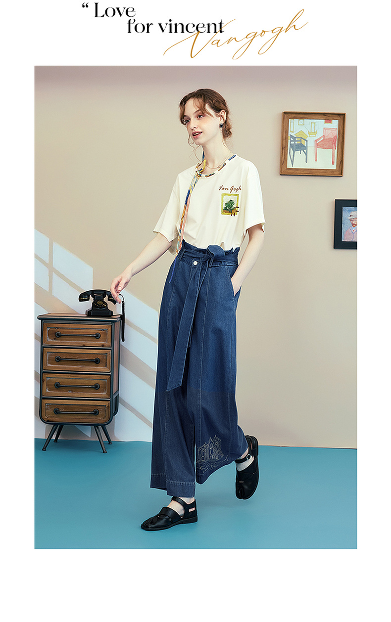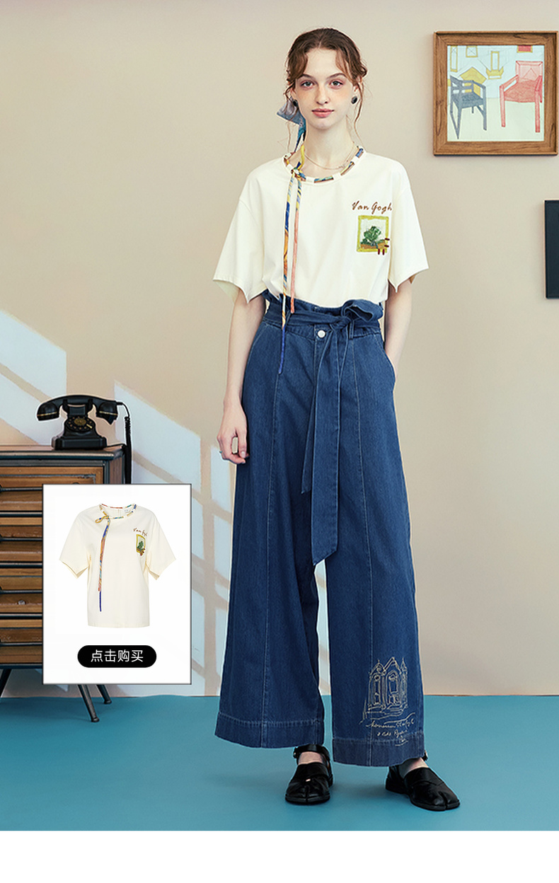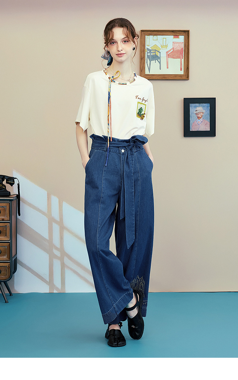 两三事梵高文艺万丈蜃楼2025夏新款复古刺绣绑带阔腿牛仔裤女宽松