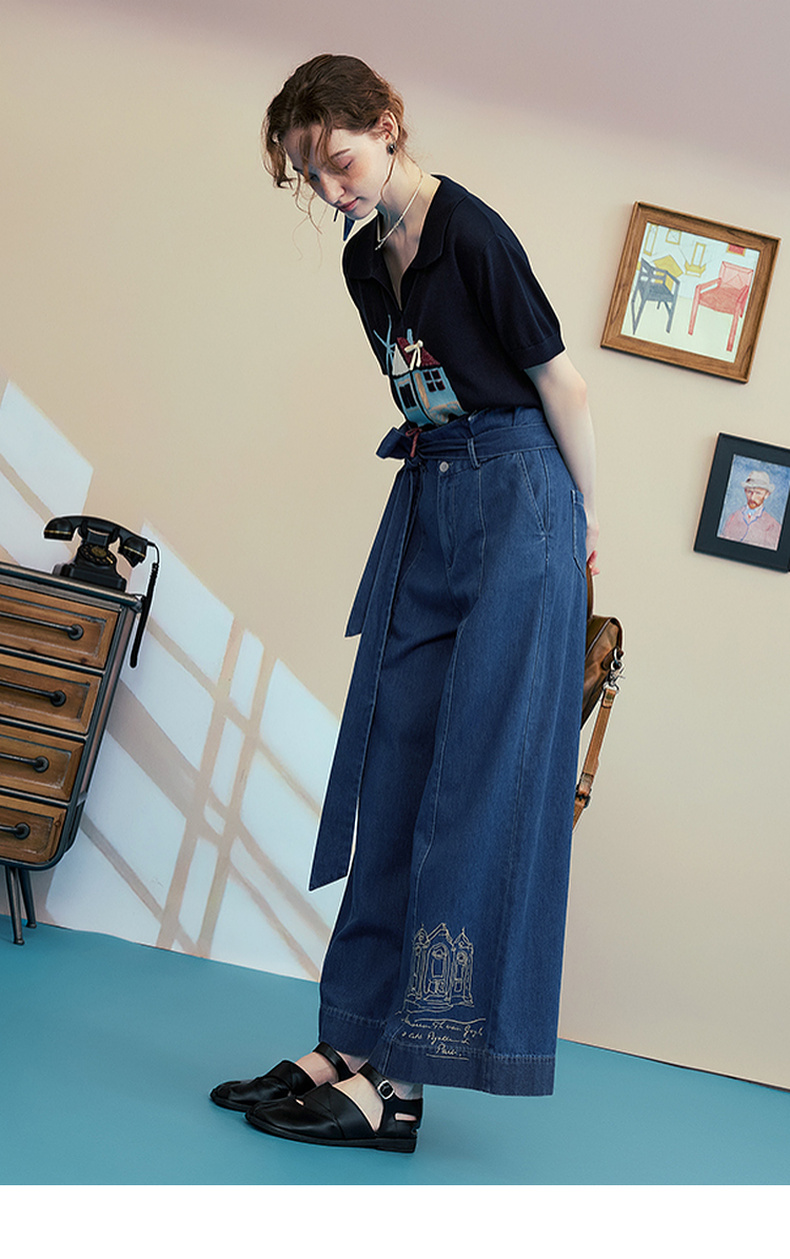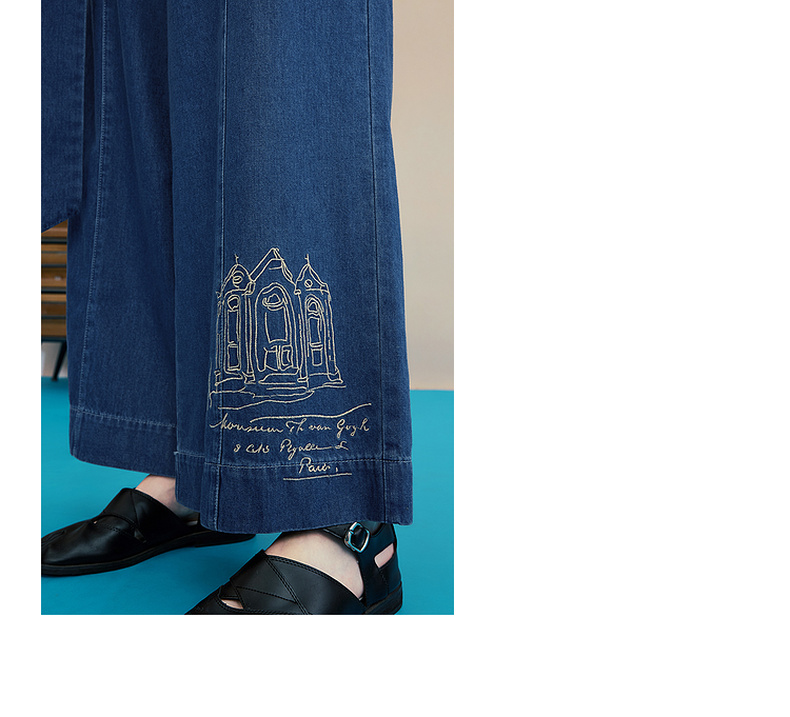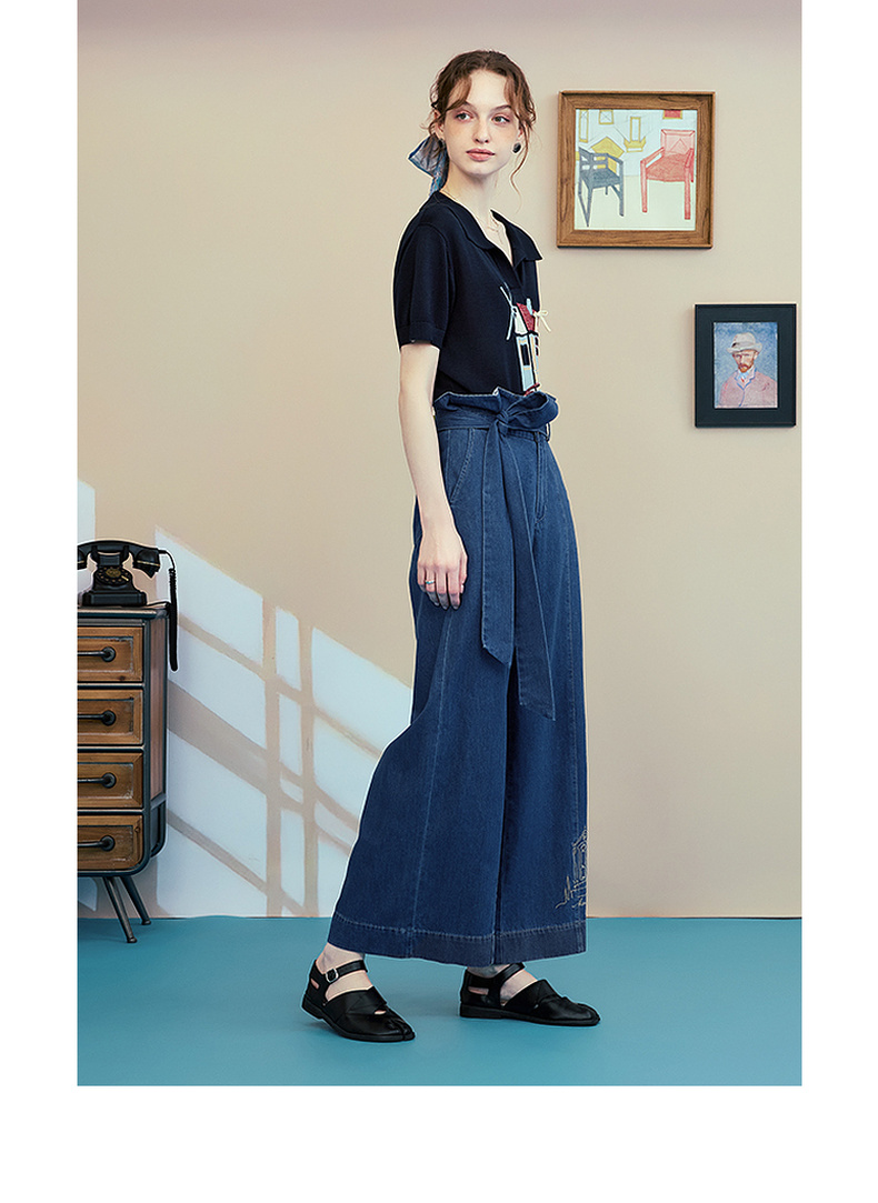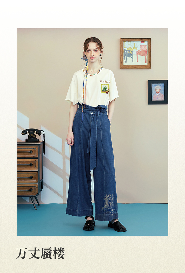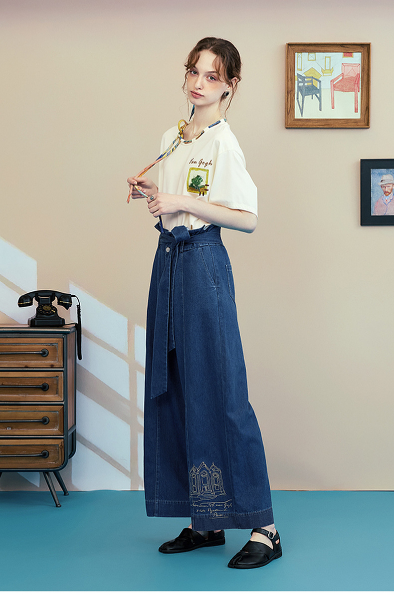 两三事梵高文艺万丈蜃楼2025夏新款复古刺绣绑带阔腿牛仔裤女宽松