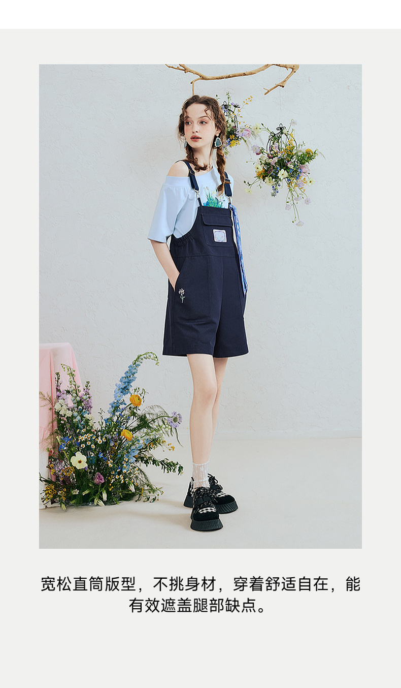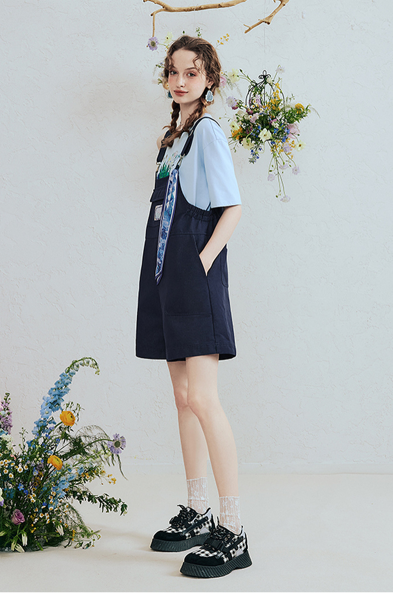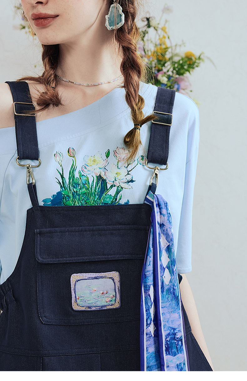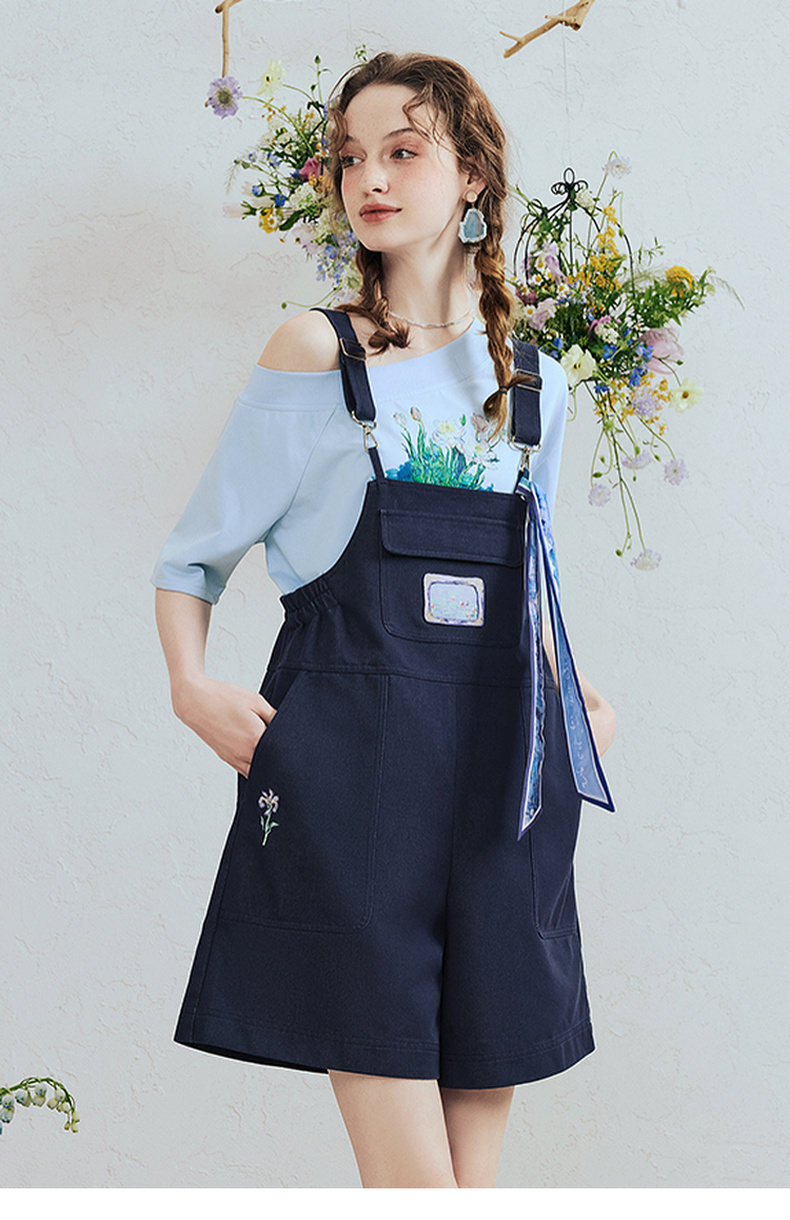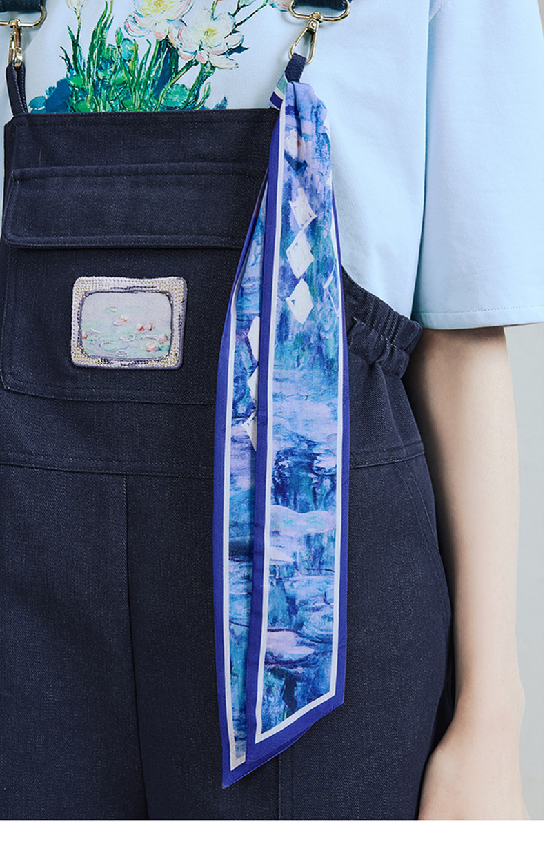 两三事 游牧童谣 2025夏季新款复古贴布绣丝巾装饰牛仔背带裤女
