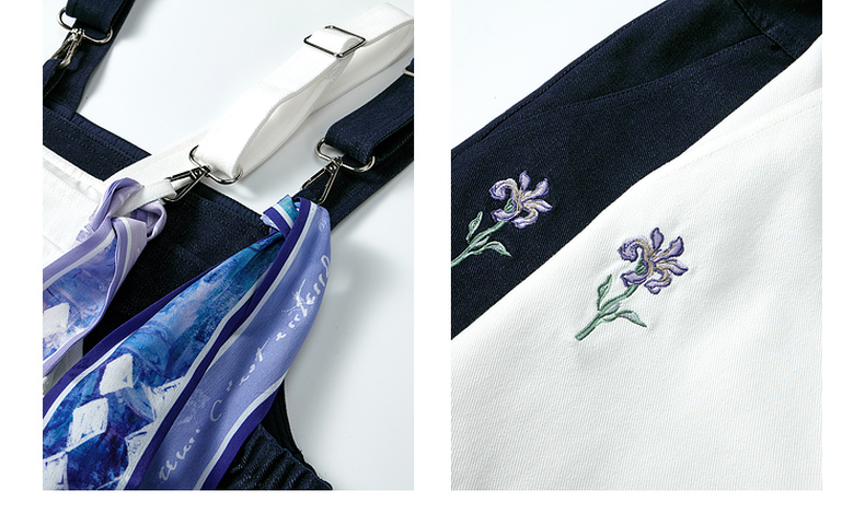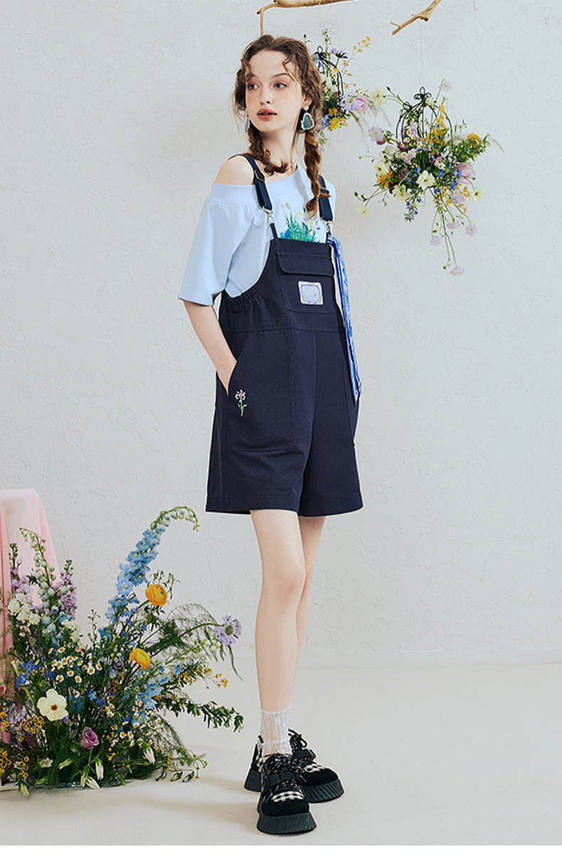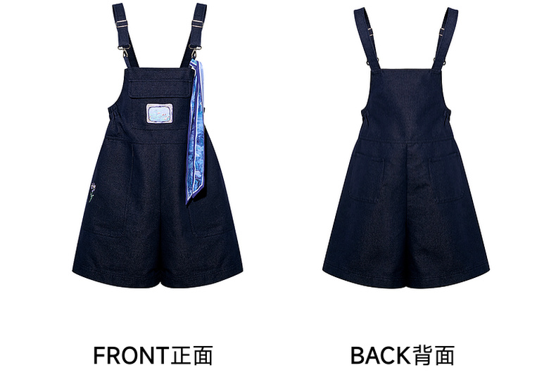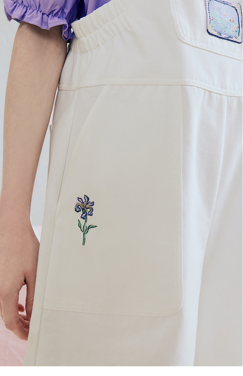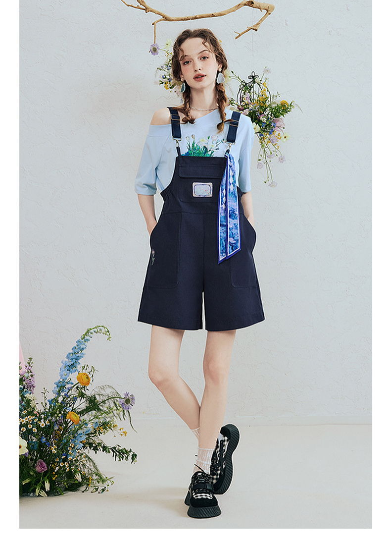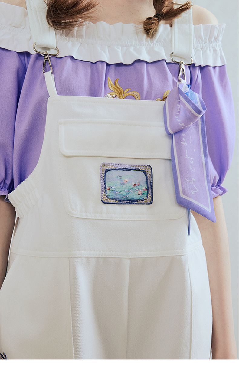 两三事 游牧童谣 2025夏季新款复古贴布绣丝巾装饰牛仔背带裤女