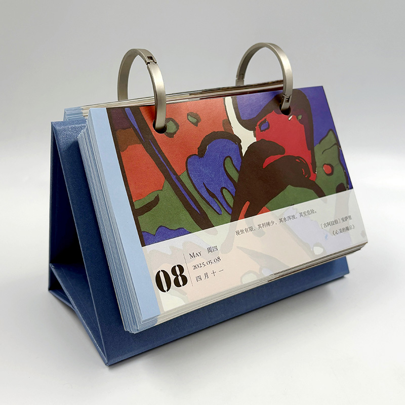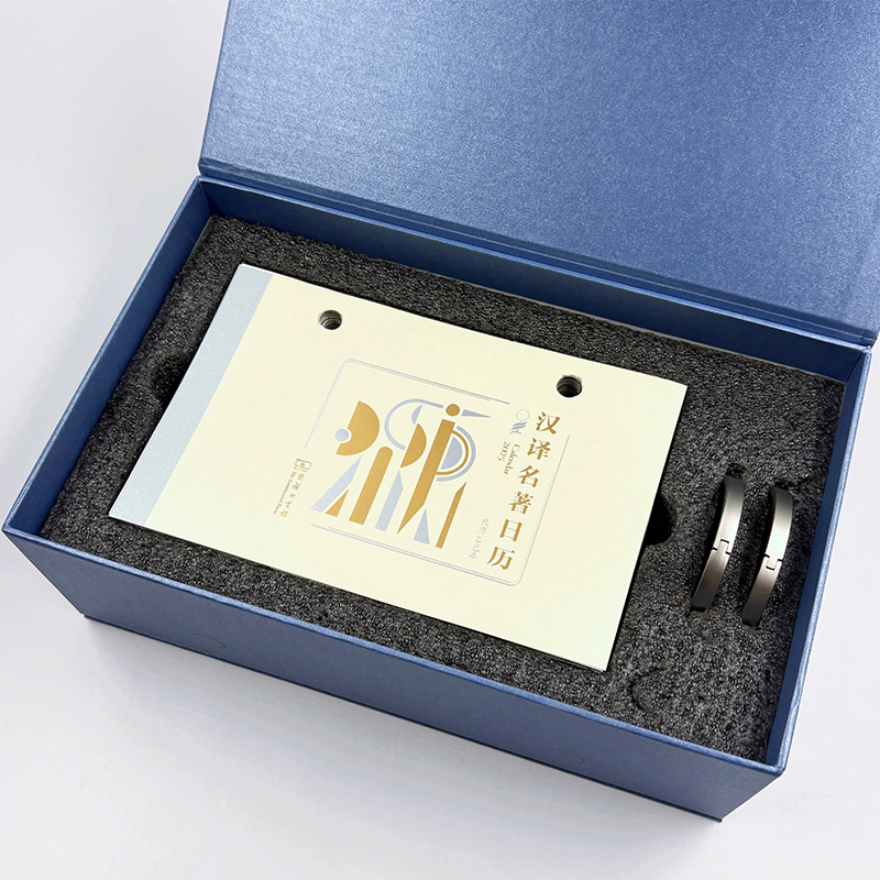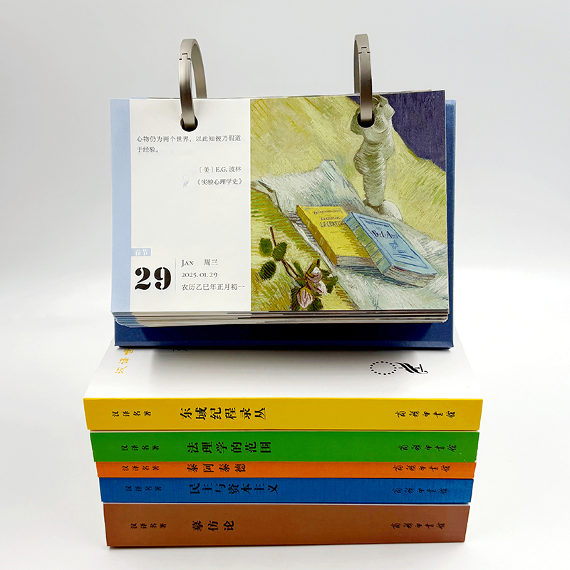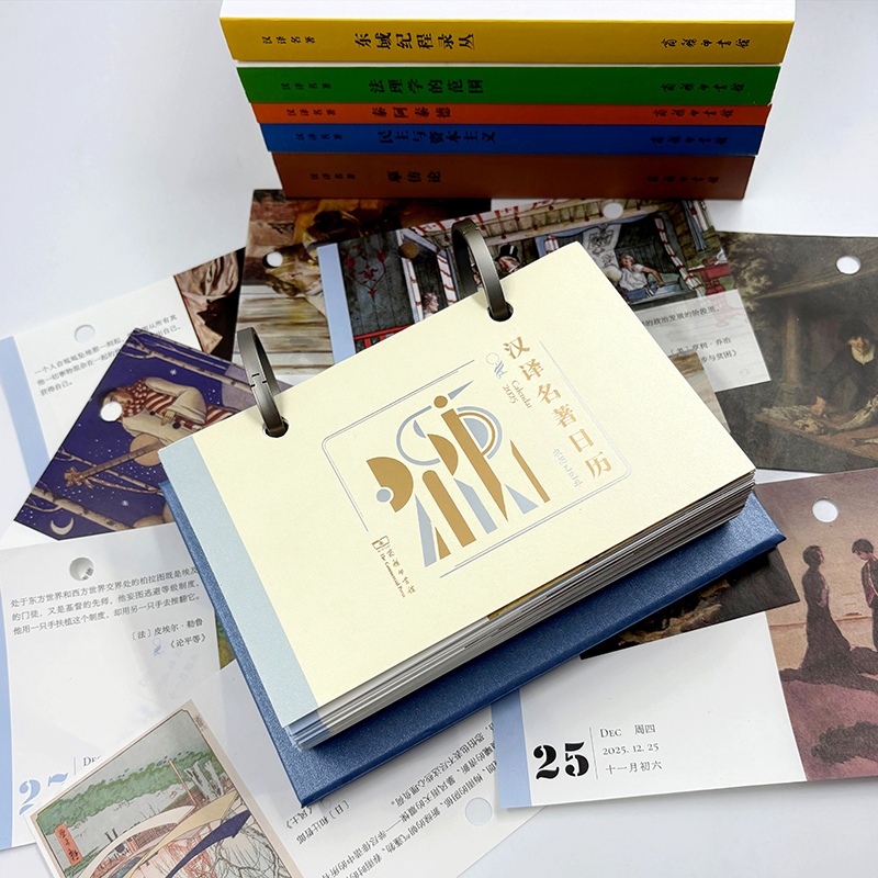 今年汉译名著日历采取横版双环样式,图文位置进行了全新调整,内文色条统一放在右侧,便于打孔穿环。横图采用整铺方式,用纸哑光樱花,最大程度还原了图片的色彩和质地。外包装盒继去年将绿色作为主色后,今年采用珠光蓝色,每年呼应汉译名著彩虹墙的一种分类颜色,同时搭配烫金烫银工艺,并以变形数字呈现2025,整体造型清新雅致。