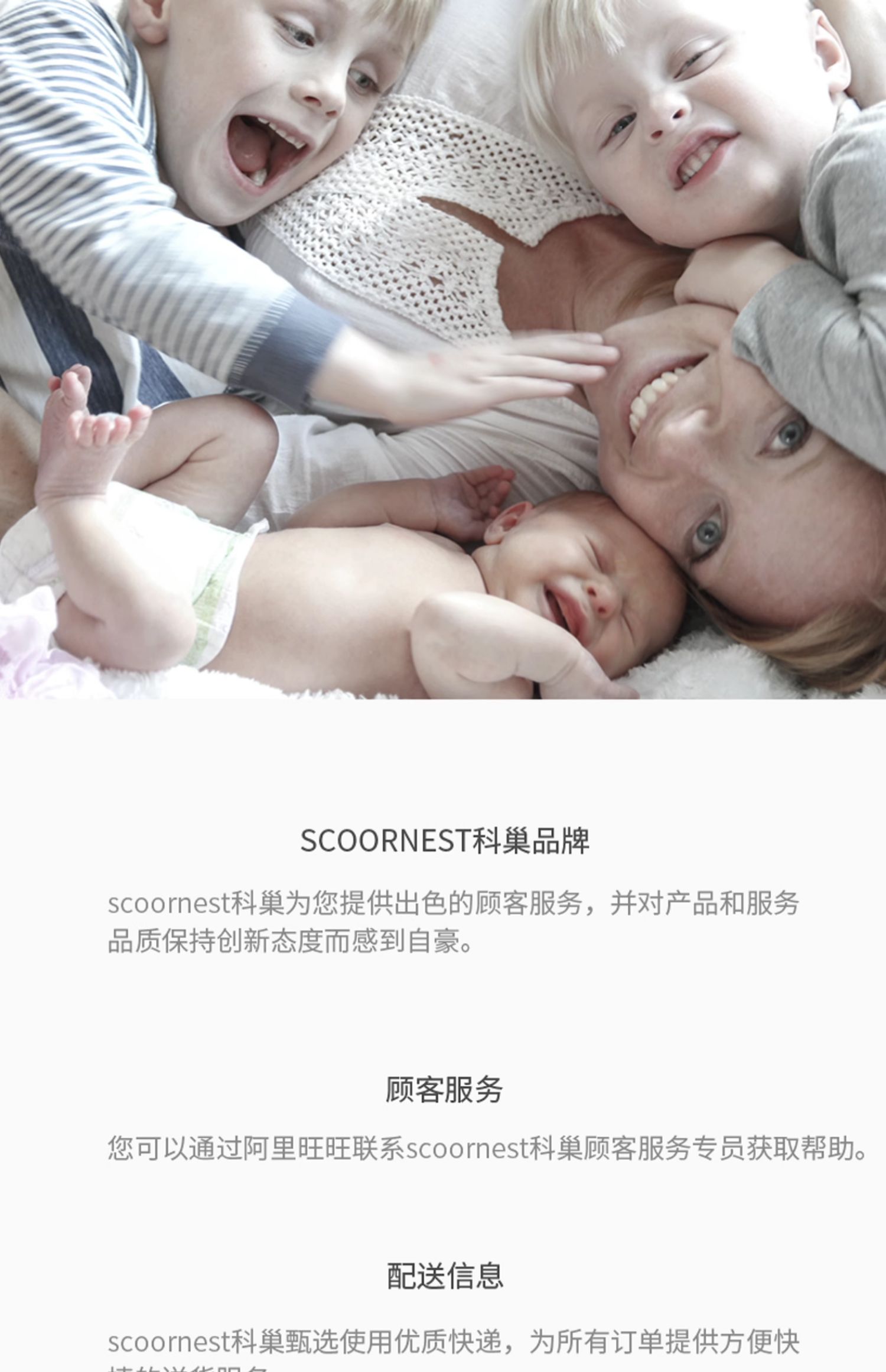 - Scoornest始终秉承给每一位宝宝送去科学的、关心的、创新的成长体验,通过提供商品和服务,使顾客形成守护、发展、巩固这种弥足珍贵的亲情的爱。