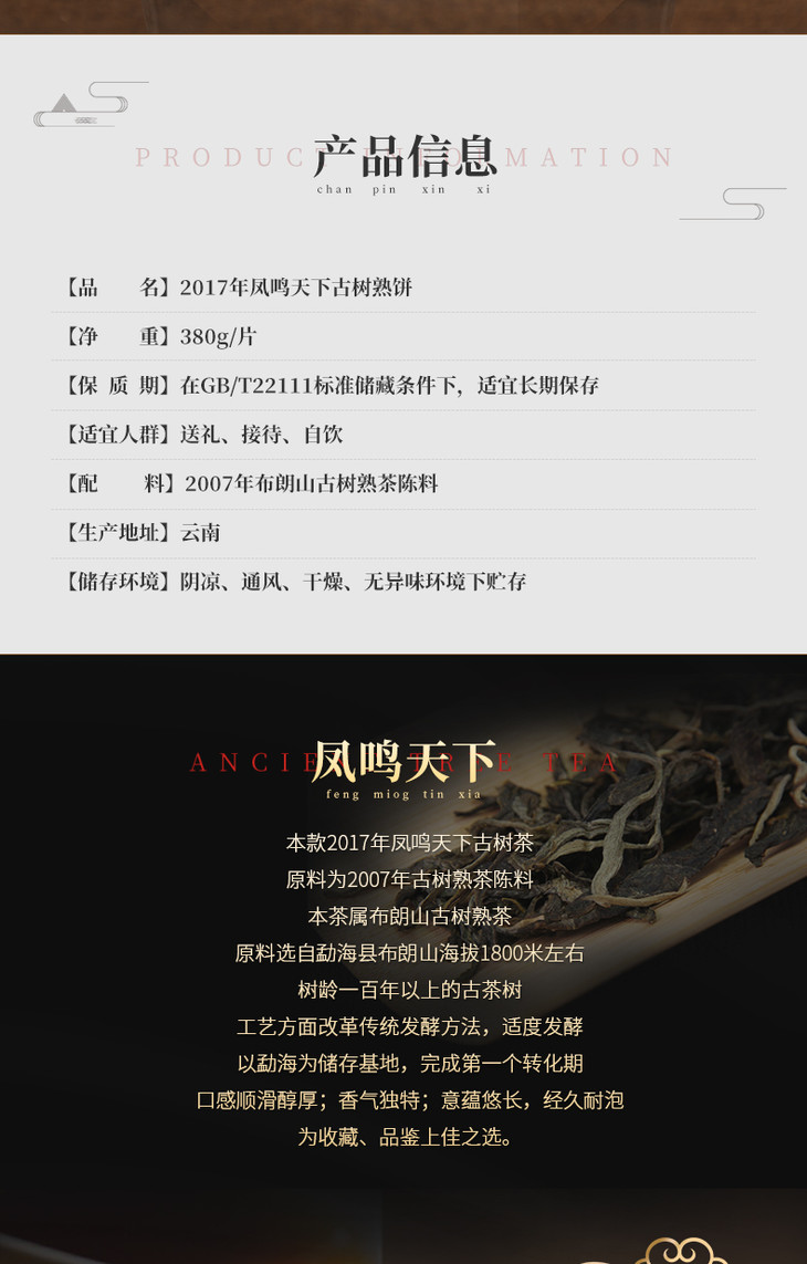 【天月古树茶】2017年凤鸣天下古树普洱茶熟饼 380g