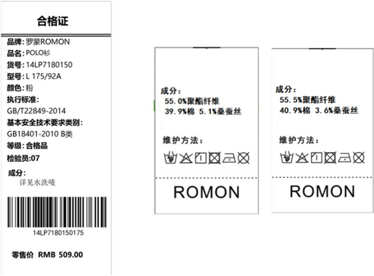面料:批次1:55.0%聚酯纤维 39.9%棉 5.1%桑蚕丝;批次2:55.5%聚酯纤维 40.9%棉 3.6%桑蚕丝