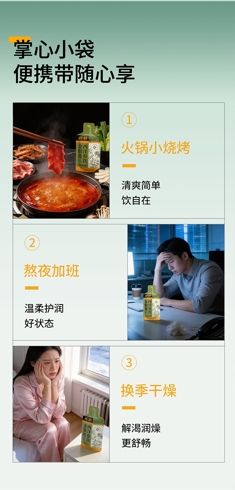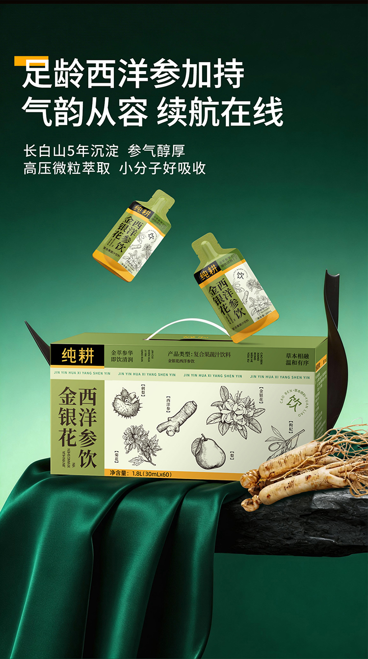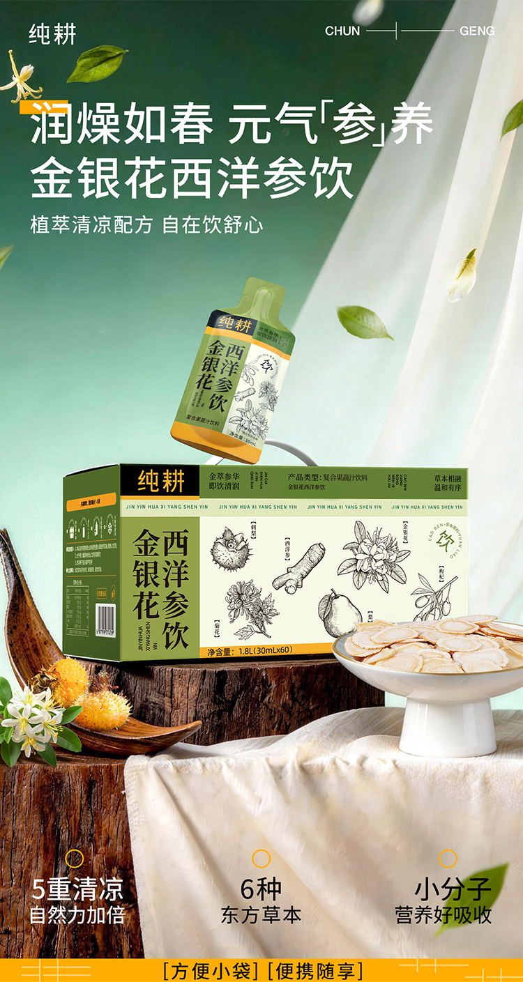 纯耕1.8L(60袋)量贩装金银花西洋参饮;金银花、菊花、雪梨,刺梨、枸杞、西洋参,怕上火喝;清凉爽口,凉茶饮料,植萃清凉