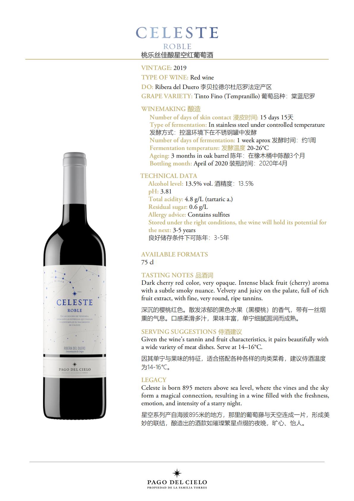 桃乐丝佳酿星空红葡萄酒 Familia Torres Pago del Cielo Celeste Roble,Ribera del Duero DO