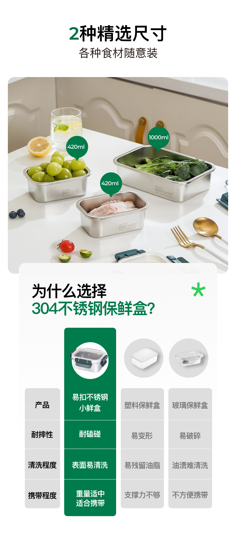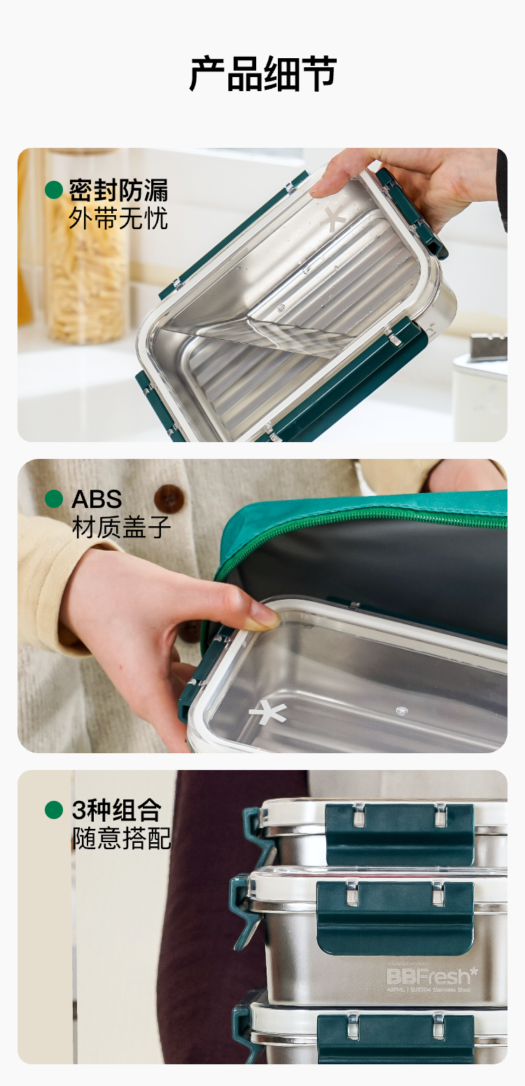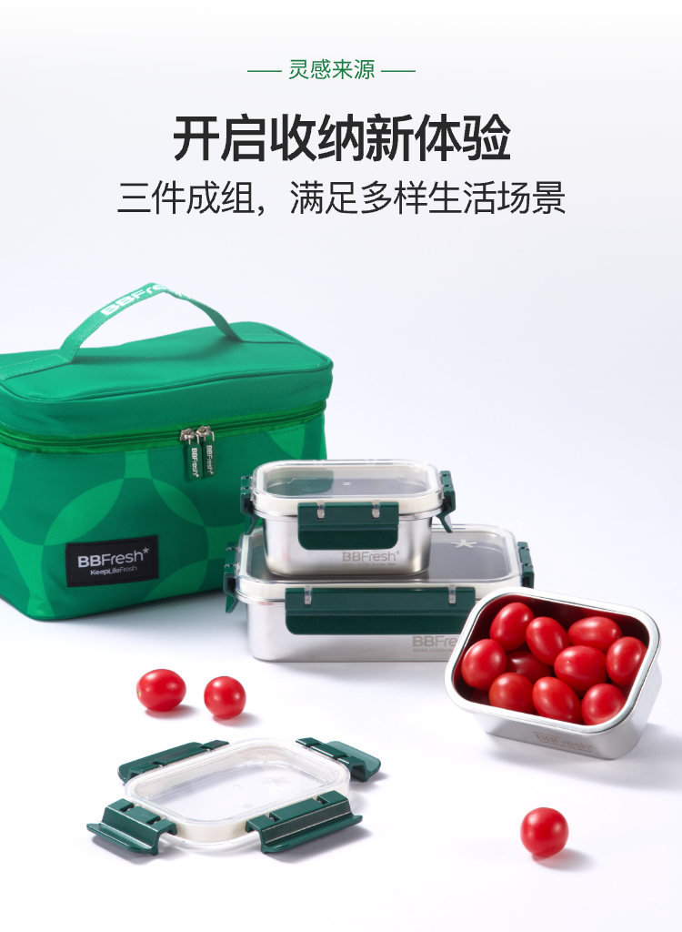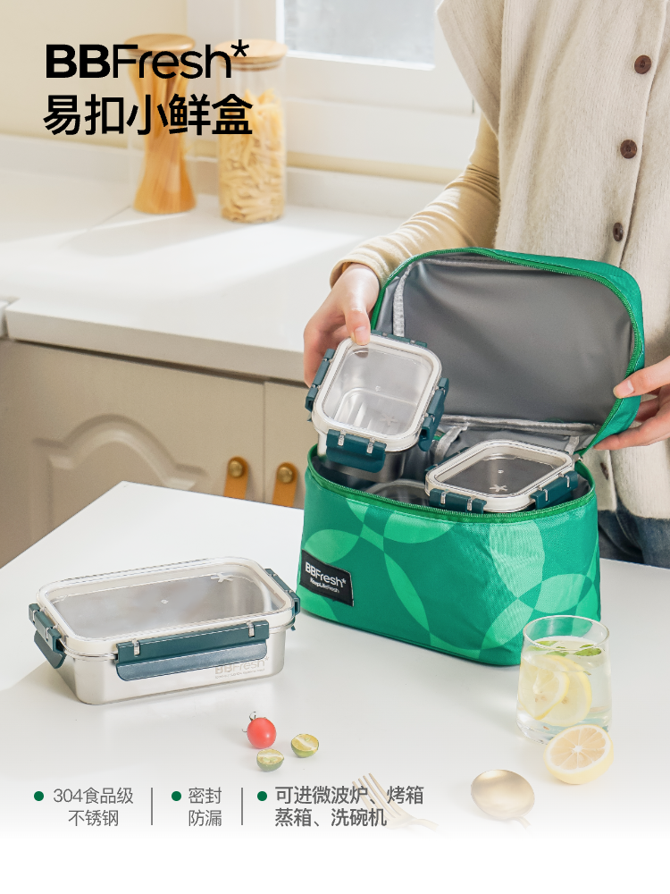 BBFresh宝得鲜304不锈钢易扣小鲜盒3件套,可冷藏可冷冻可进微波炉、烤箱、蒸箱、洗碗机