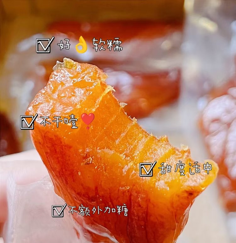 ✔富有嚼劲:尽管红薯干软糯,但它仍然保留了一定的韧性和嚼劲。这种嚼劲不是生硬难嚼,而是恰到好处,让人在咀嚼过程中能够充分感受到红薯干的质感,增加了食用的乐趣