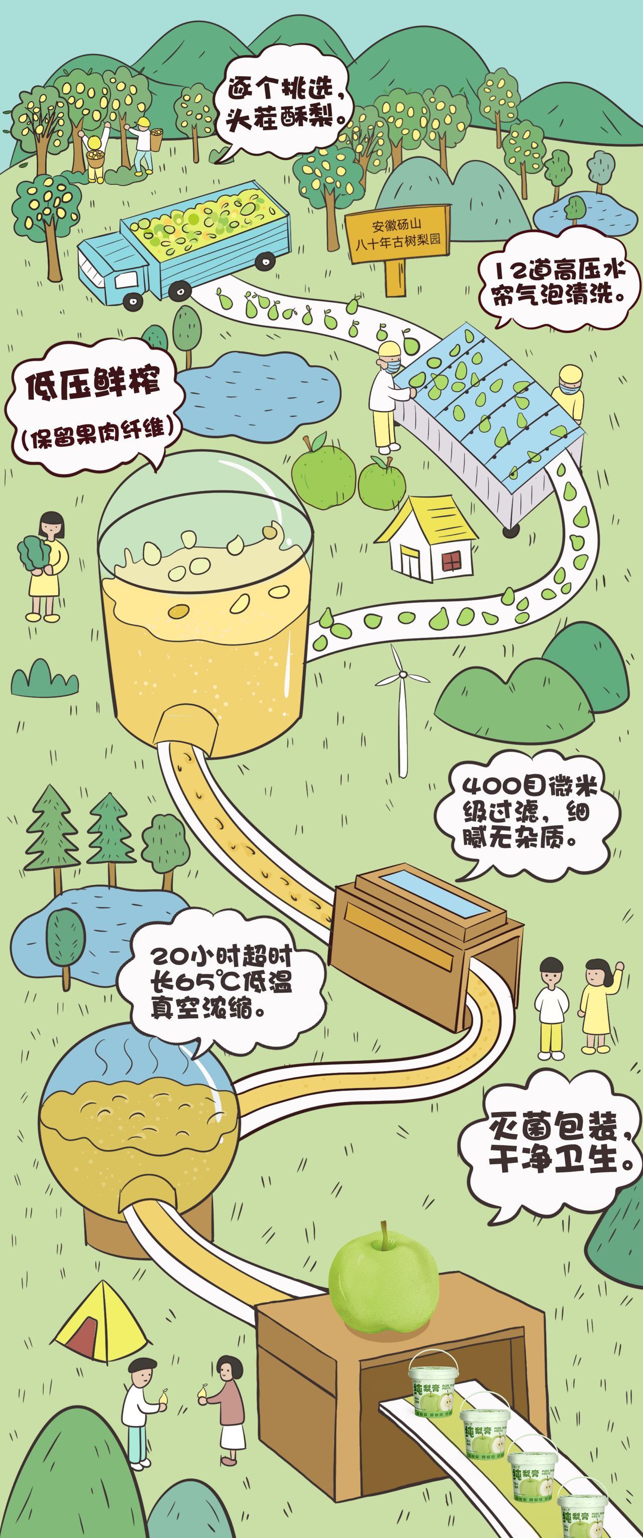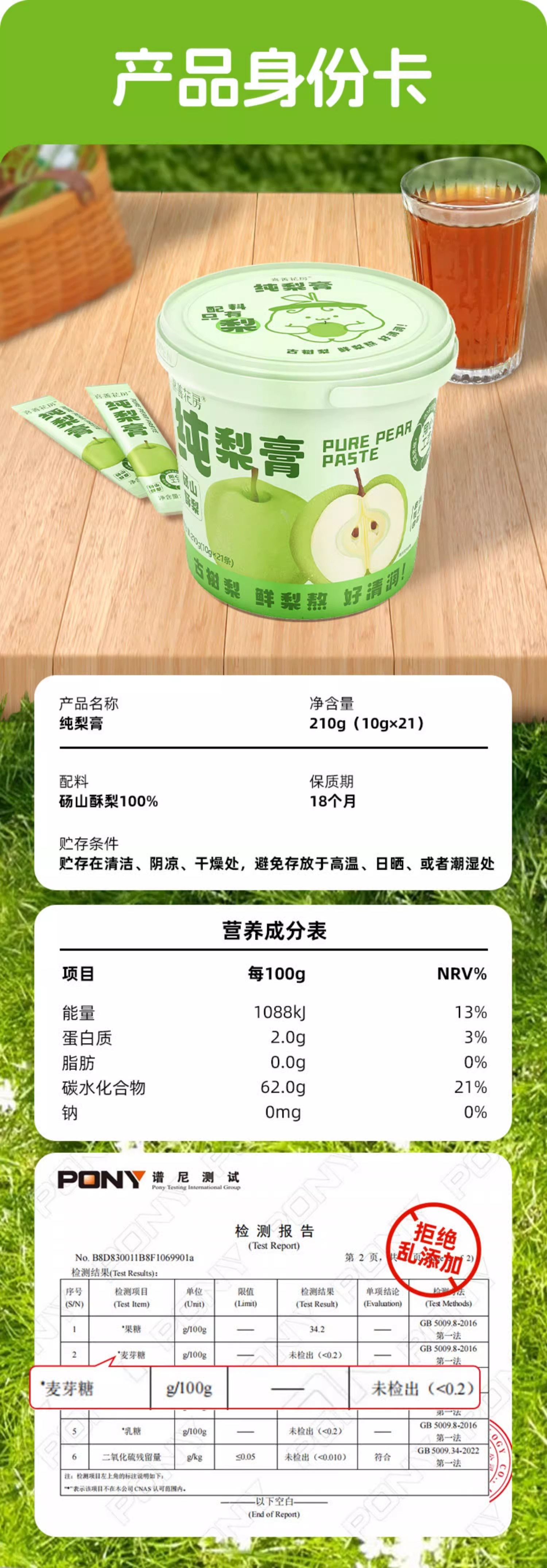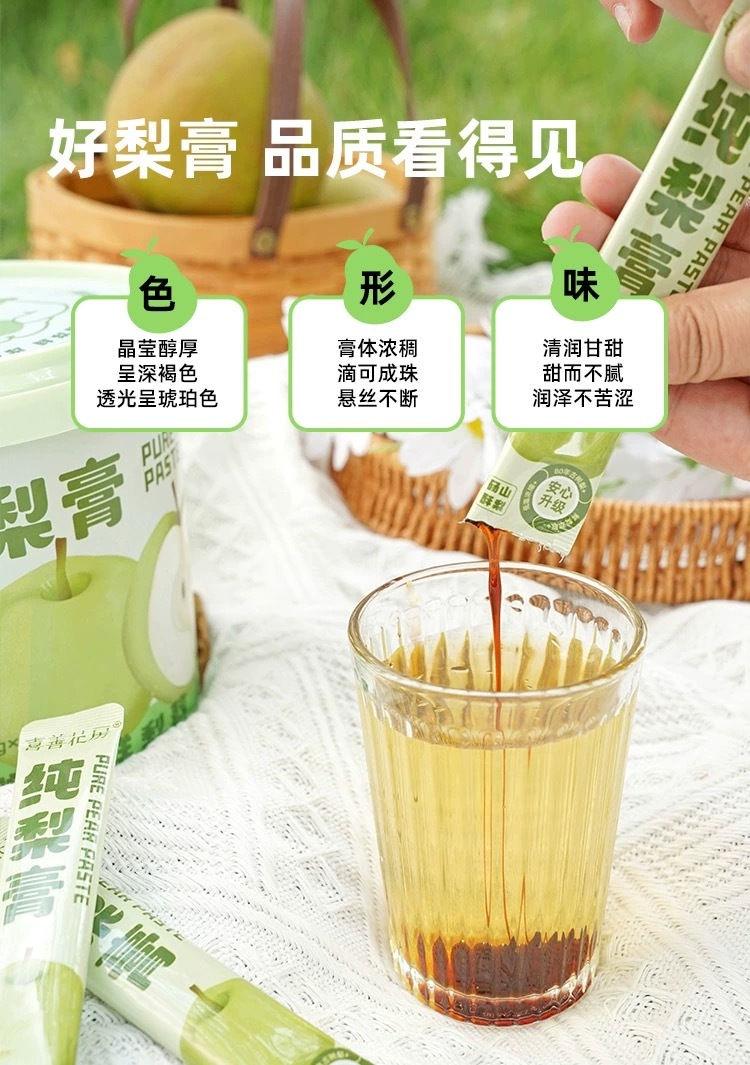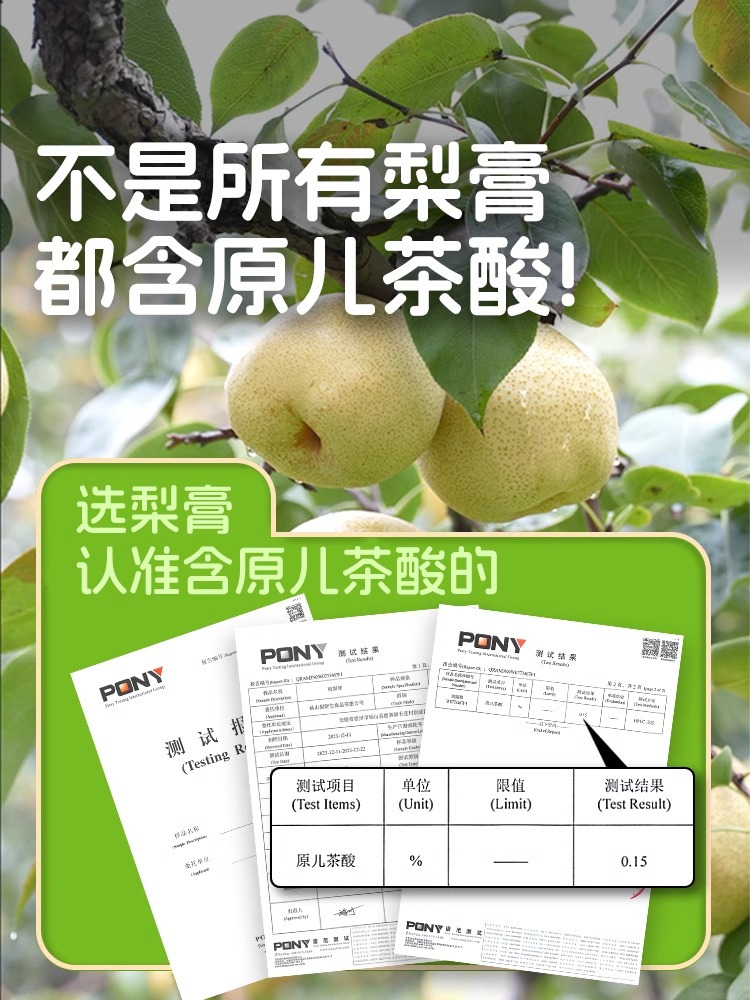 通过431项农残检测,生产工厂建立在梨园内,用最短的时间完成采摘到熬煮,保障新鲜度。