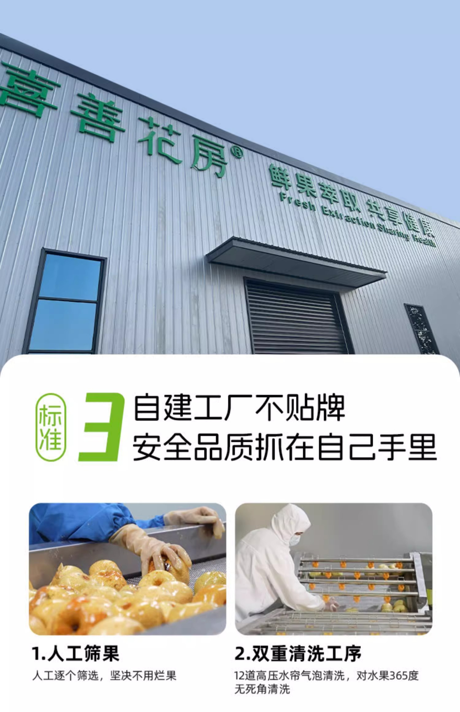 安全品质抓在自己手上,人工逐个筛选,坚决不用烂果。双重清洗工序,360°无死角清洁。